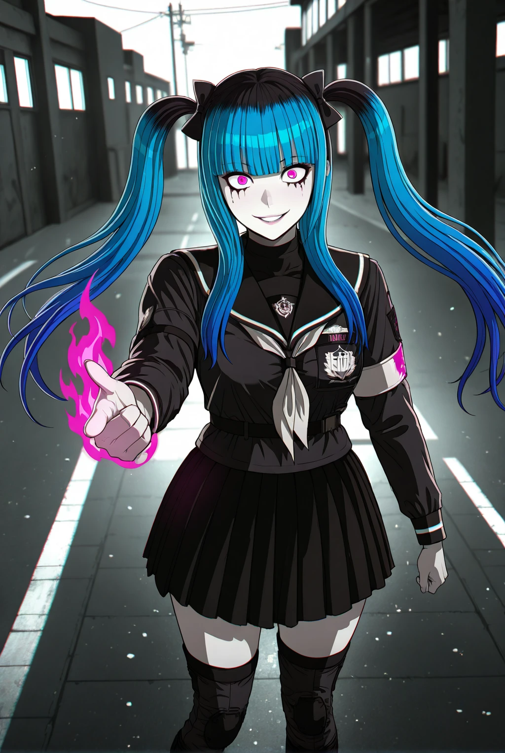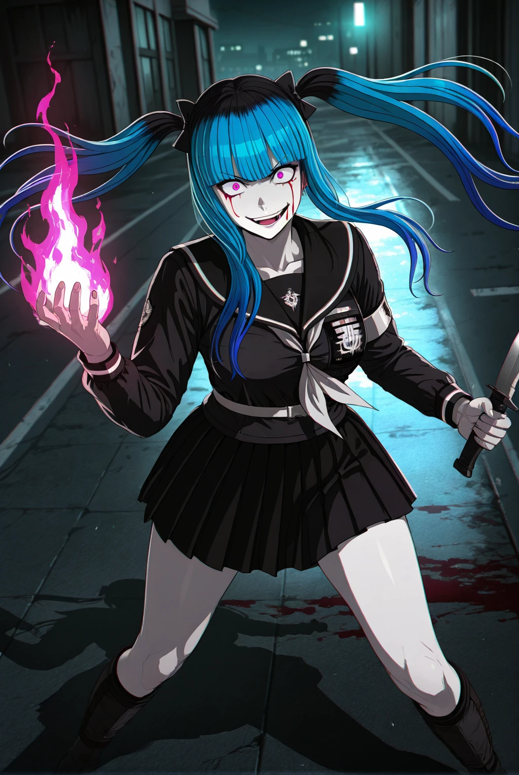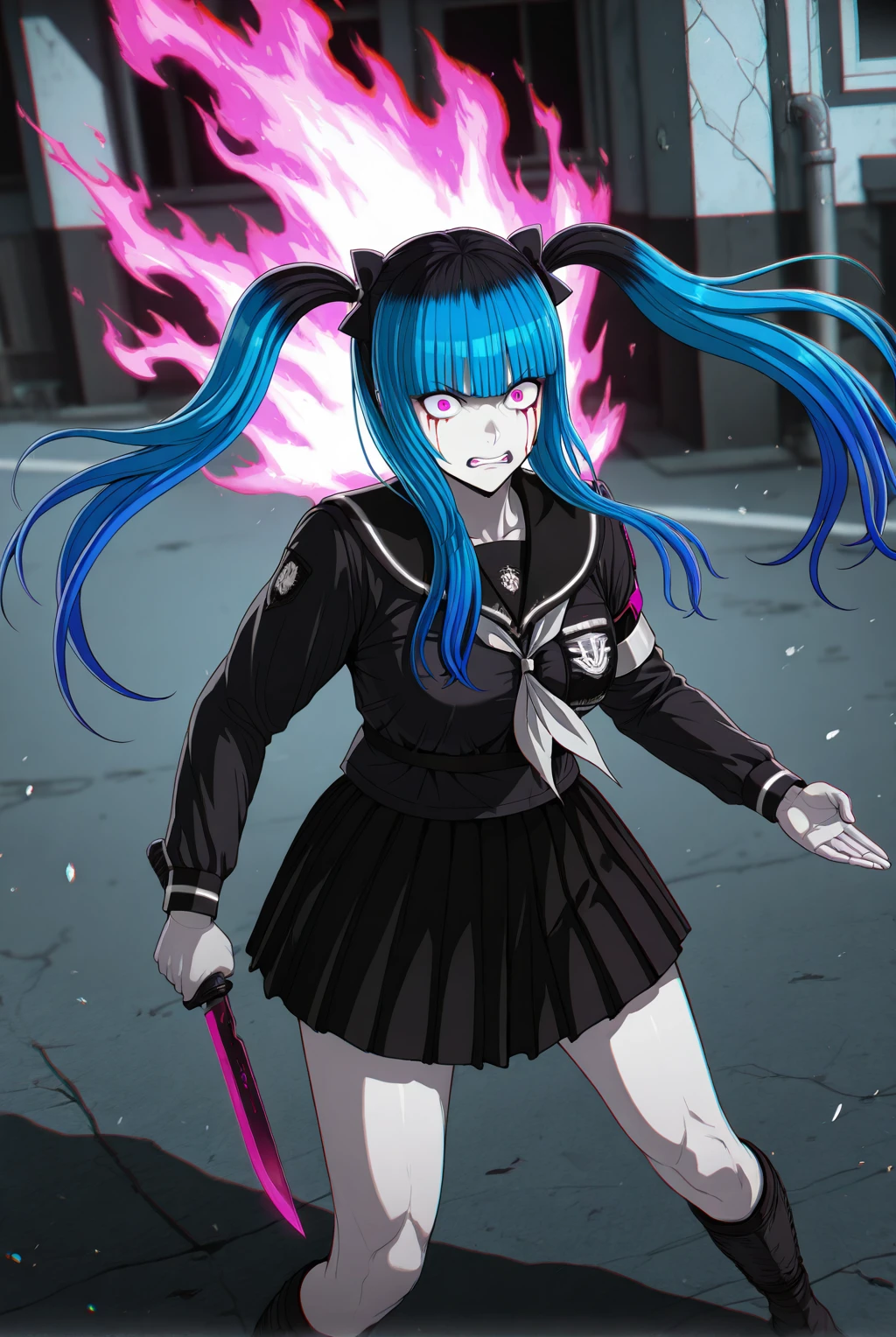 Darumi Amemiya, long hair, black hair, multicolored hair, sidelocks, blue hair, two-tone hair, gradient hair, twintails, blunt bangs, pink eyes, pale skin, hair ribbon, hair bow, pleated skirt, bowtie, black skirt, school uniform, belt, sailor collar, black footwear, black shirt, black bow, knee boots, armband, black sailor collar, black serafuku, white neckerchief, blood from eyes, white necktie, combat outfit