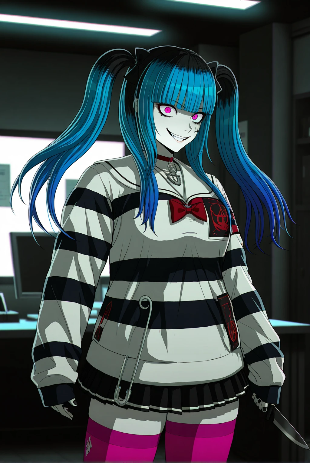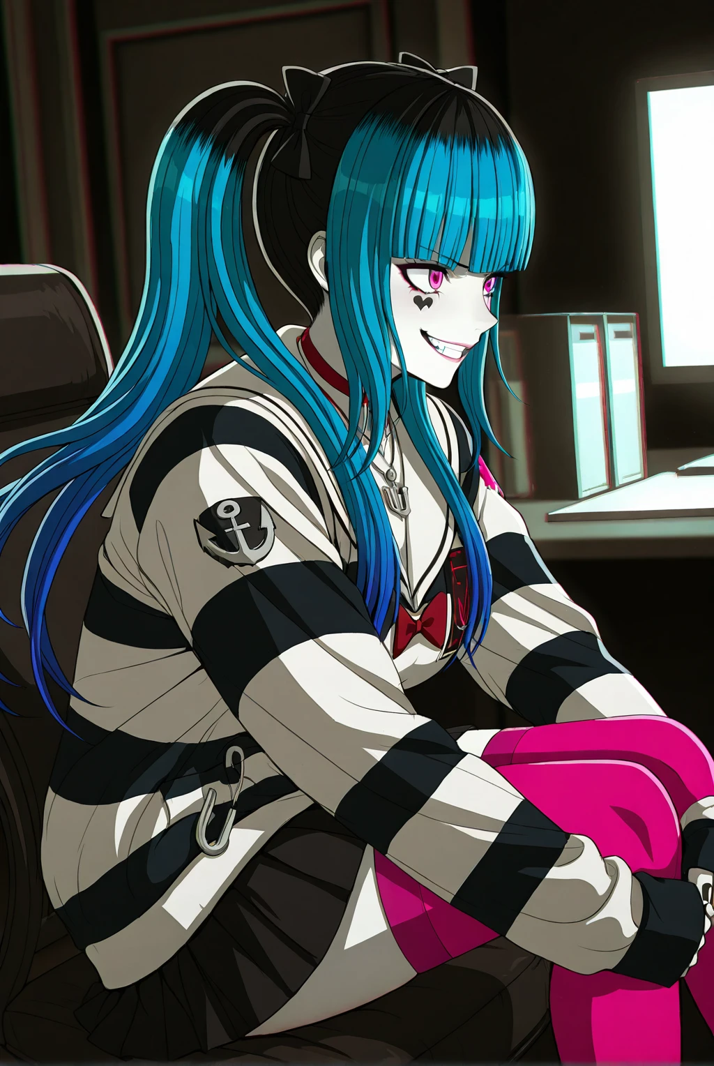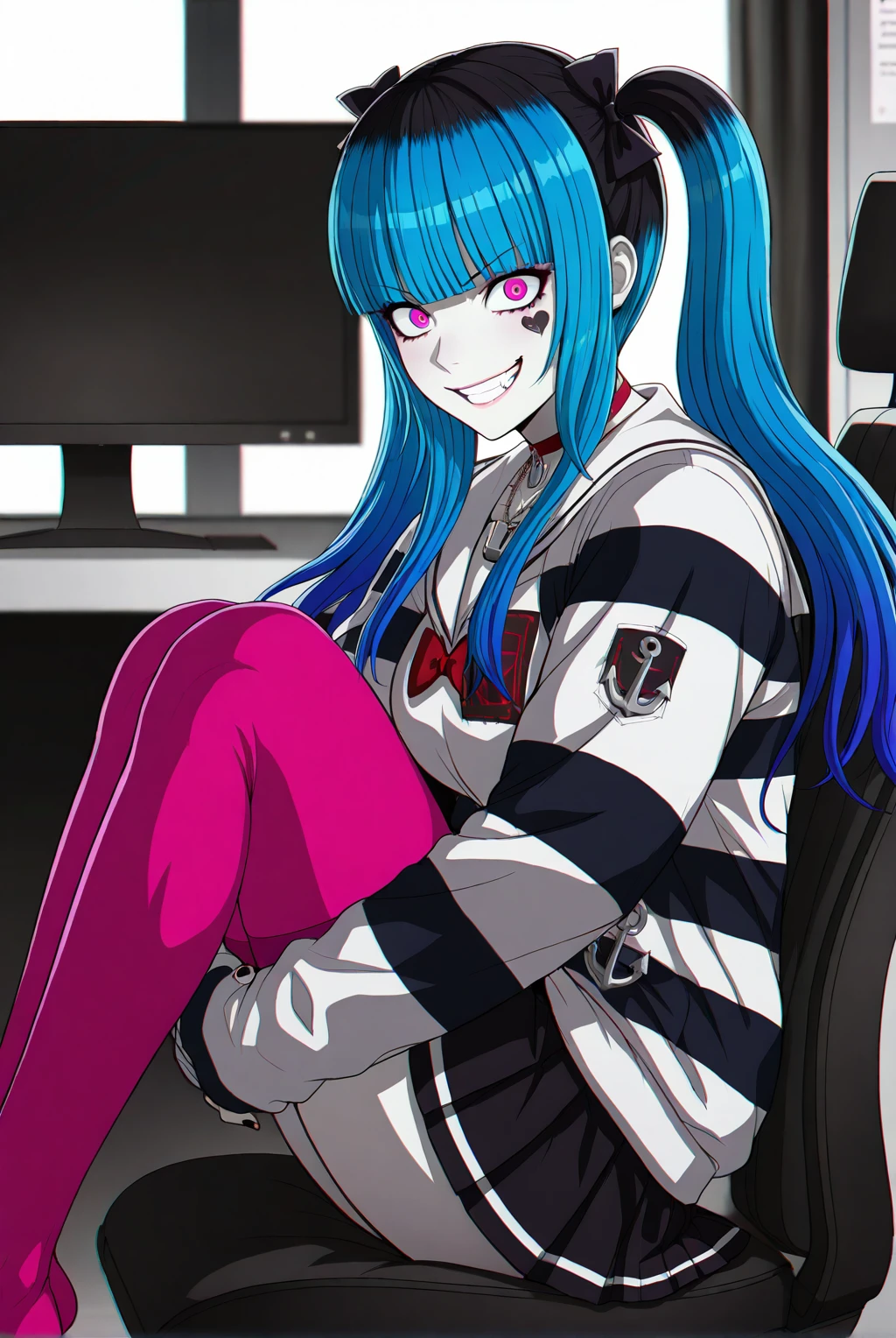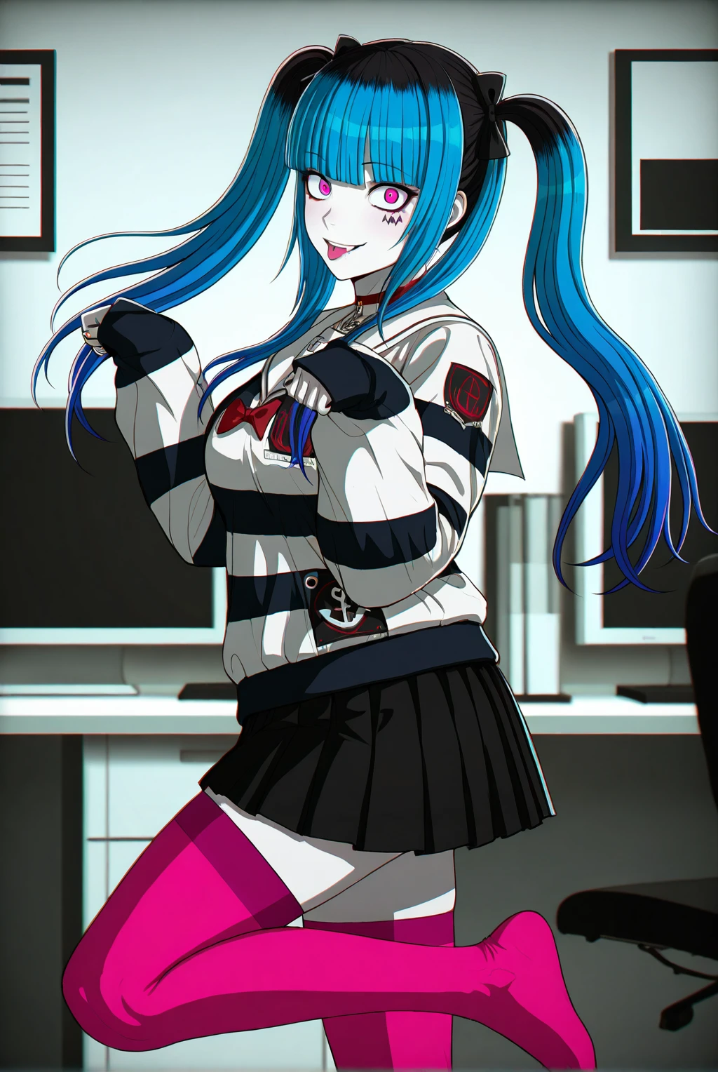 Darumi Amemiya, long hair, black hair, multicolored hair, sidelocks, blue hair, two-tone hair, gradient hair, twintails, blunt bangs, pink eyes, ringed eyes, pale skin, hair ribbon, heart, hair bow, pleated skirt, bowtie, black skirt, sailor collar, black footwear, necklace, striped clothes, red bow, sleeves past wrists, black bow, heart tattoo, facial mark, knee boots, red bowtie, red choker, anchor, facial tattoo, pink thighhighs, striped sweater