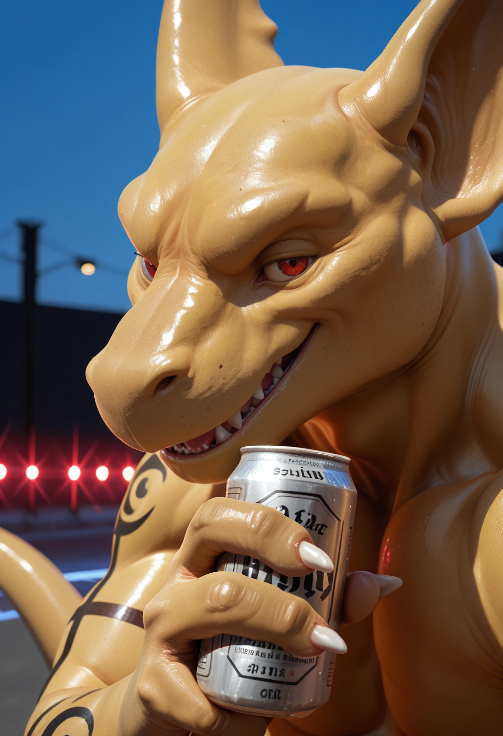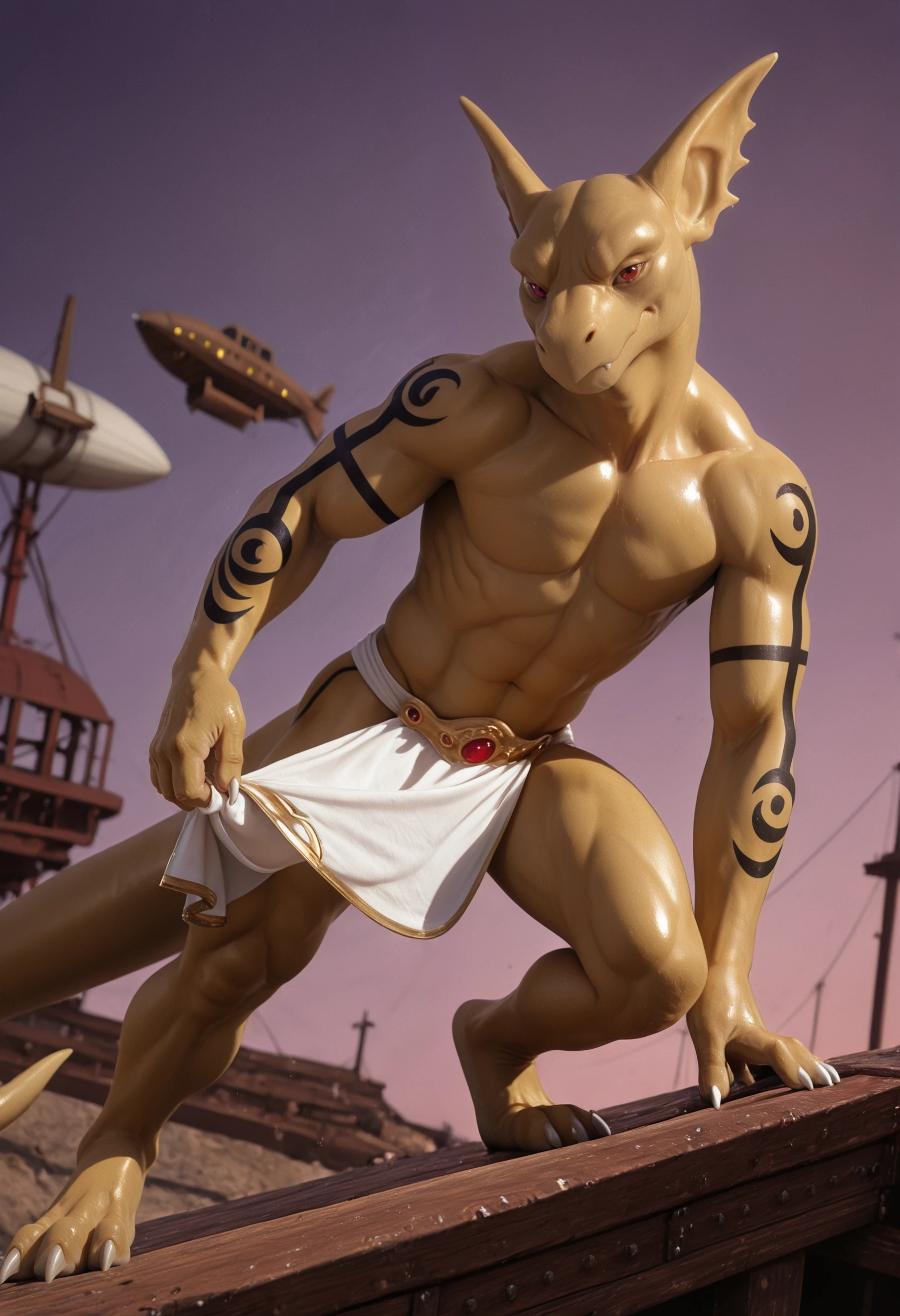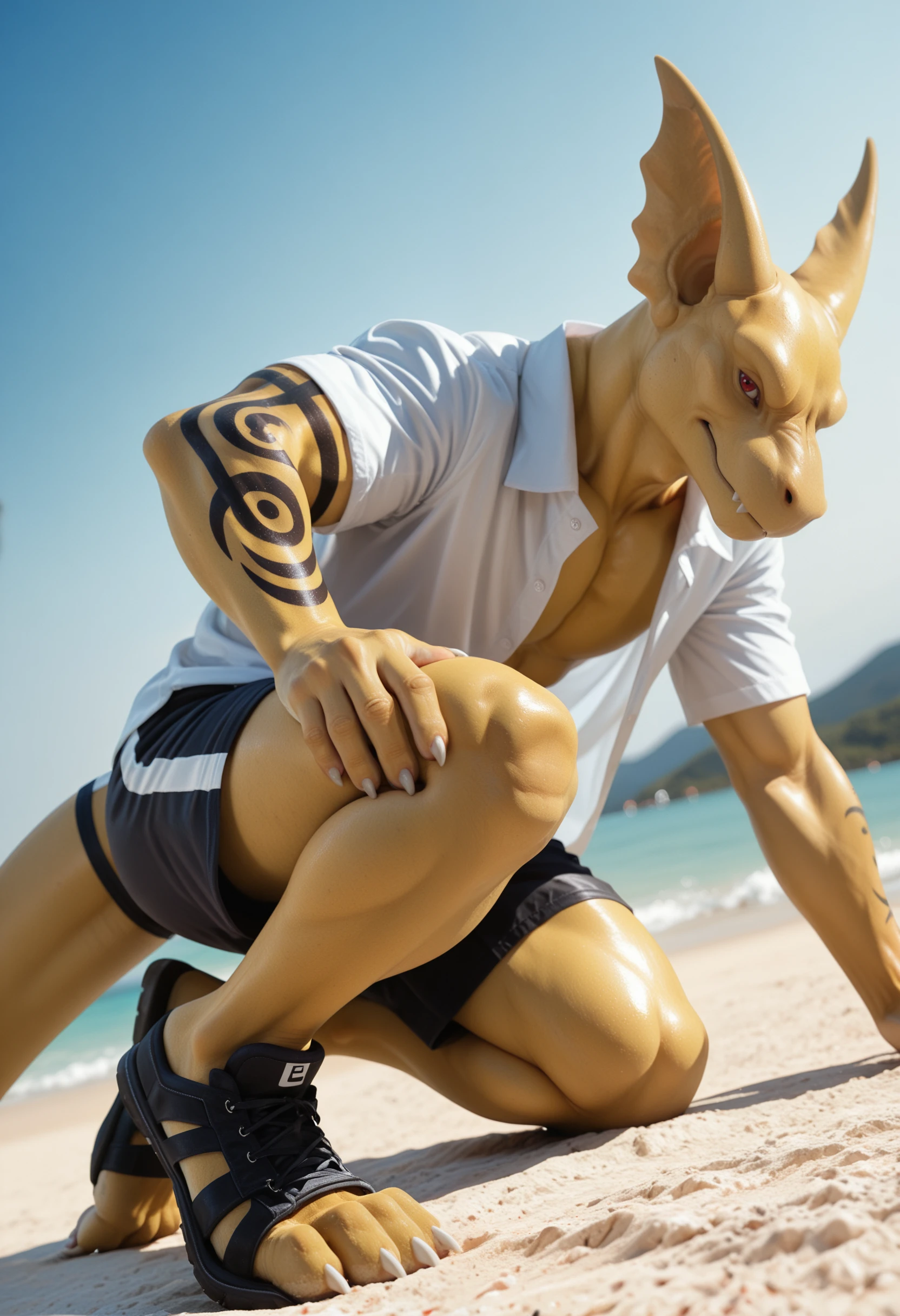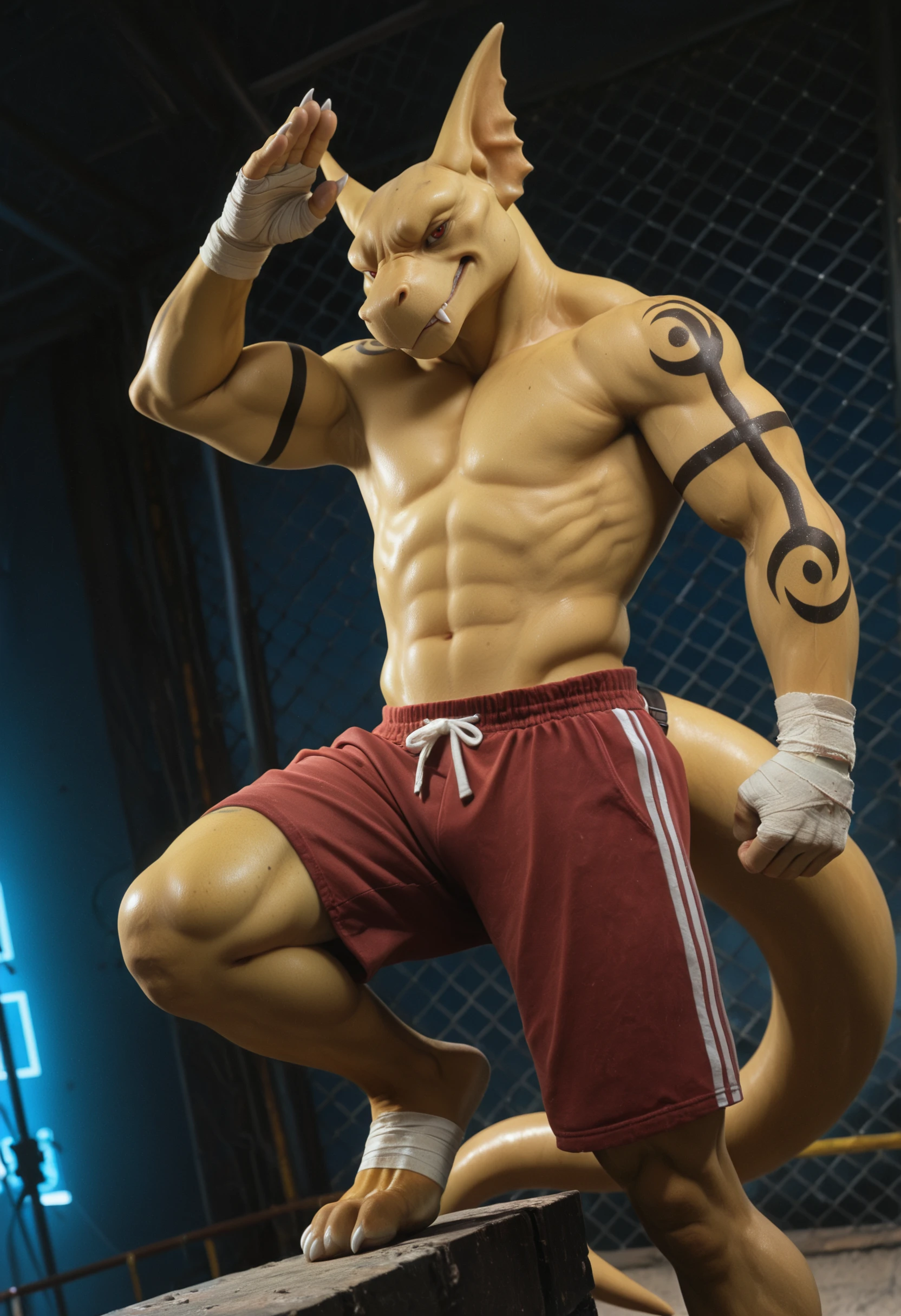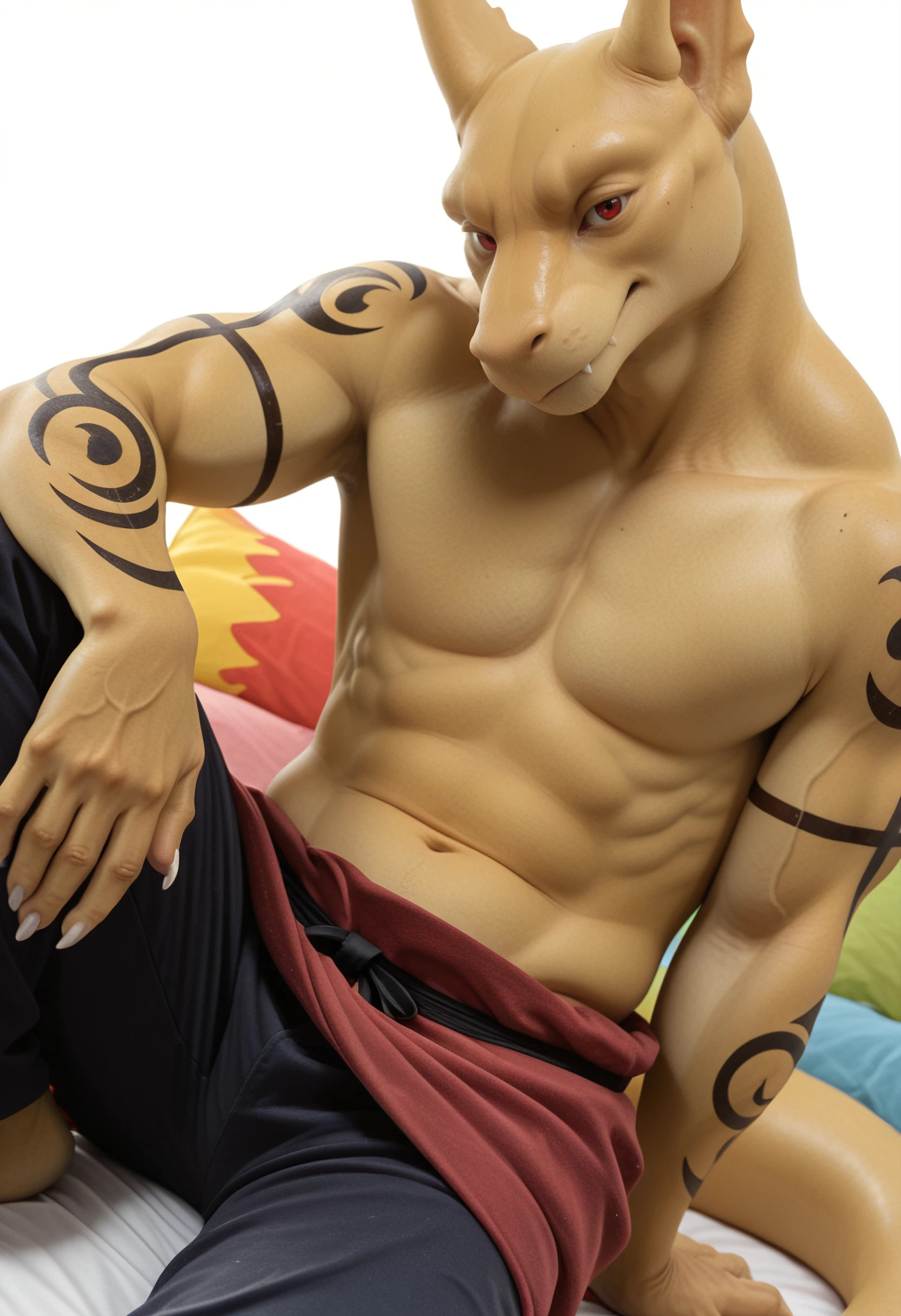 t3phros_t3phr0sdrag0n, dragon, anthro, male, furry, tattoo, tail, muscular, furry male, male focus, muscular male, scalie, 1boy, solo, red eyes, claws, looking at viewer, yellow skin, smooth skin