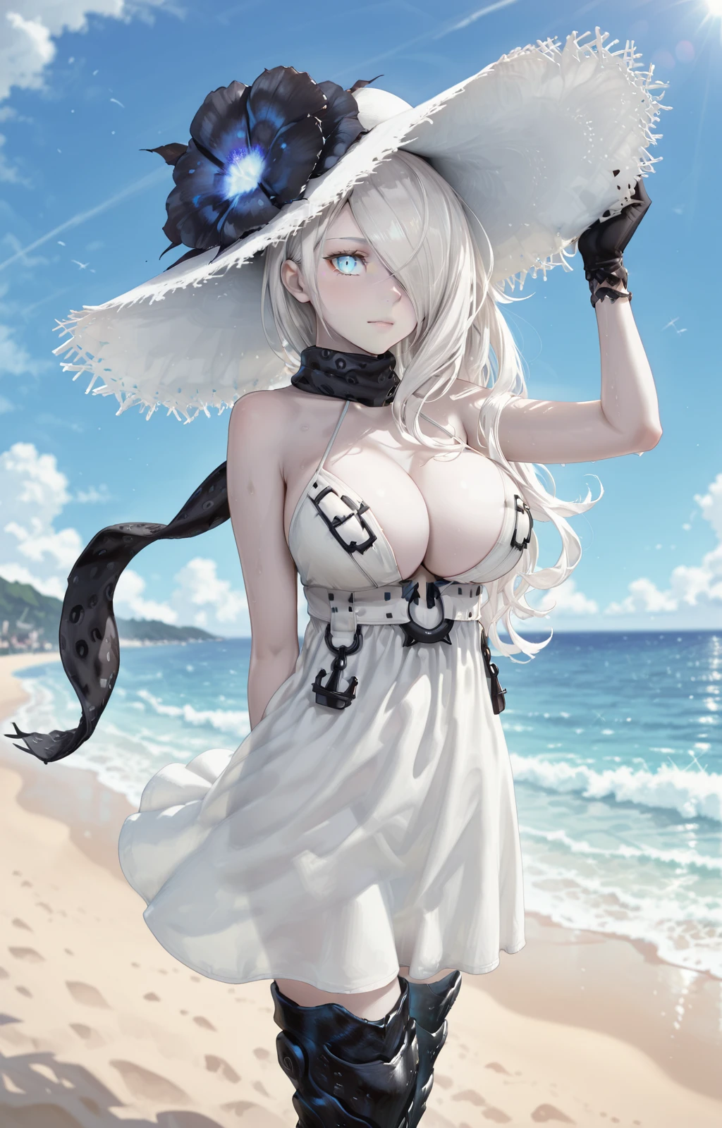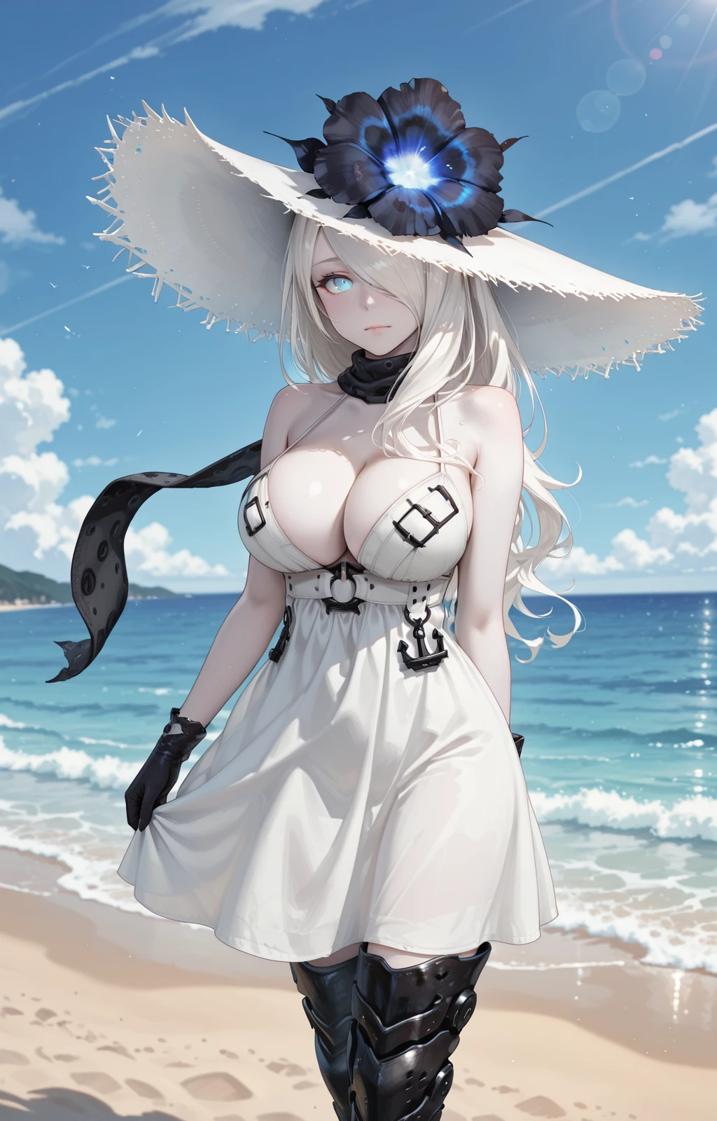 hat flower, sun hat, black gloves, white dress, sundress, anchor, cleavage, scarf, thigh boots, armored boots,