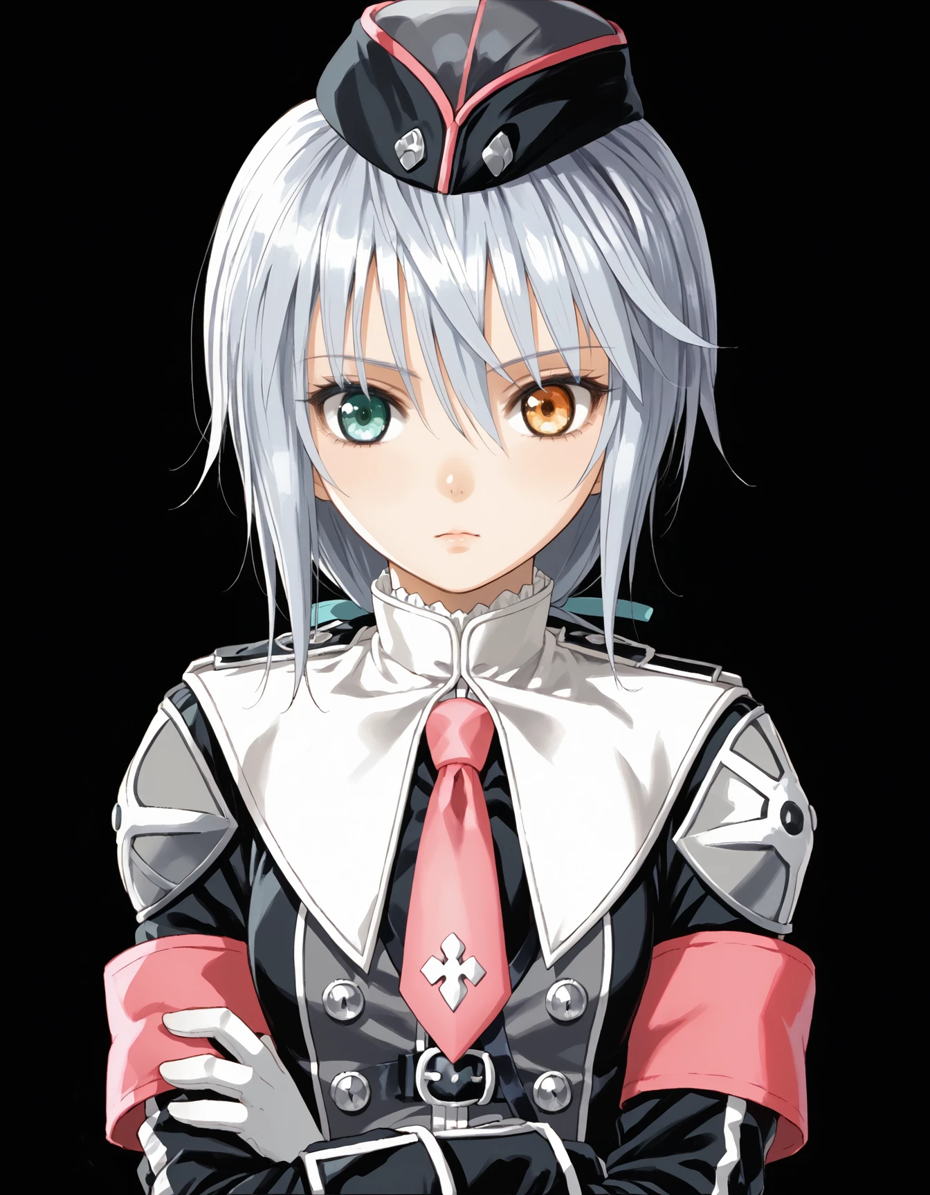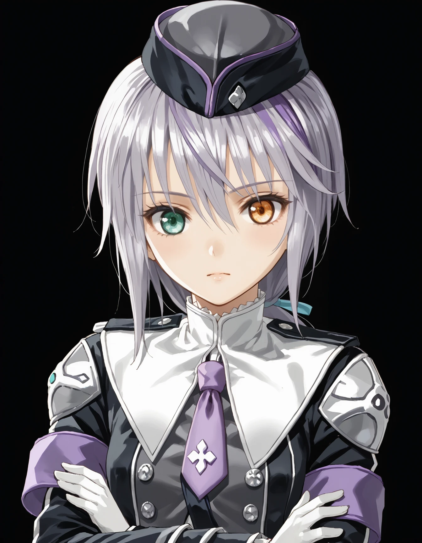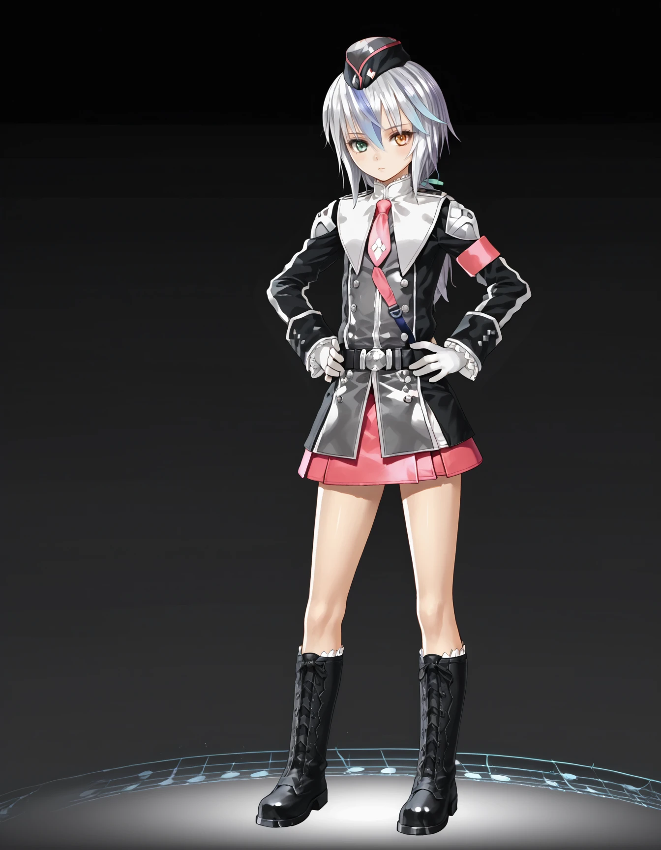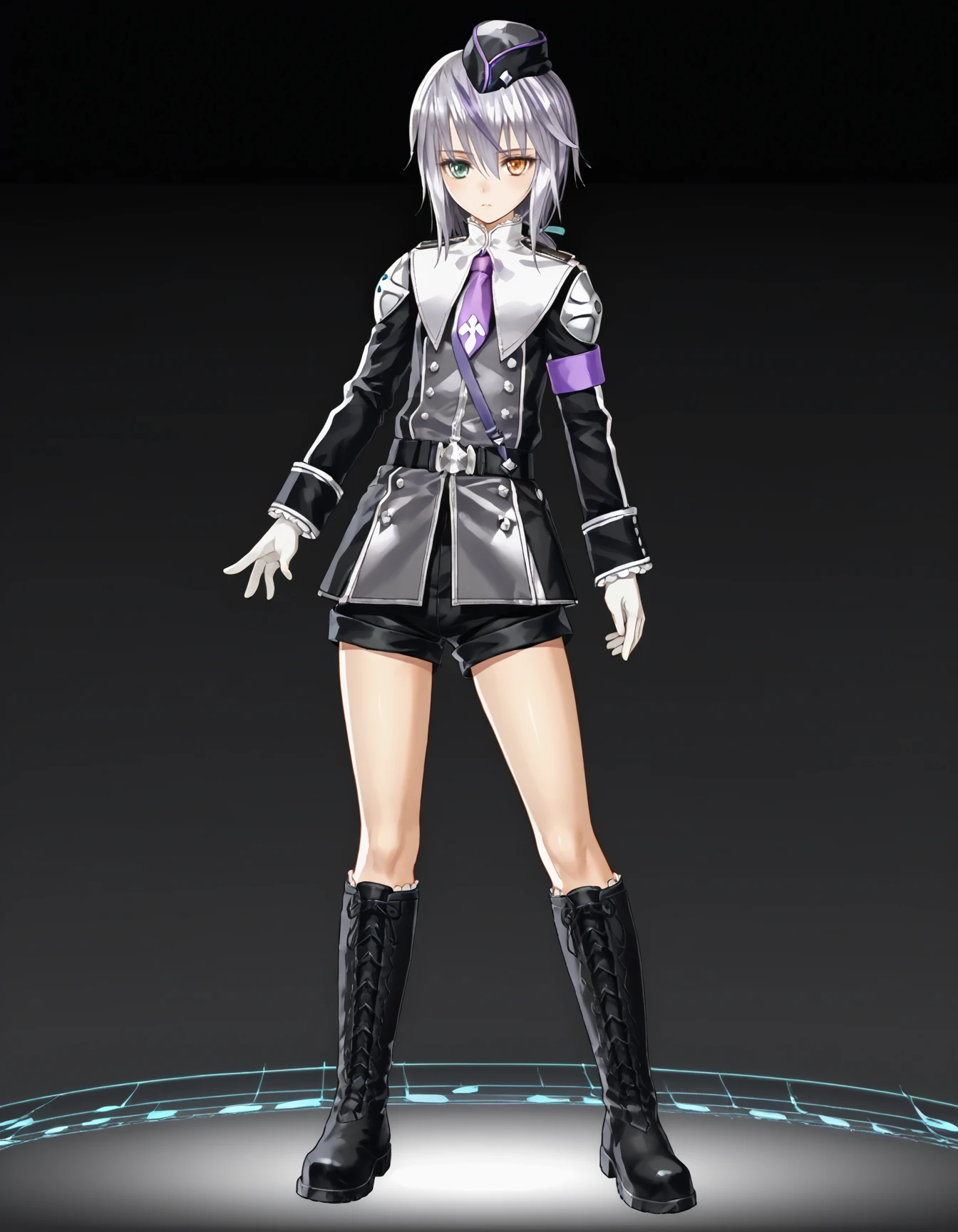 Combat Shorts: combat shorts, boots, hat, gloves, purple necktie, uniform, black shorts, black knee boots