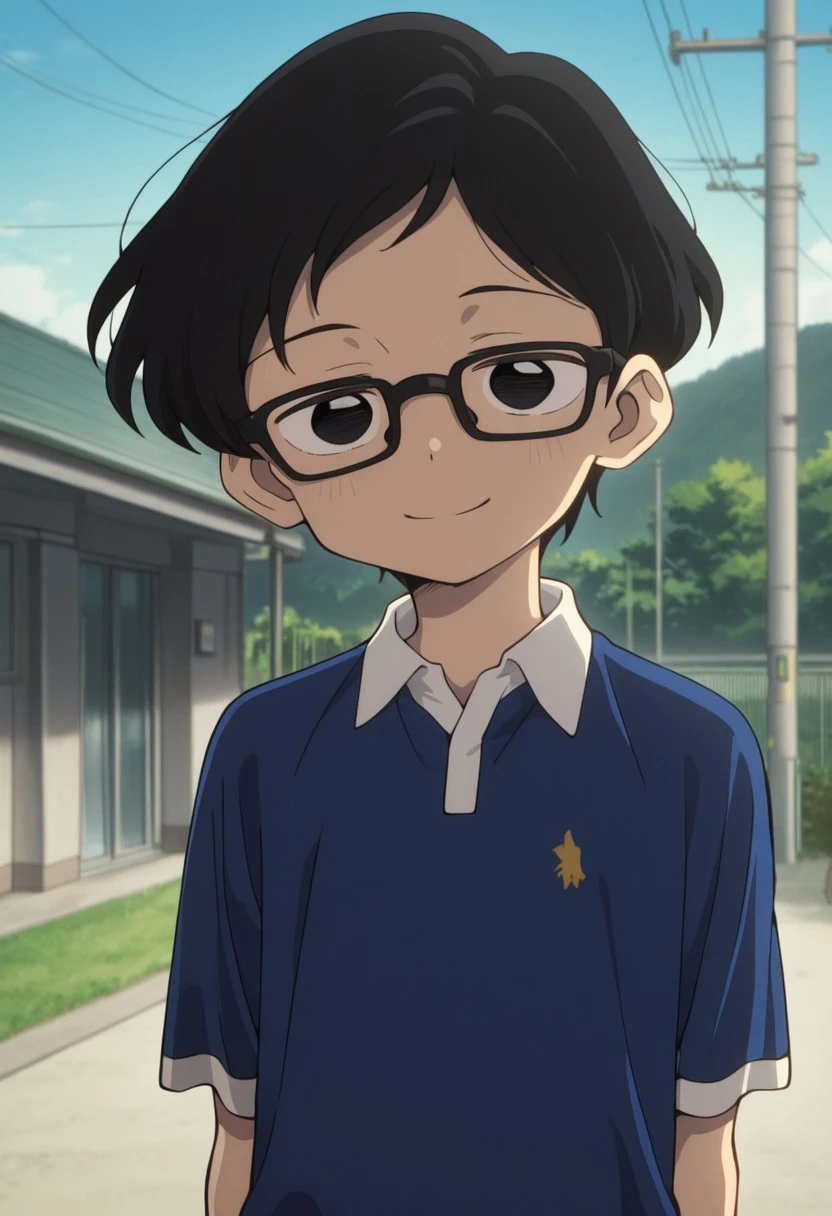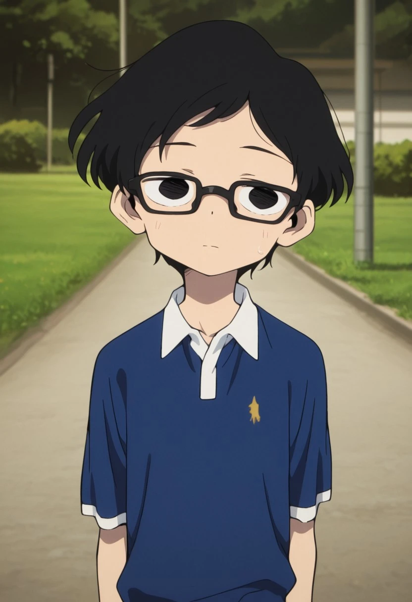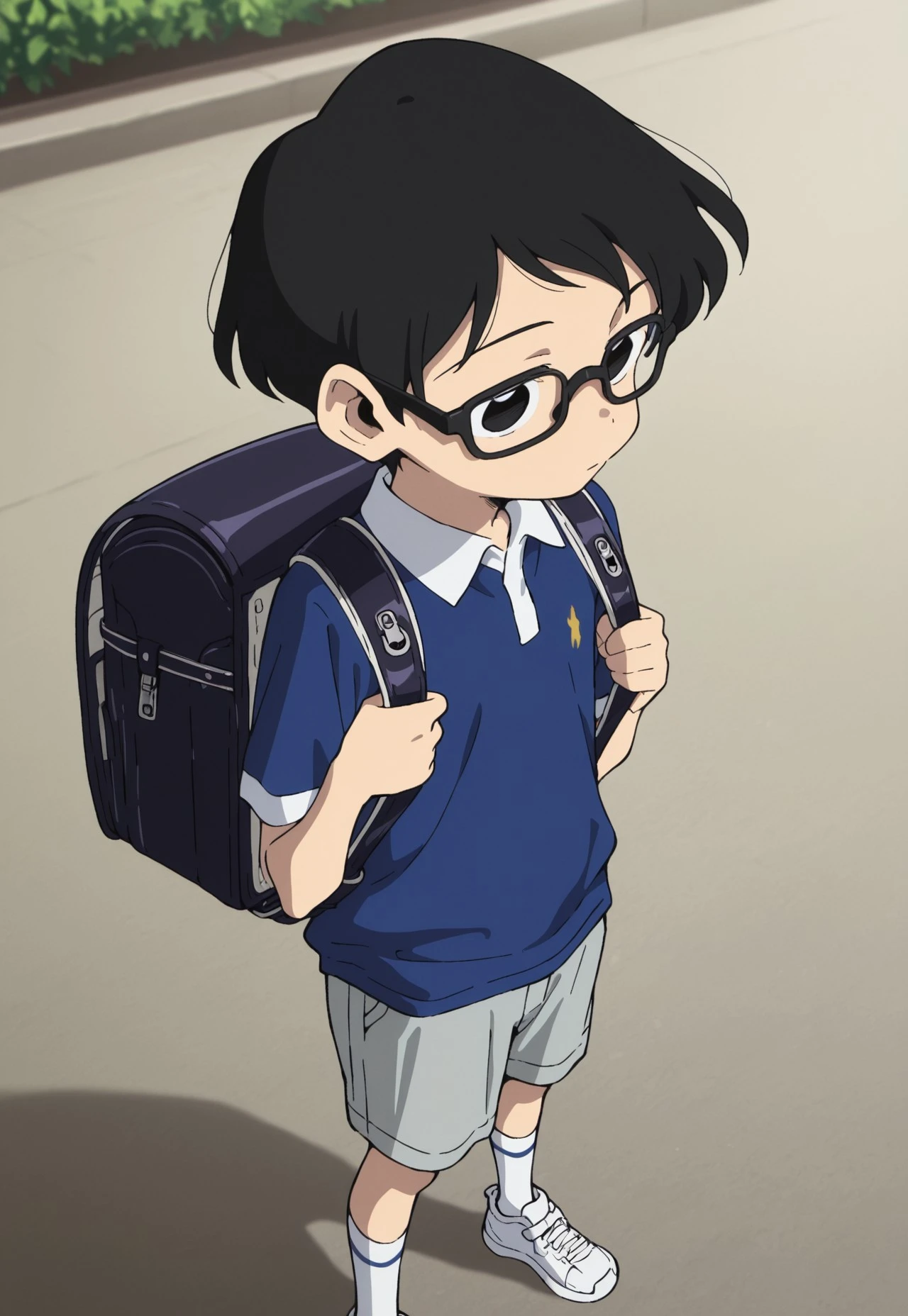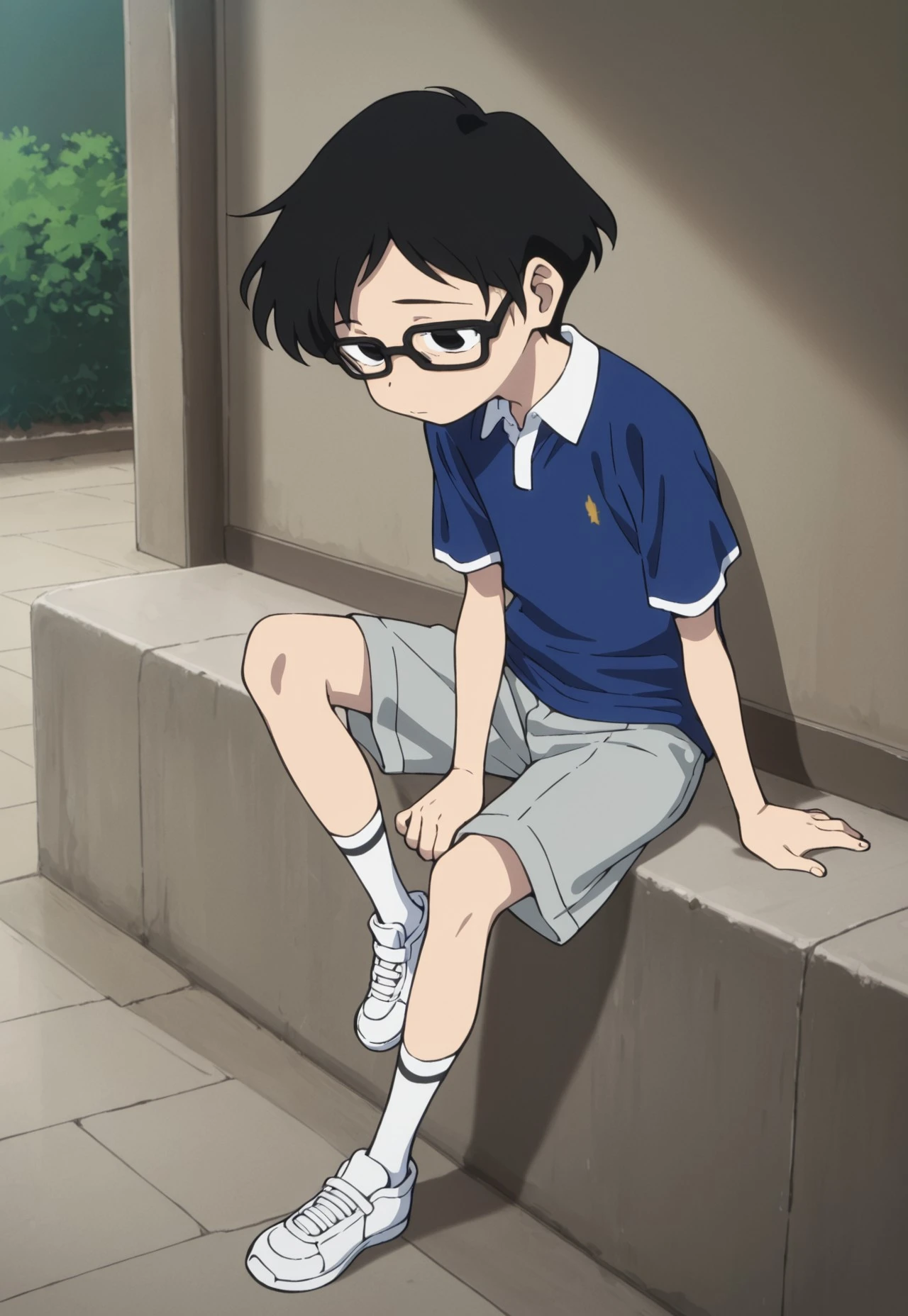 NaokAzu, 1boy, male focus, solo, black eyes, glasses, black hair, polo shirt, blue shirt, short sleeves, grey shorts, white socks, sneakers, white footwear,