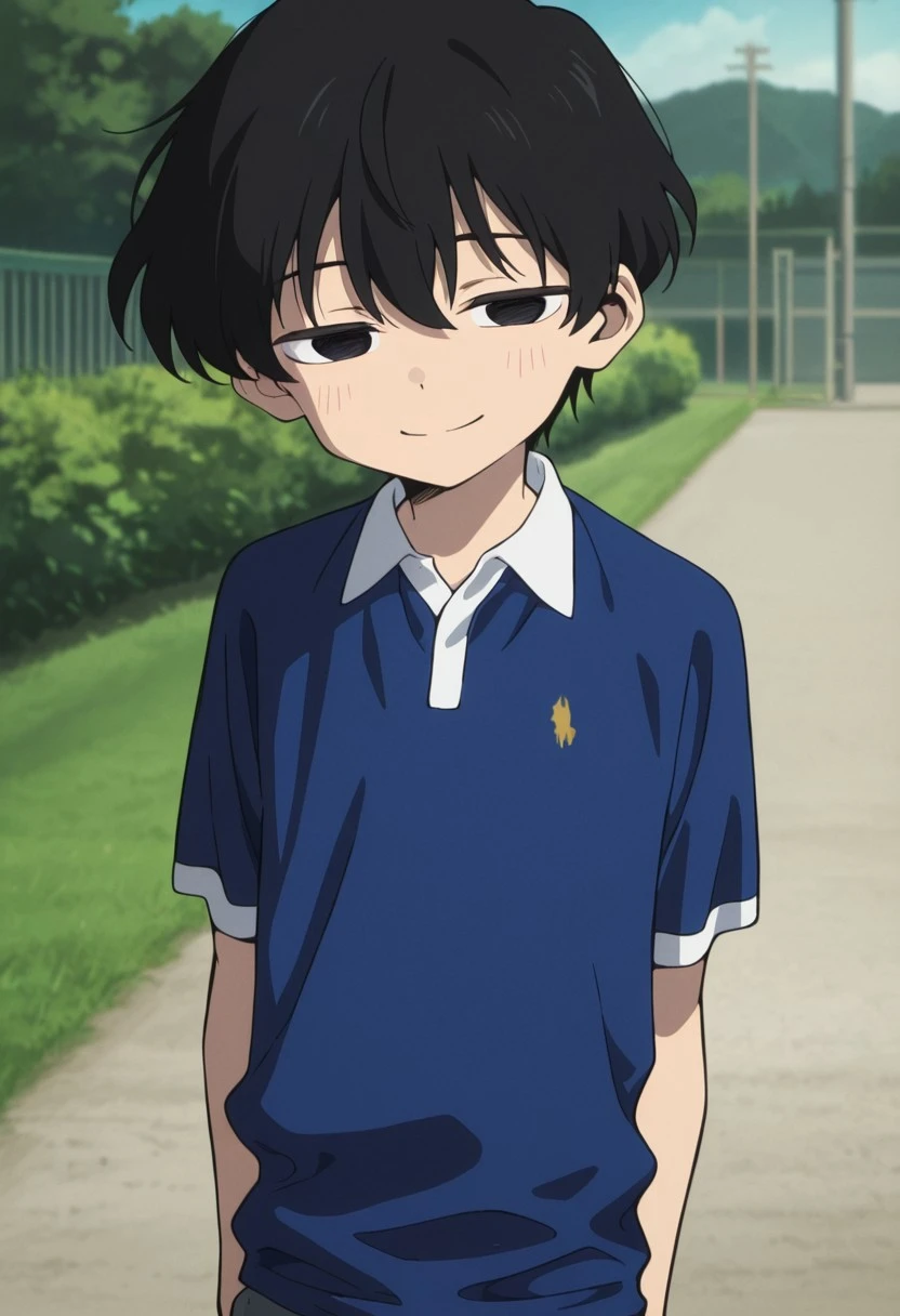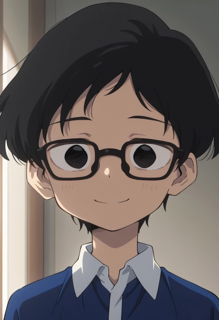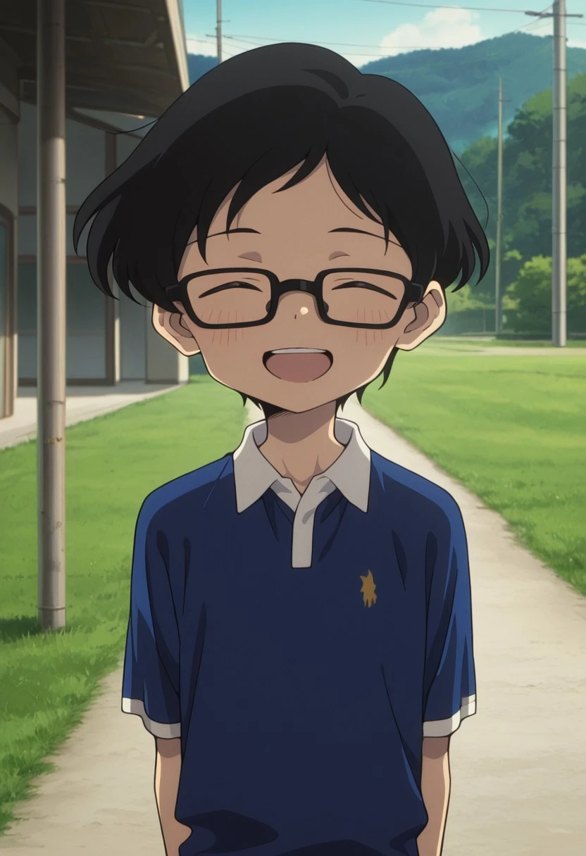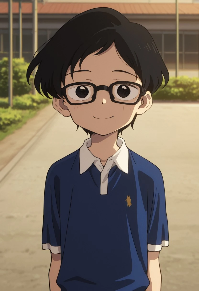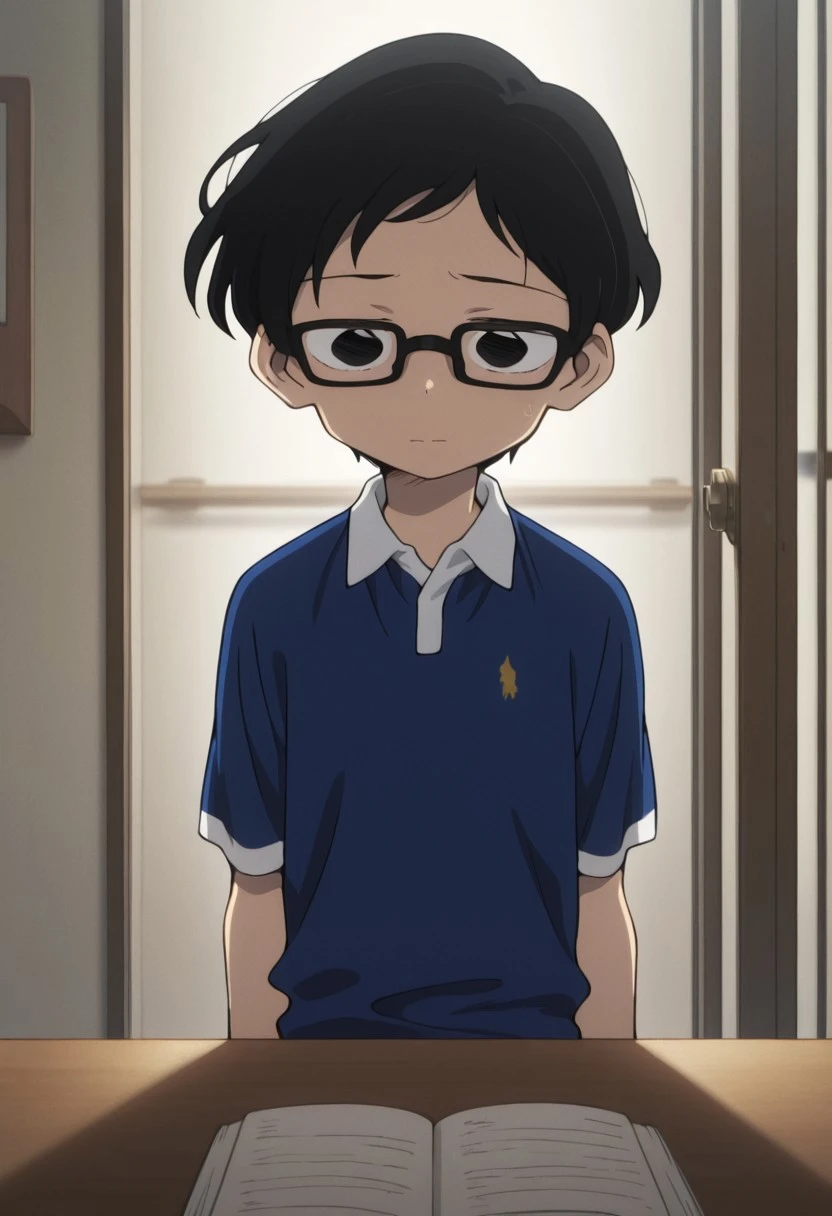 NaokAzu, 1boy, male focus, solo, black eyes, glasses, black hair, polo shirt, blue shirt, short sleeves, grey shorts, white socks, sneakers, white footwear,