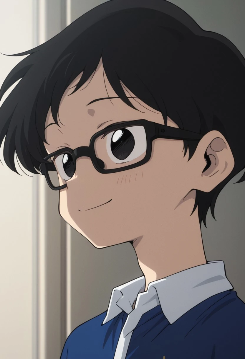 NaokAzu, 1boy, male focus, solo, black eyes, glasses, black hair, school uniform, white shirt, collared shirt, blue necktie, green jacket, blazer, grey pants, shoes, brown footwear,