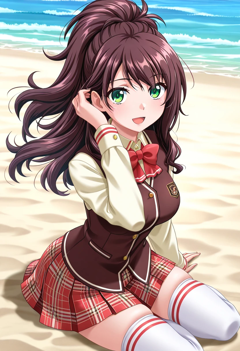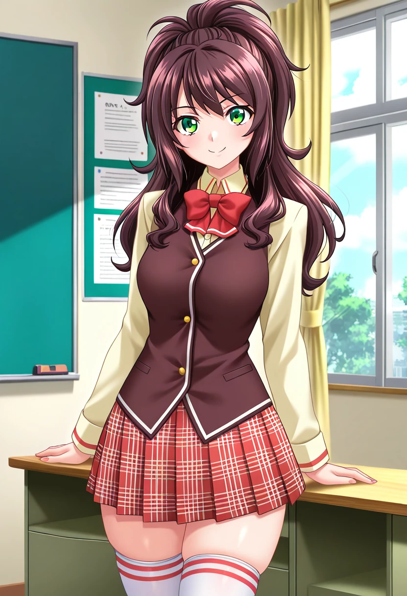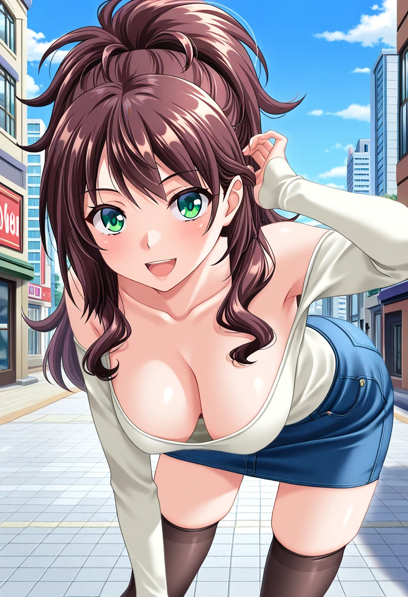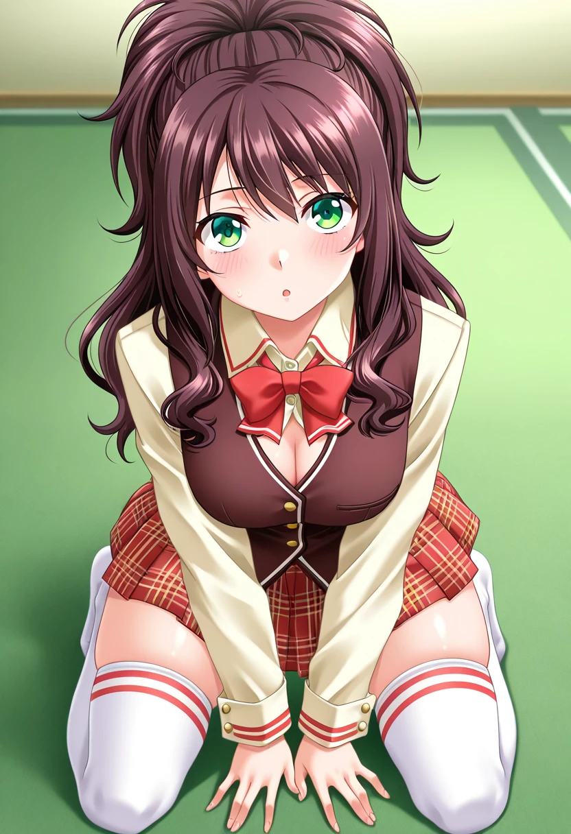 azusaww, green eyes, brown hair, long hair, wavy hair, high ponytail, medium breasts,