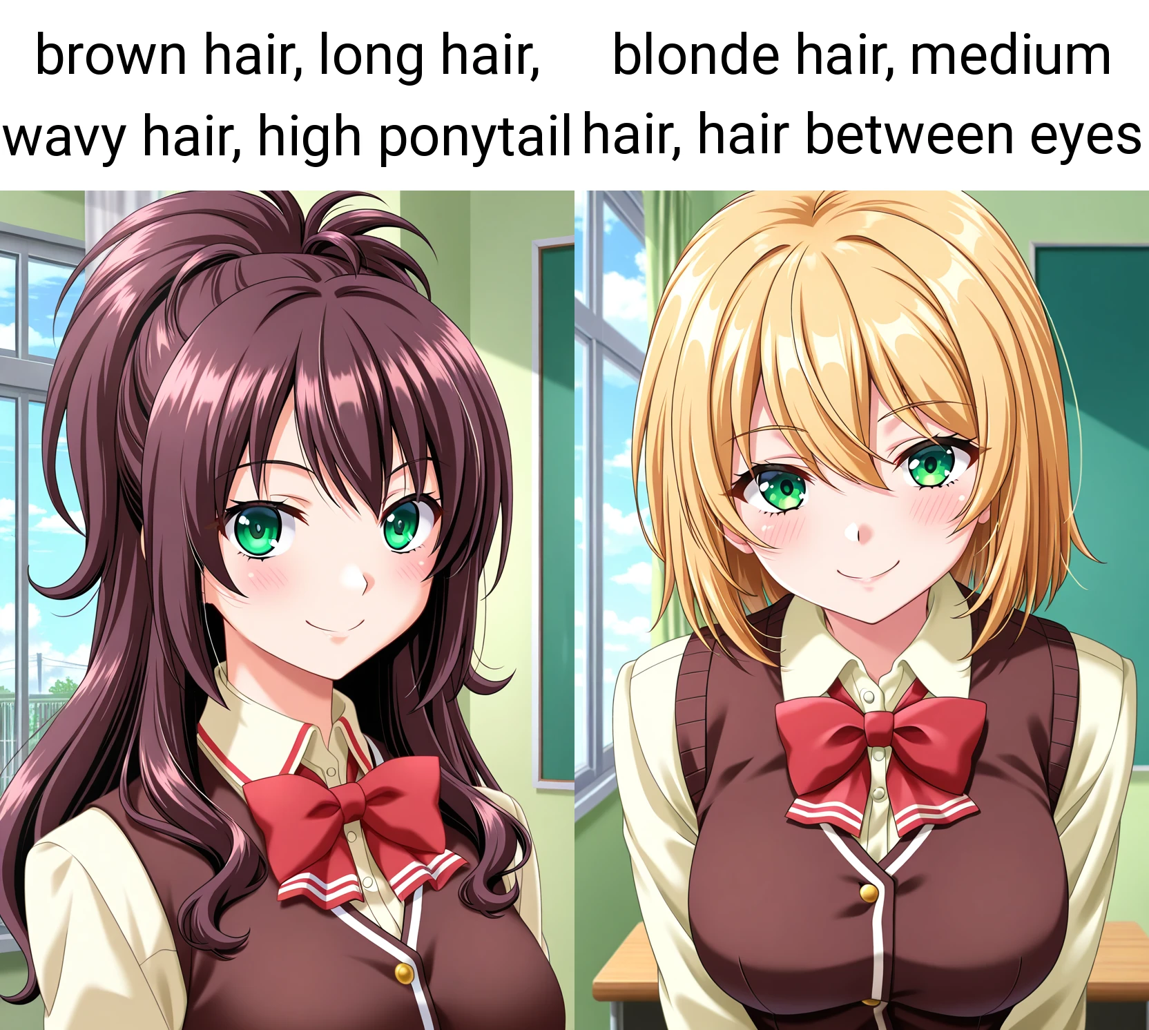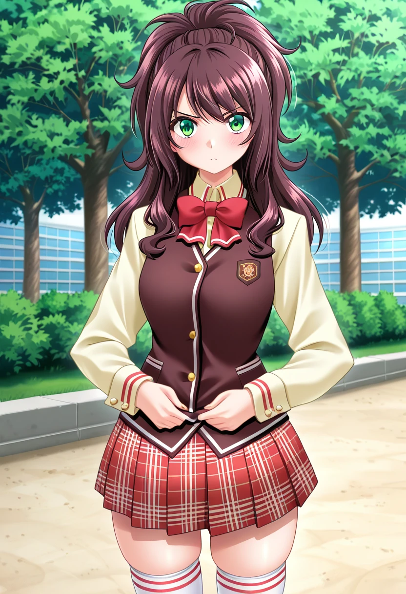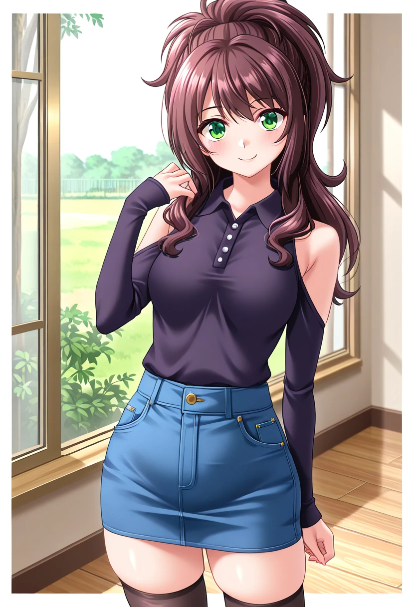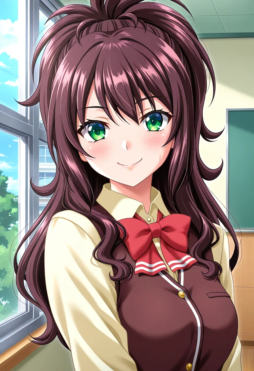 azusaww, green eyes, brown hair, long hair, wavy hair, high ponytail, medium breasts,