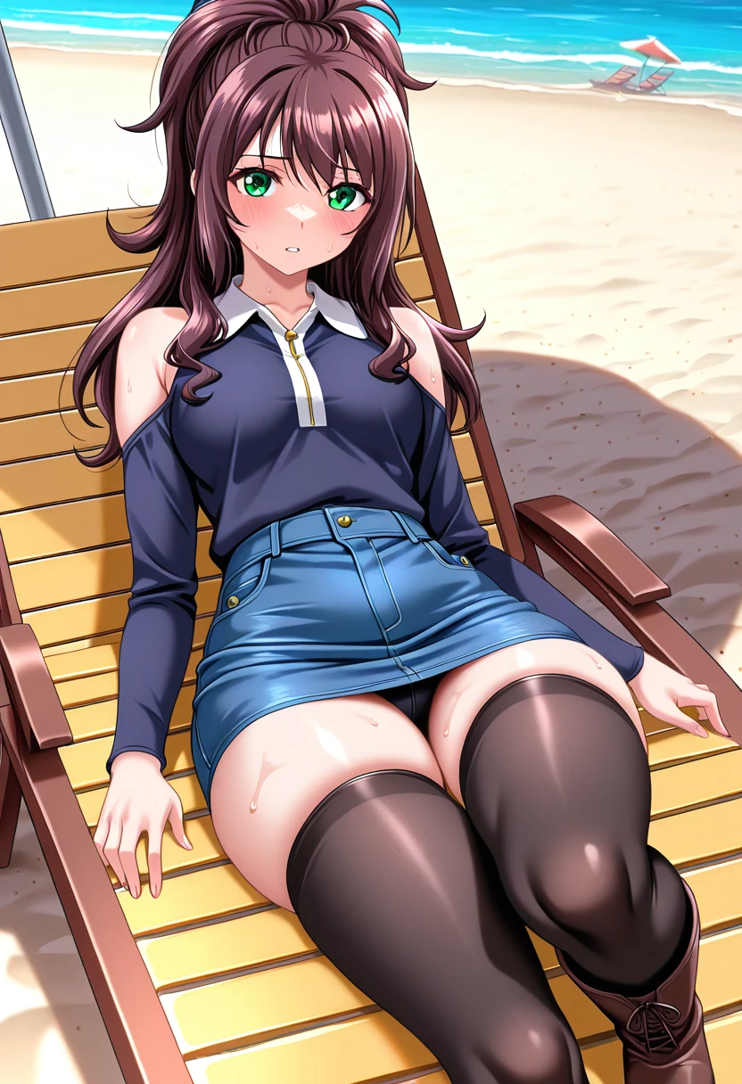 casual, bare shoulders, black collared shirt, long sleeves, denim skirt, miniskirt, zettai ryouiki, black thighhighs, brown boots,