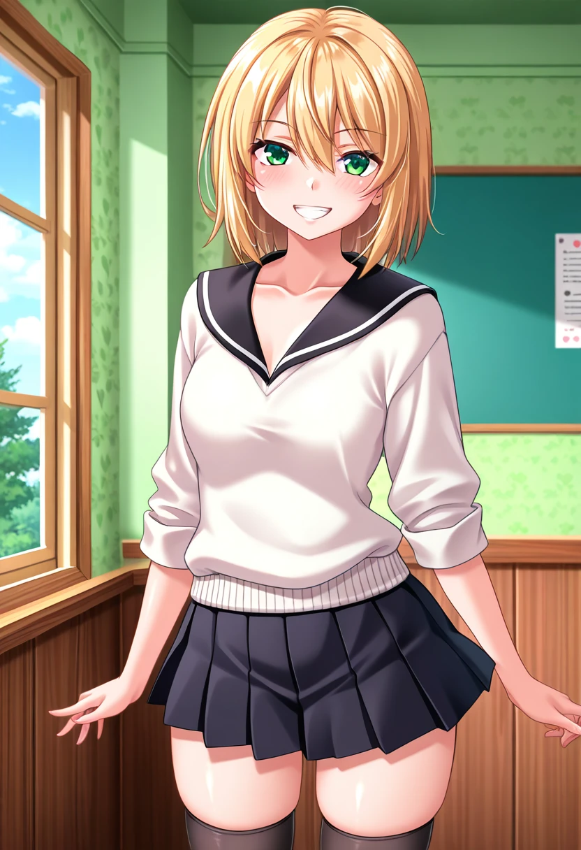 serafuku, collarbone, black sailor collar, no neckwear, white sweater, long sleeves, black pleated skirt, miniskirt, black kneehighs,