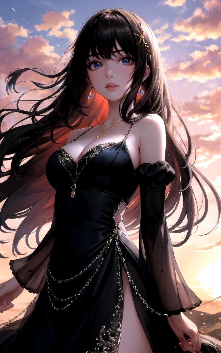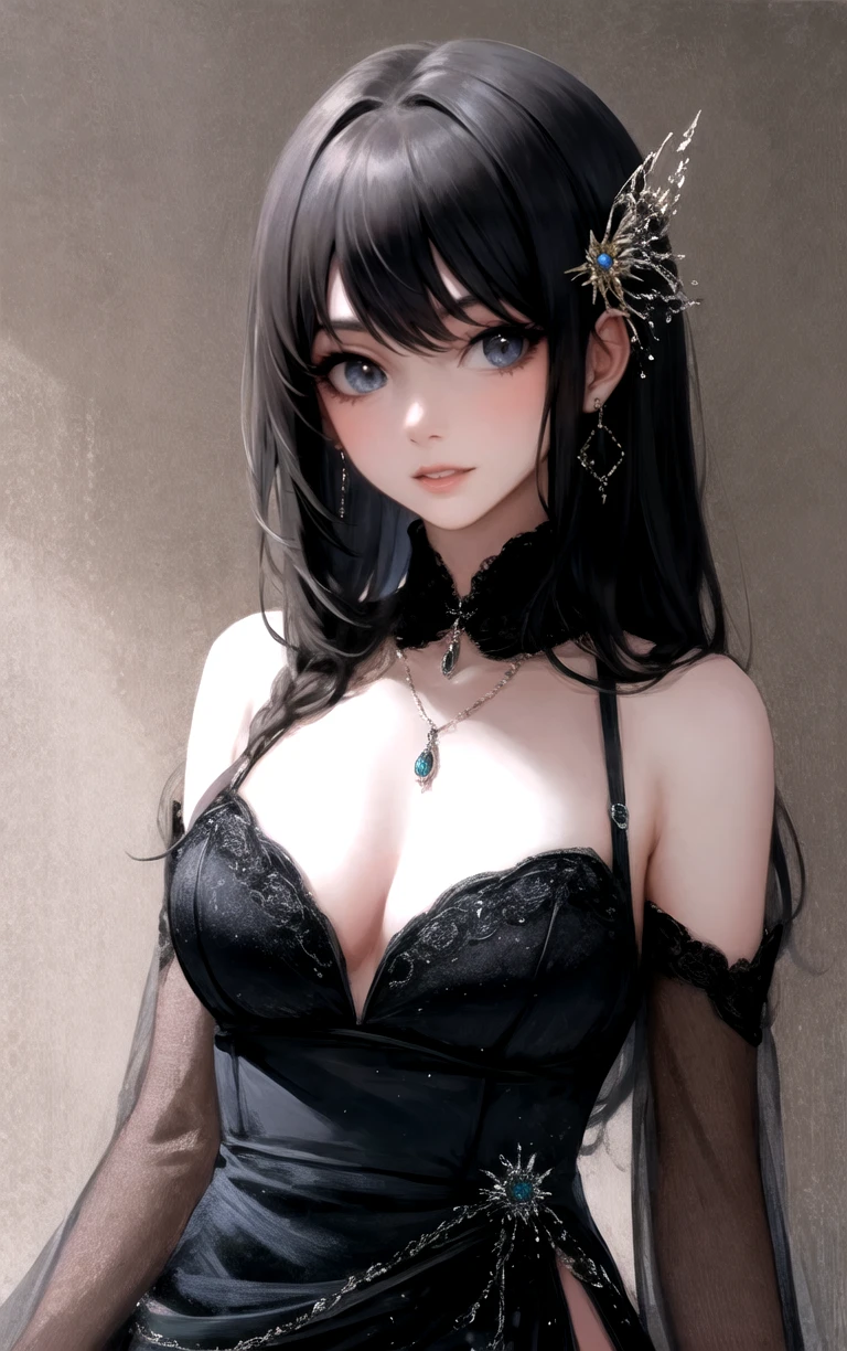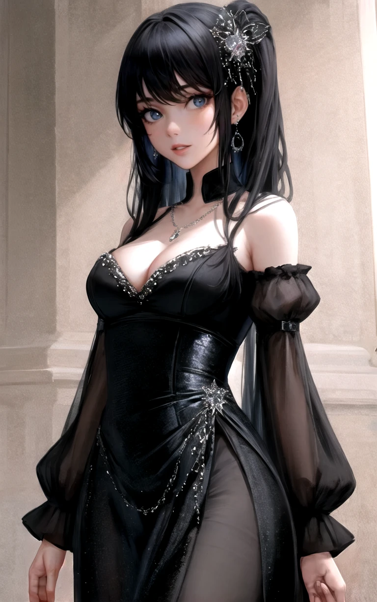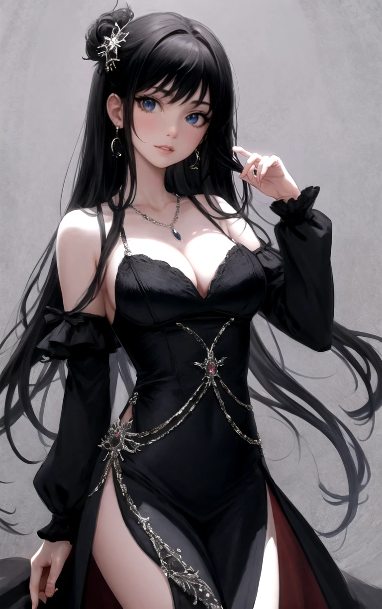 1girl, long hair, lips, breasts, jewelry, bangs, dress, black hair, bare shoulders, earrings, medium breasts, cleavage, black dress, blue eyes, red lips, long sleeves, hair ornament, parted lips, necklace,