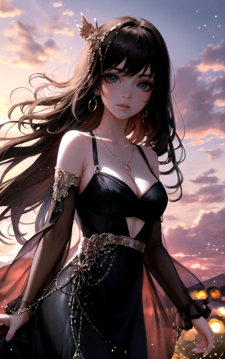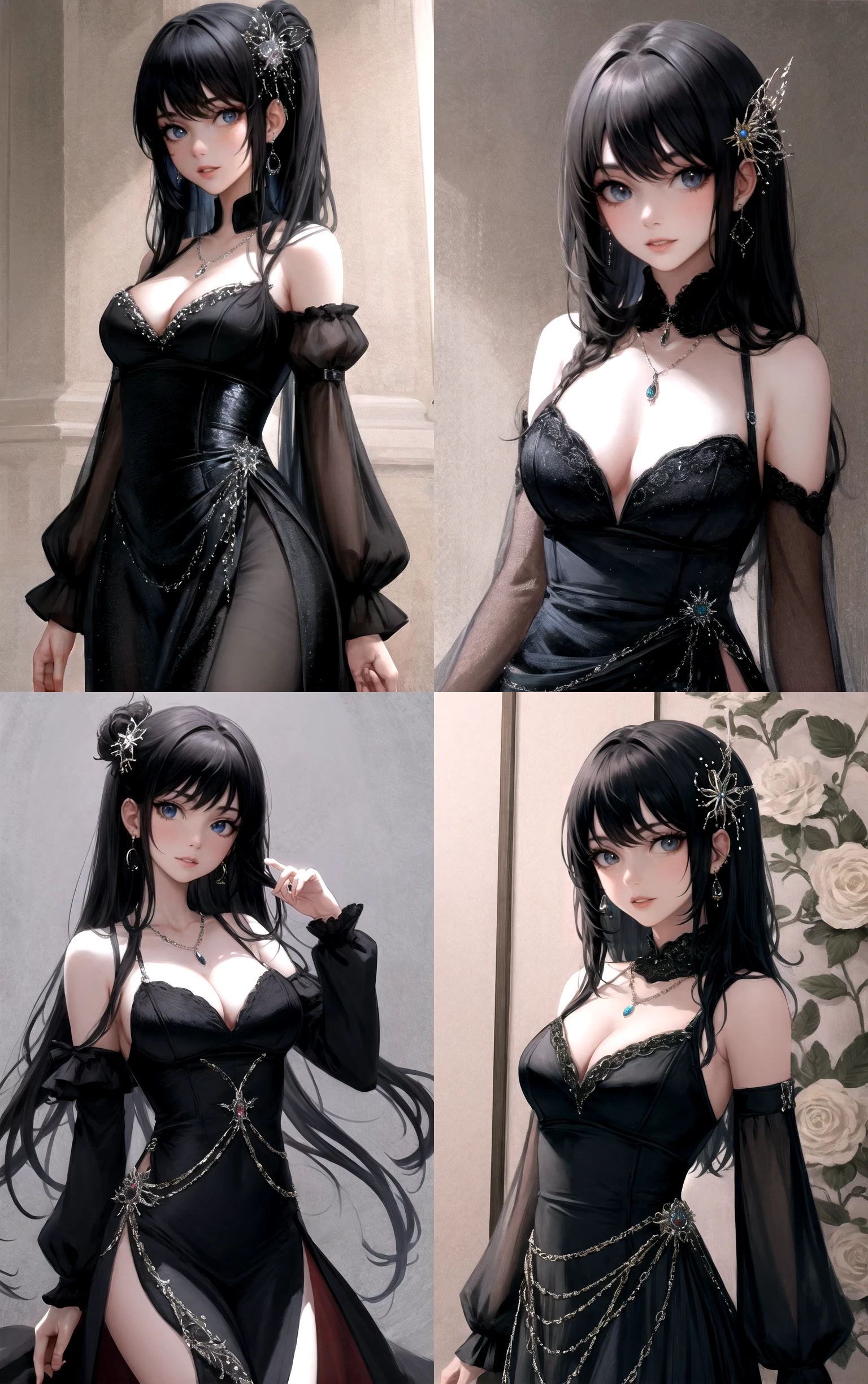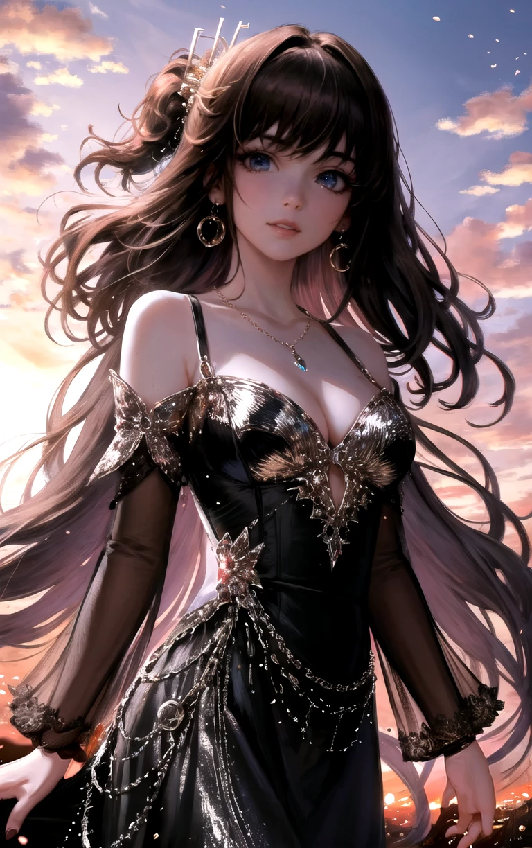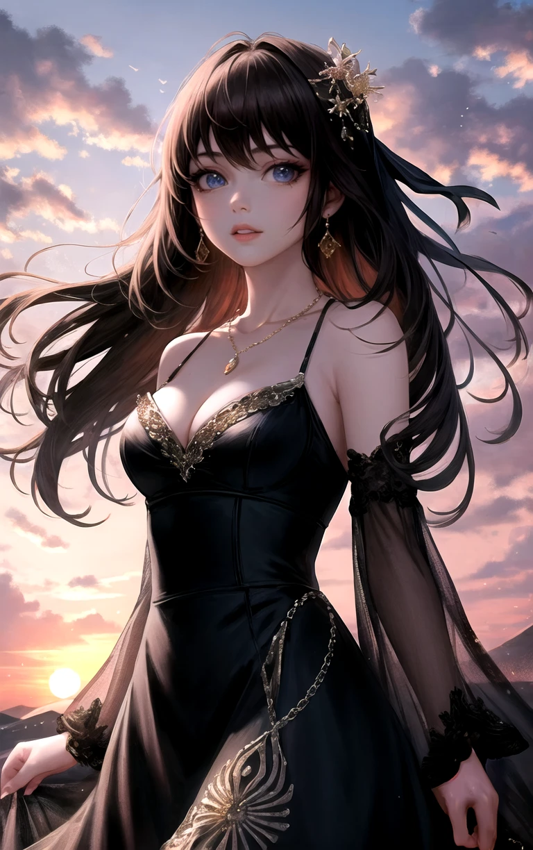 1girl, long hair, lips, breasts, jewelry, bangs, dress, black hair, bare shoulders, earrings, medium breasts, cleavage, black dress, blue eyes, red lips, long sleeves, hair ornament, parted lips, necklace,