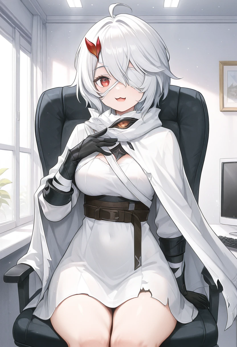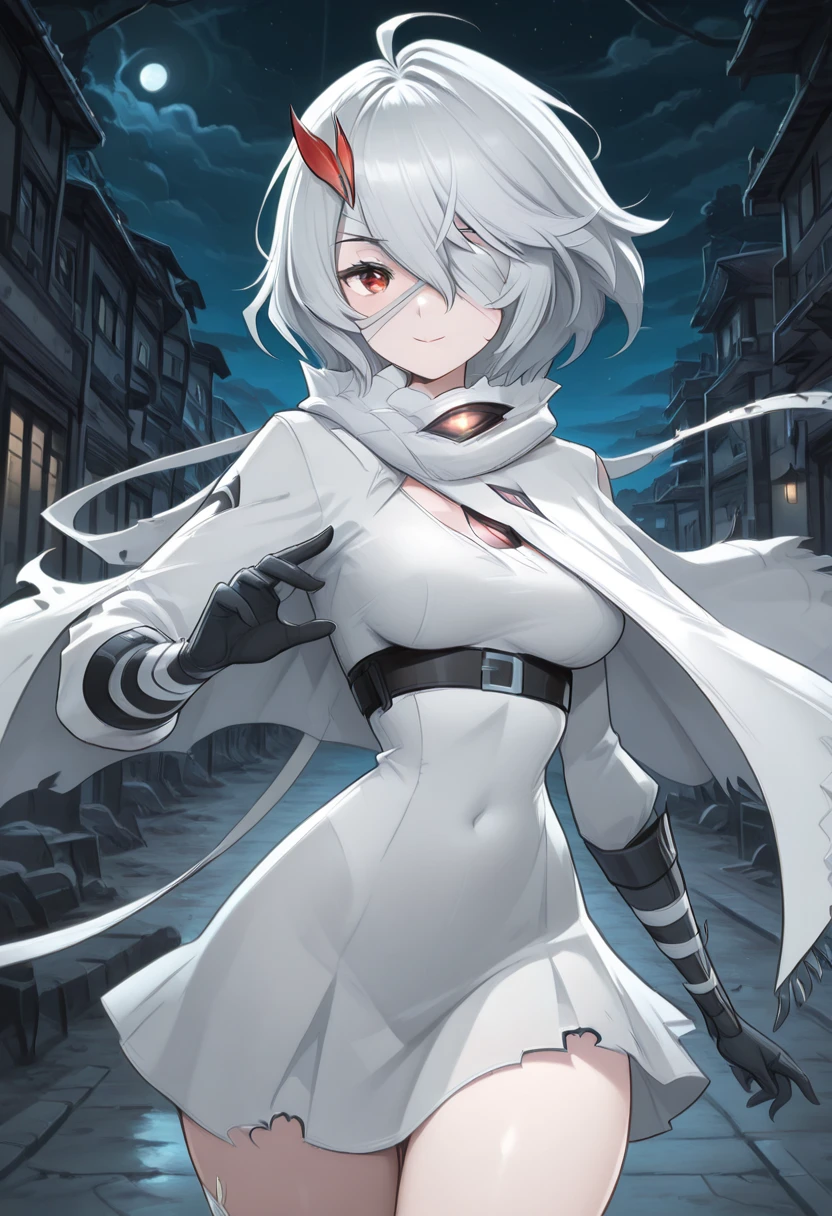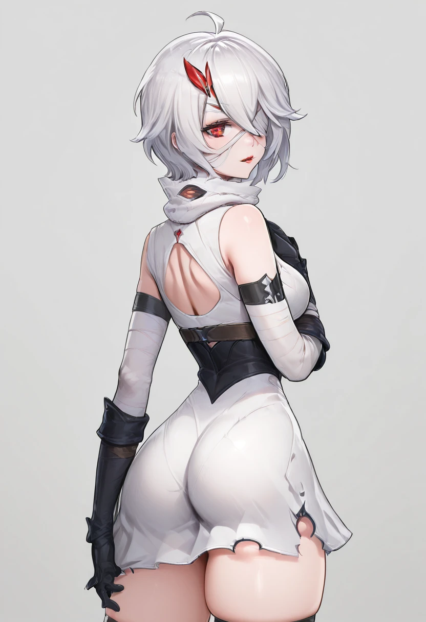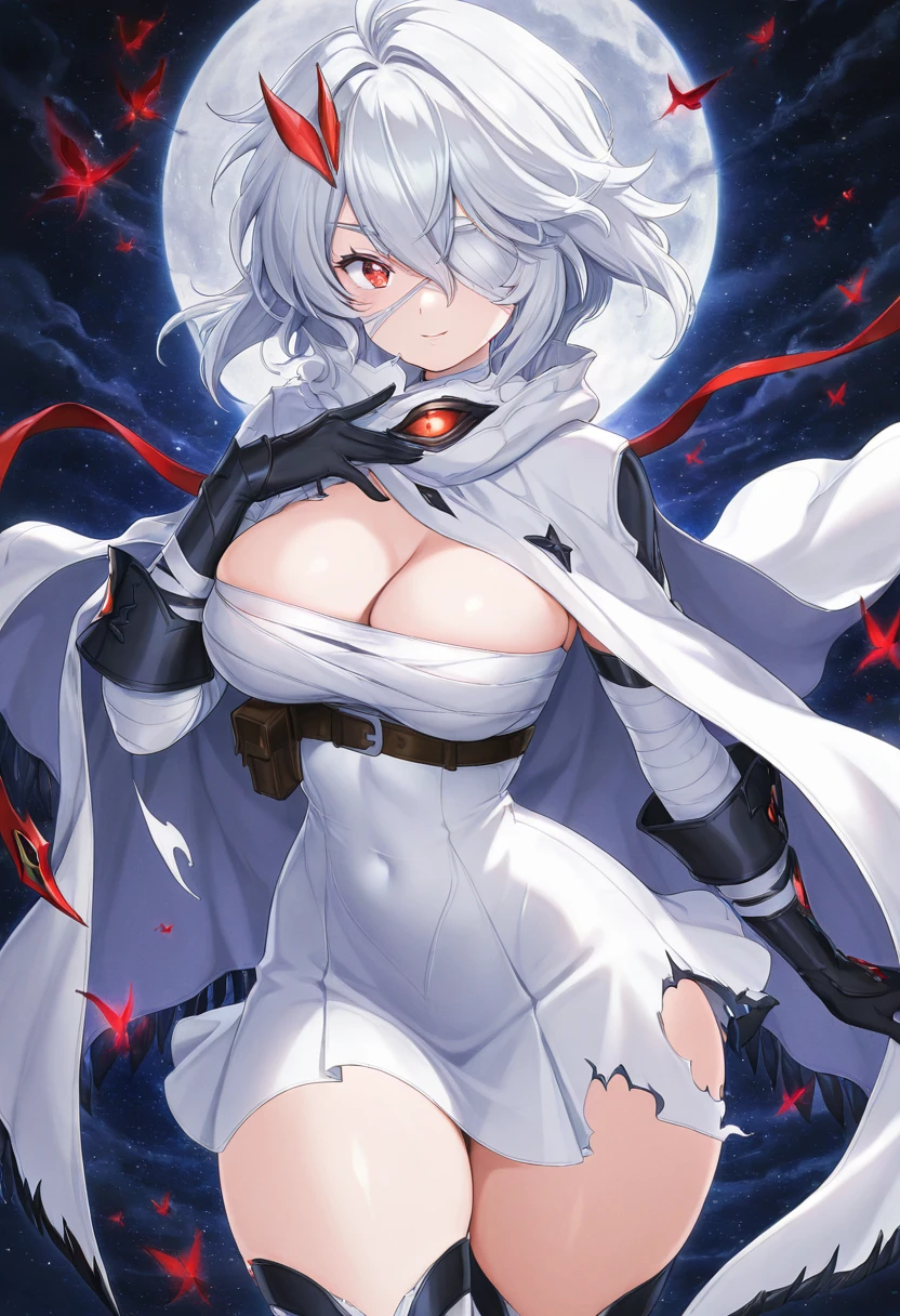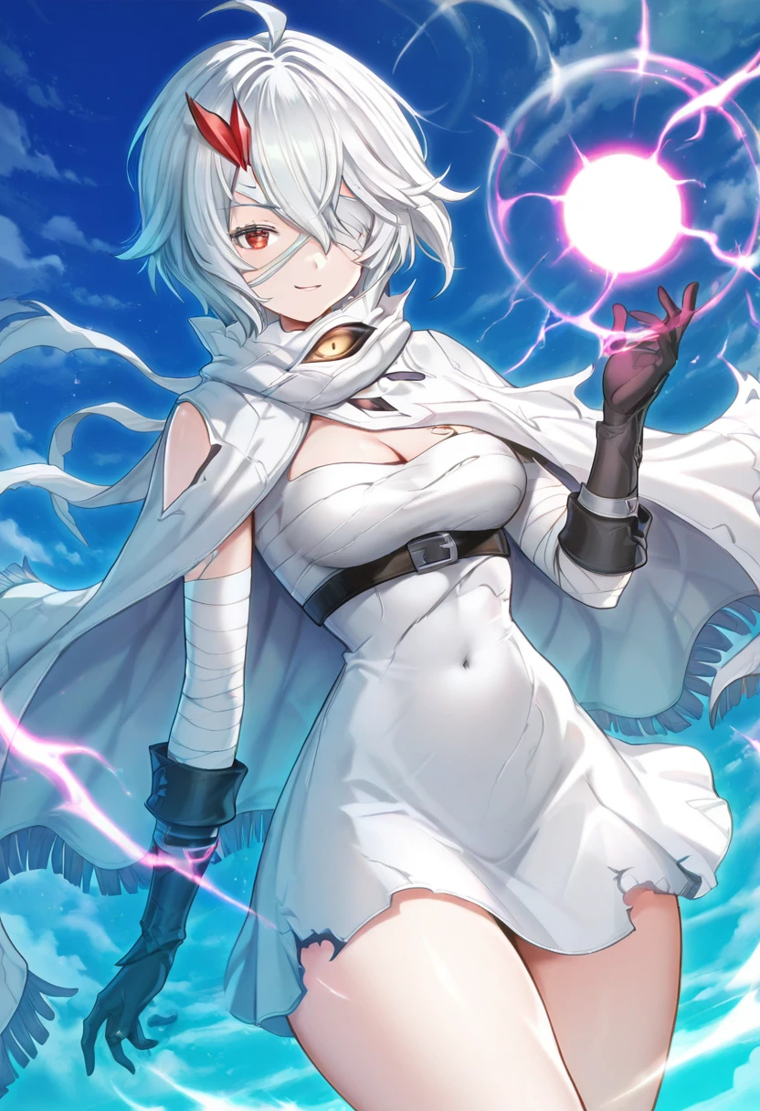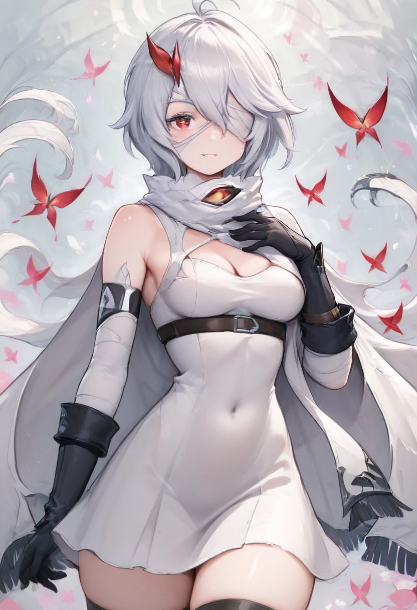 zzPhoxhunter, red eyes, white hair, short hair, bangs, hair ornament, red eyes, hair between eyes, ahoge, bandage over one eye, black gloves, bandages, white dress, torn clothes, bandaged arm,