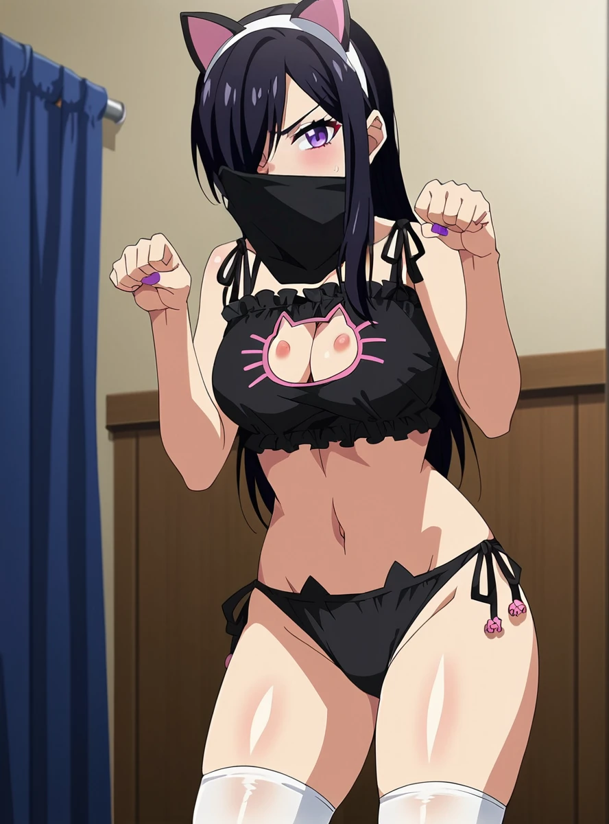 Prompts: black coat, one eye covered,boots,high collar,covered mouth ,mouth mask,mask,black gloves,hair over one eye,gloves,long hair,purple eyes,