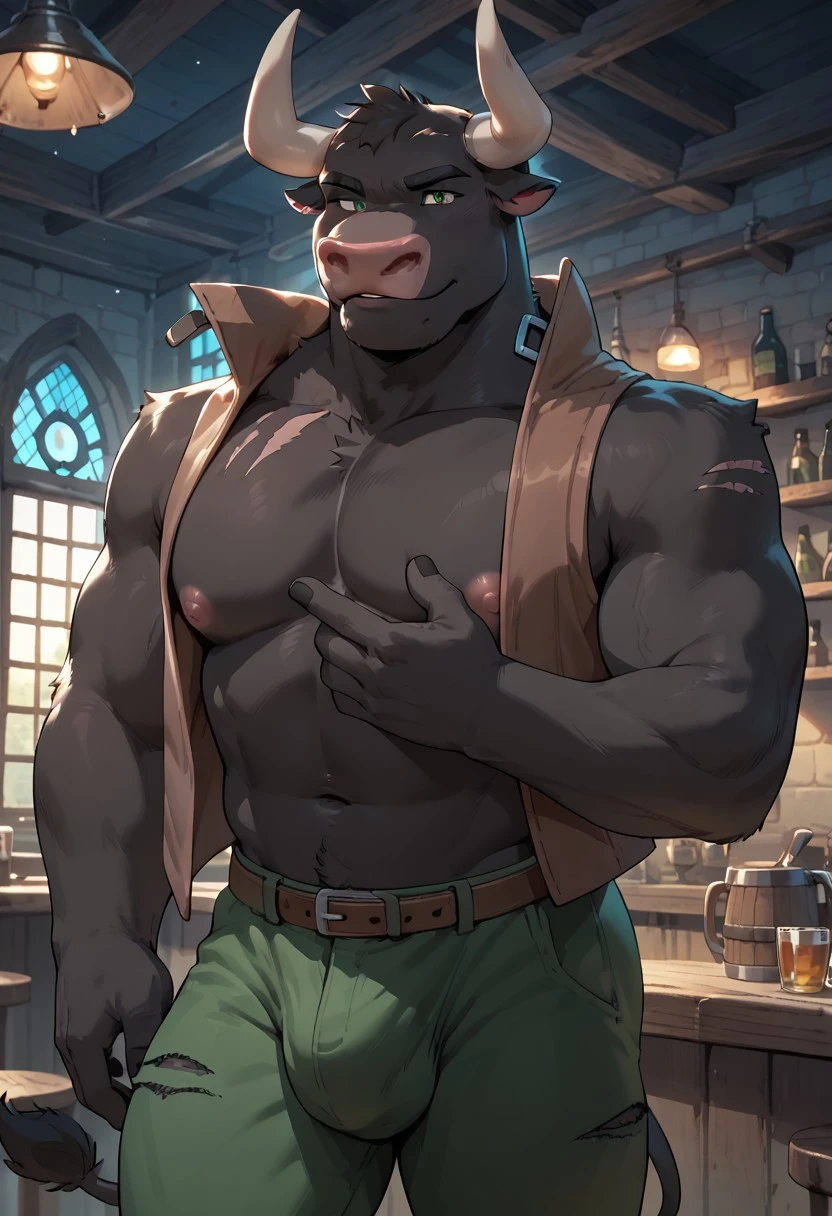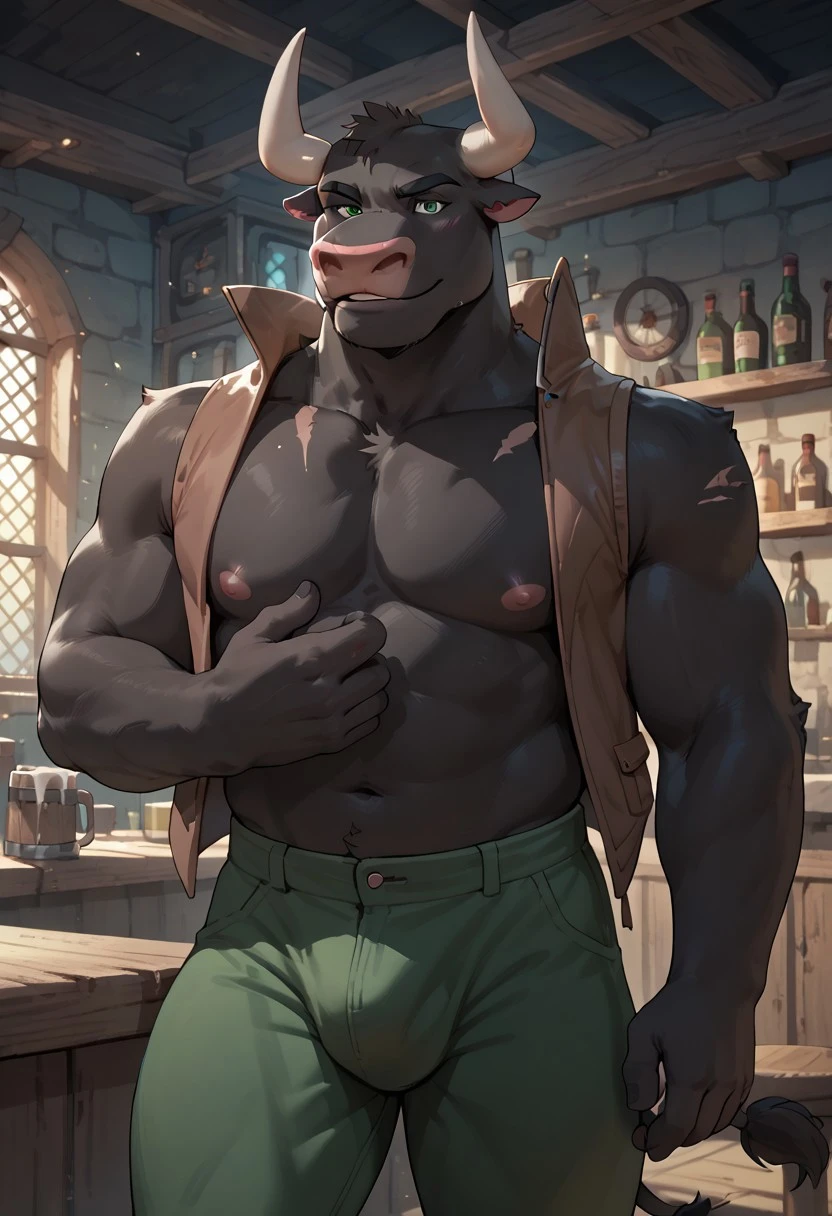Reinforcement tags: green pants, brown vest, dark brown belt, green eyes, pants down, flaccid ????, ????? cock