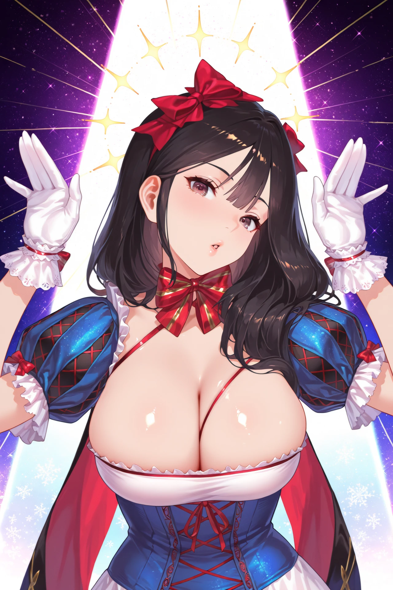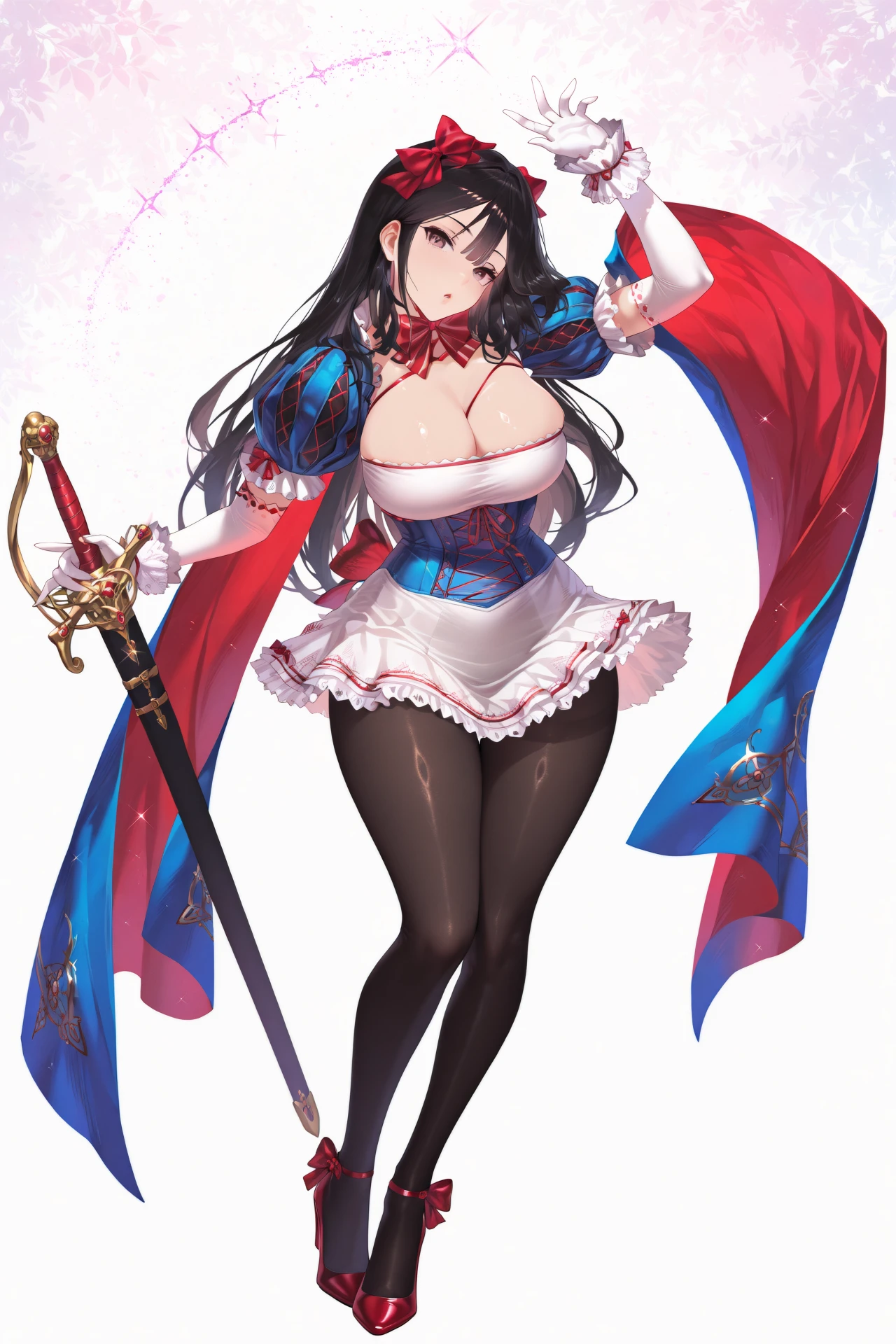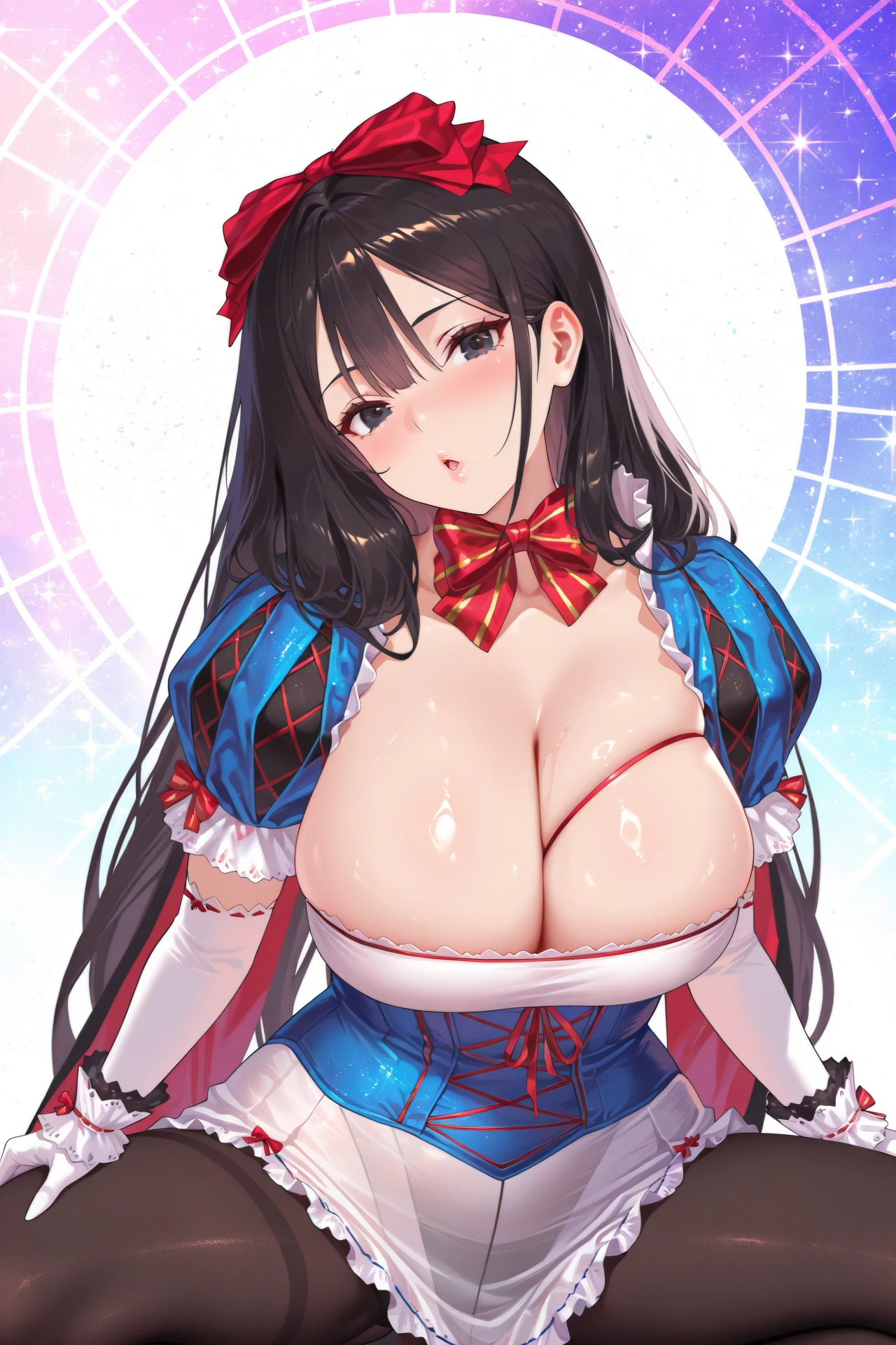 ventanadef, 1girl, breasts, solo, gloves, white gloves, long hair, cleavage, black hair, pantyhose, elbow gloves, looking at viewer, bow, red bow, puffy short sleeves, large breasts, short sleeves, puffy sleeves, dress, blush, simple background, bangs, black eyes, open mouth, hair bow, ribbon, huge breasts