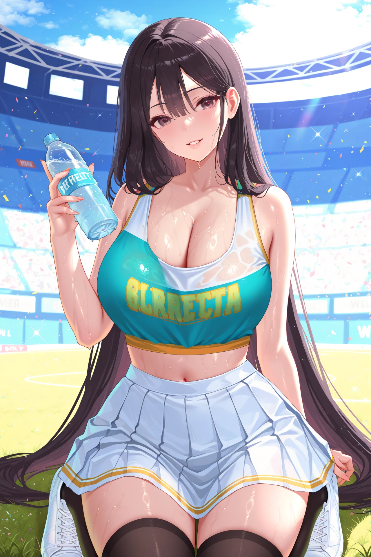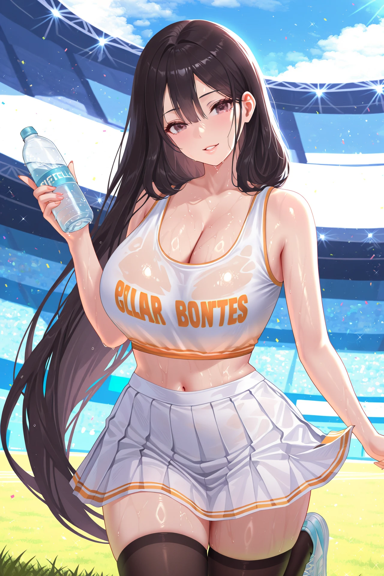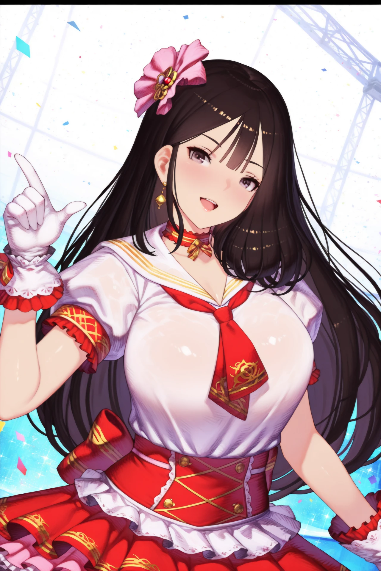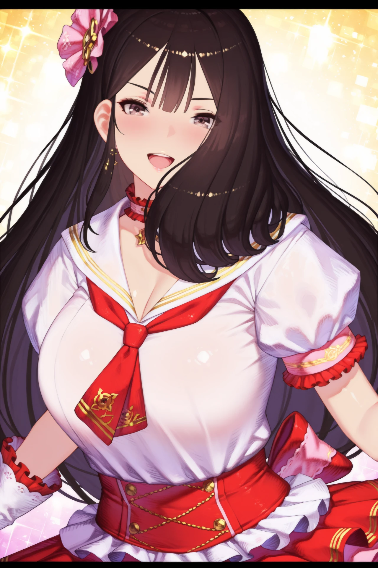 ventanaidol, 1girl, solo, long hair, open mouth, smile, gloves, looking at viewer, black hair, short sleeves, breasts, white gloves, hair ornament, sailor collar, letterboxed, necktie, skirt, puffy short sleeves, puffy sleeves, idol, bangs, :d, large breasts, choker, frills