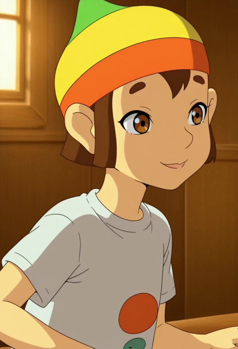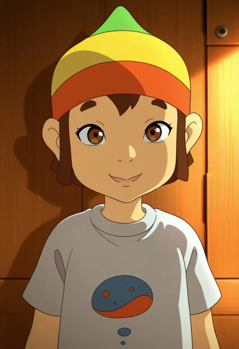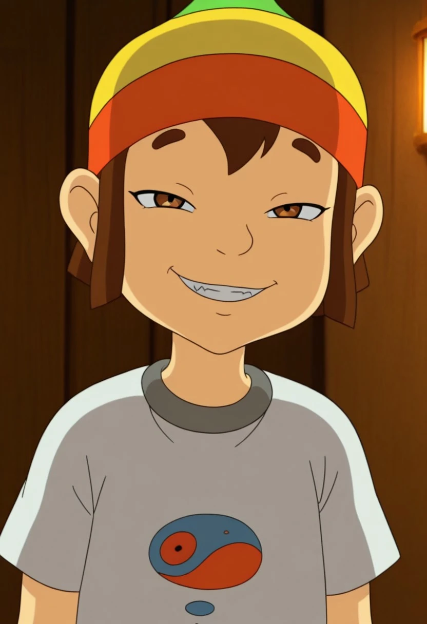 Josh Illus, solo, 1boy, Brown eyes, brown hair, multicolor hat, light grey shirt, dark grey pants, white shoes