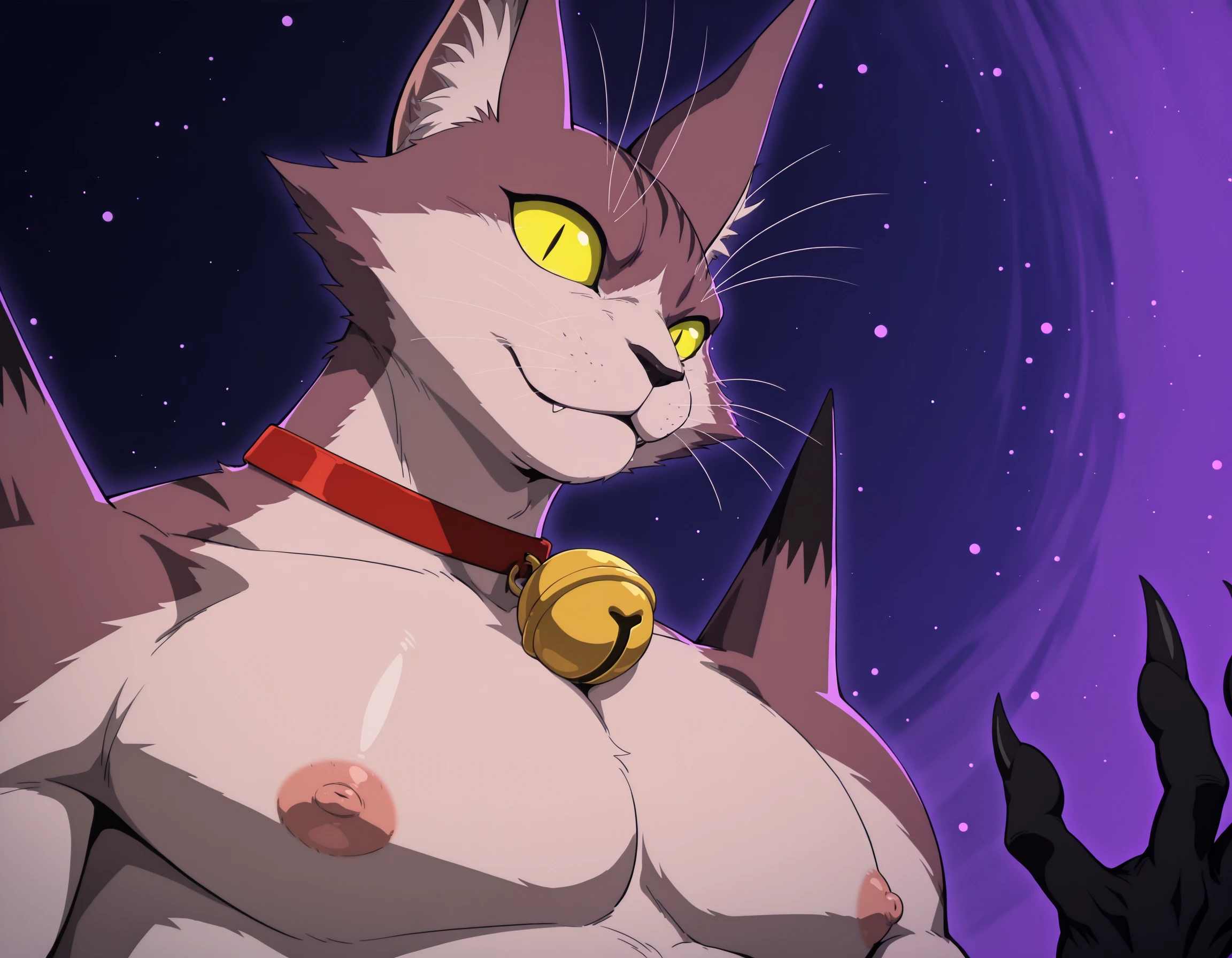 nyan, cat, furry, neck bell, slit pupils, Spike shoulders, yellow eyes, collar, tail, claws, black hands, brown fur