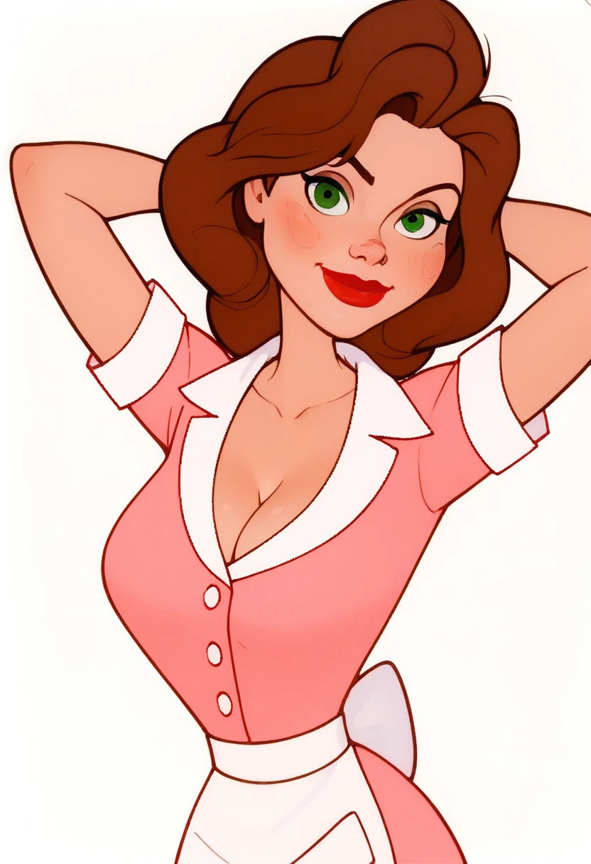 Triggerwords: anniehughesxl, brown hair, red lips, green eyes, long hair,waitress outfit: waitress attire, white loafers, pink skirt, pink skirt,Description
