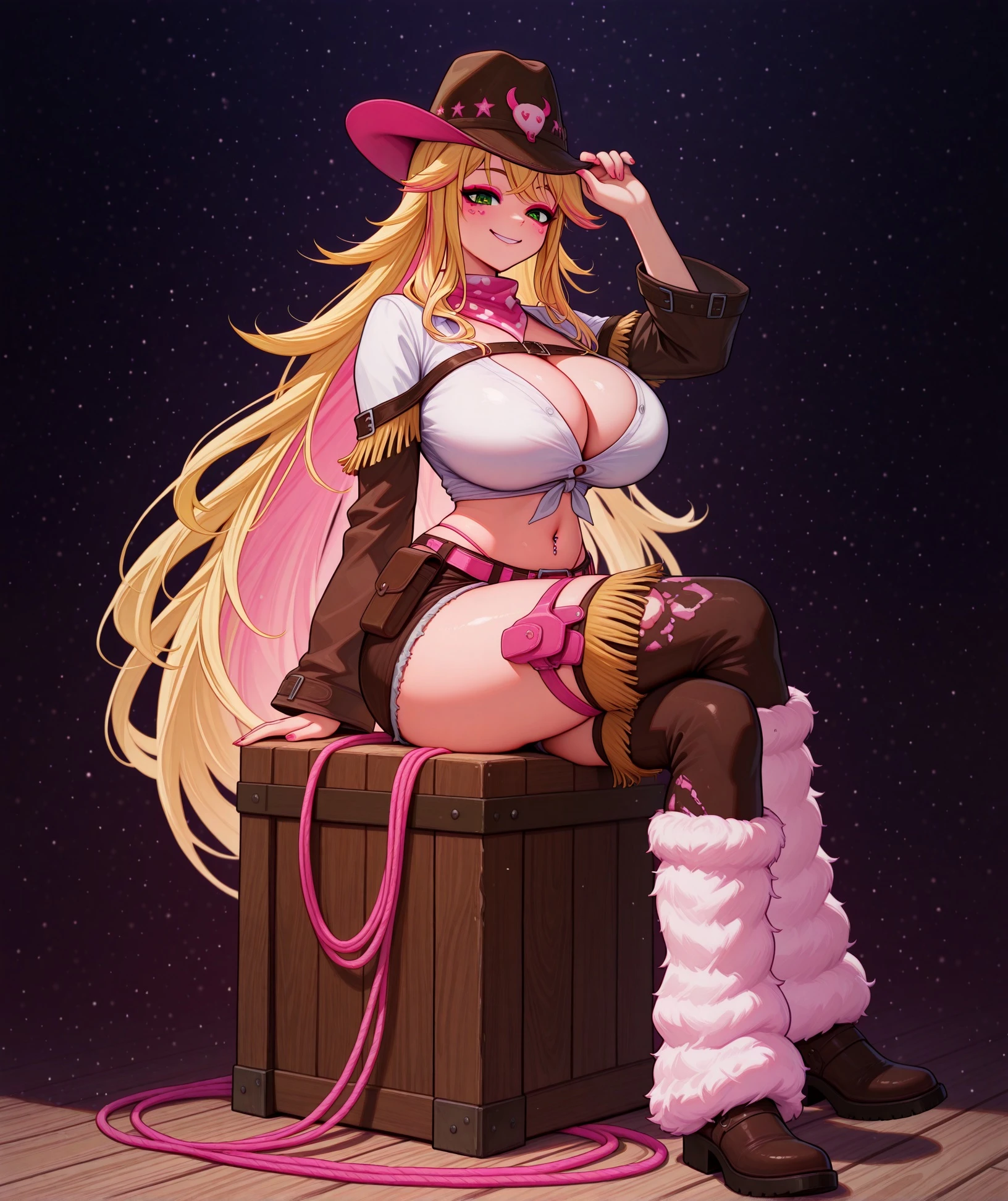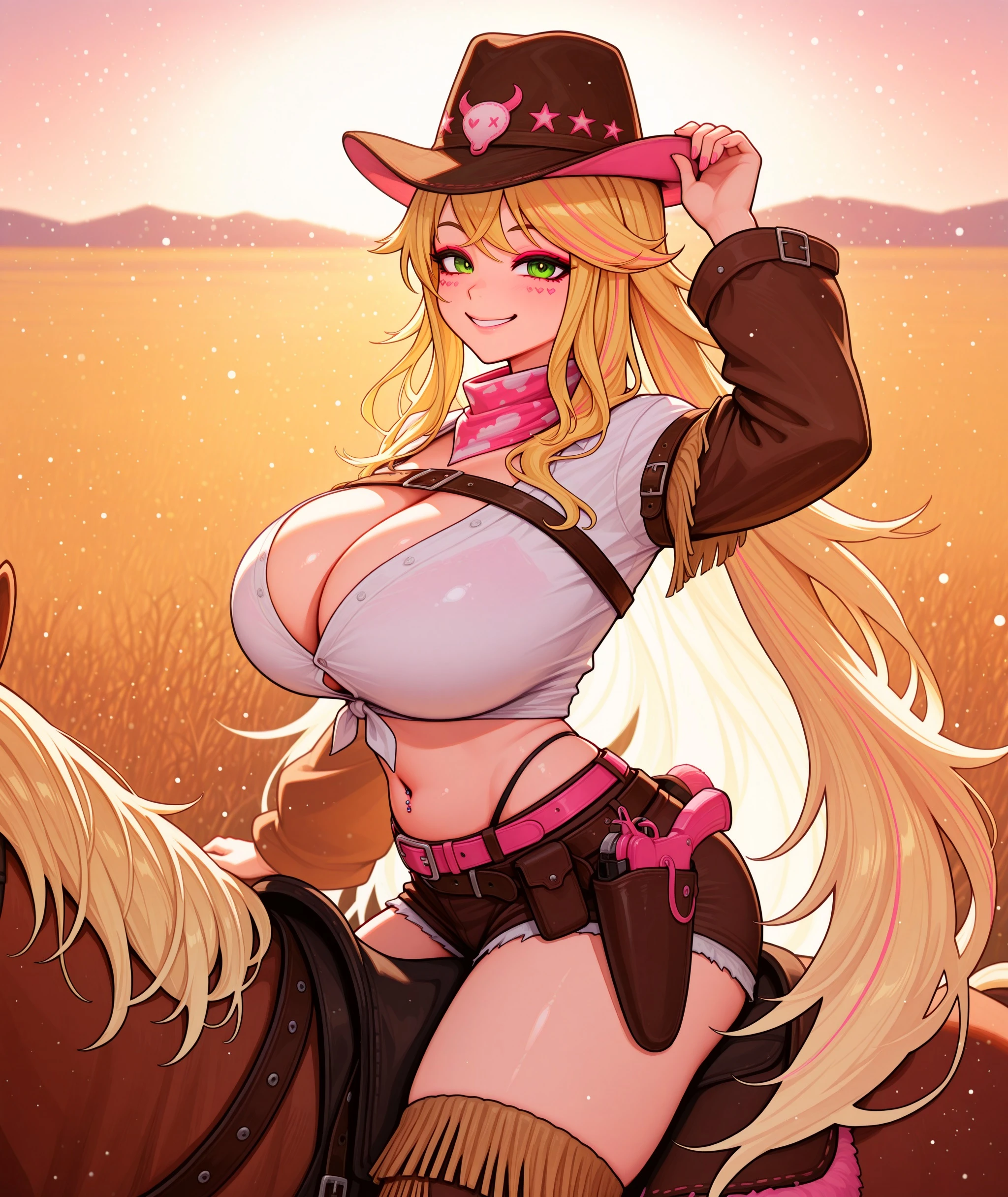 lsslu, very long hair, blonde hair, pink streaks, cowboy hat, green eyes, pink eyeshadow, heart facial marks, huge breasts, cleavage, chest belt, tied shirt, pink nails, navel piercing, shorts, belt, cowboy fringe thighhighs, boots, pink gun, brown holster, belt pouch, fluffy socks, brown sleeves, cowboy westernThe fluffy socks tag might sometimes end up giving the boots a fur trim instead, so if you don't plan on showing off anything below her thighs, you can ignore that tag or add it to negatives.