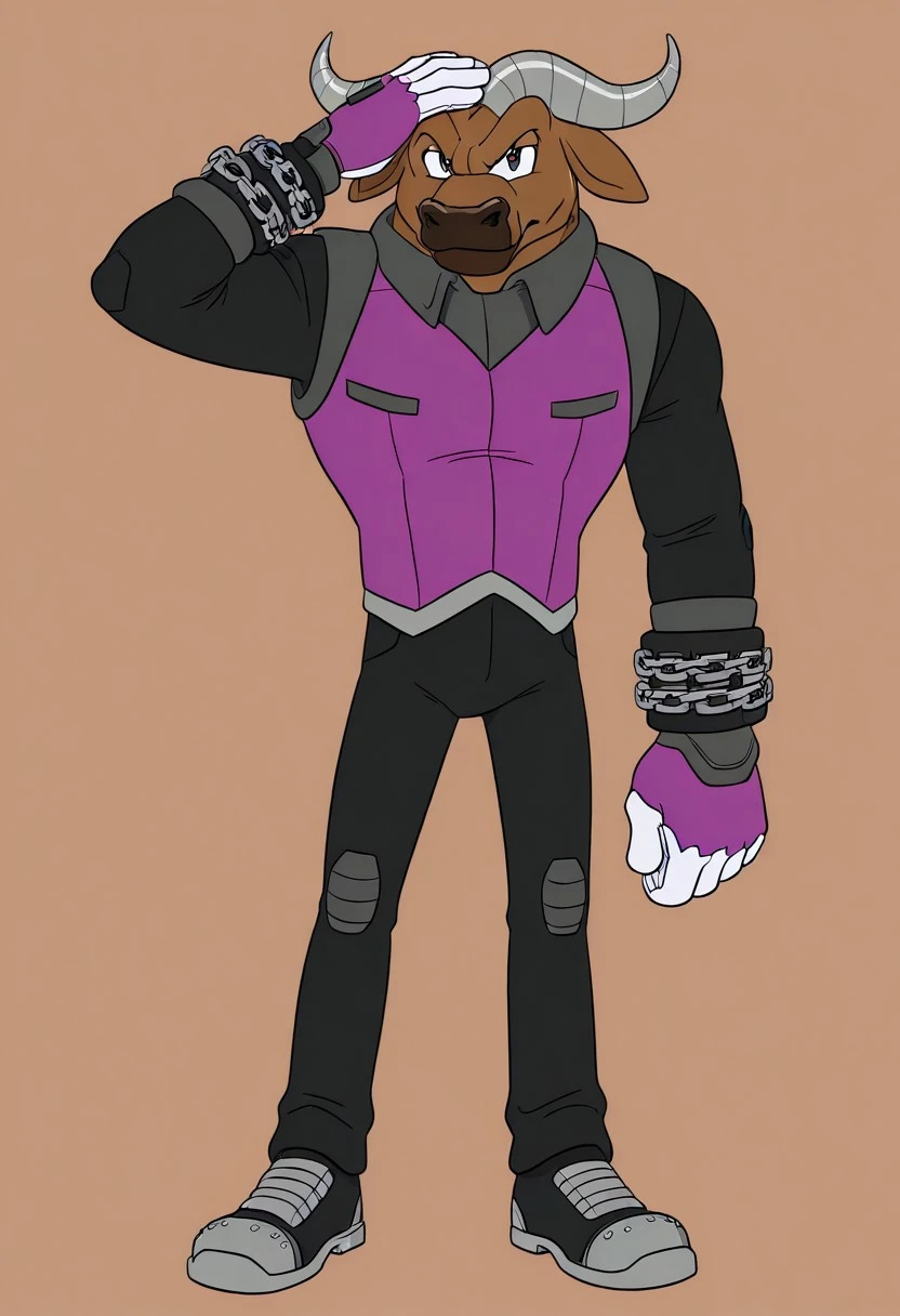 Axel the Water Buffalo, brown skin, dark brown snout, gray horns, brown eyes, purple vest, black pants, black wristbands, purple and white gloves, black shoes