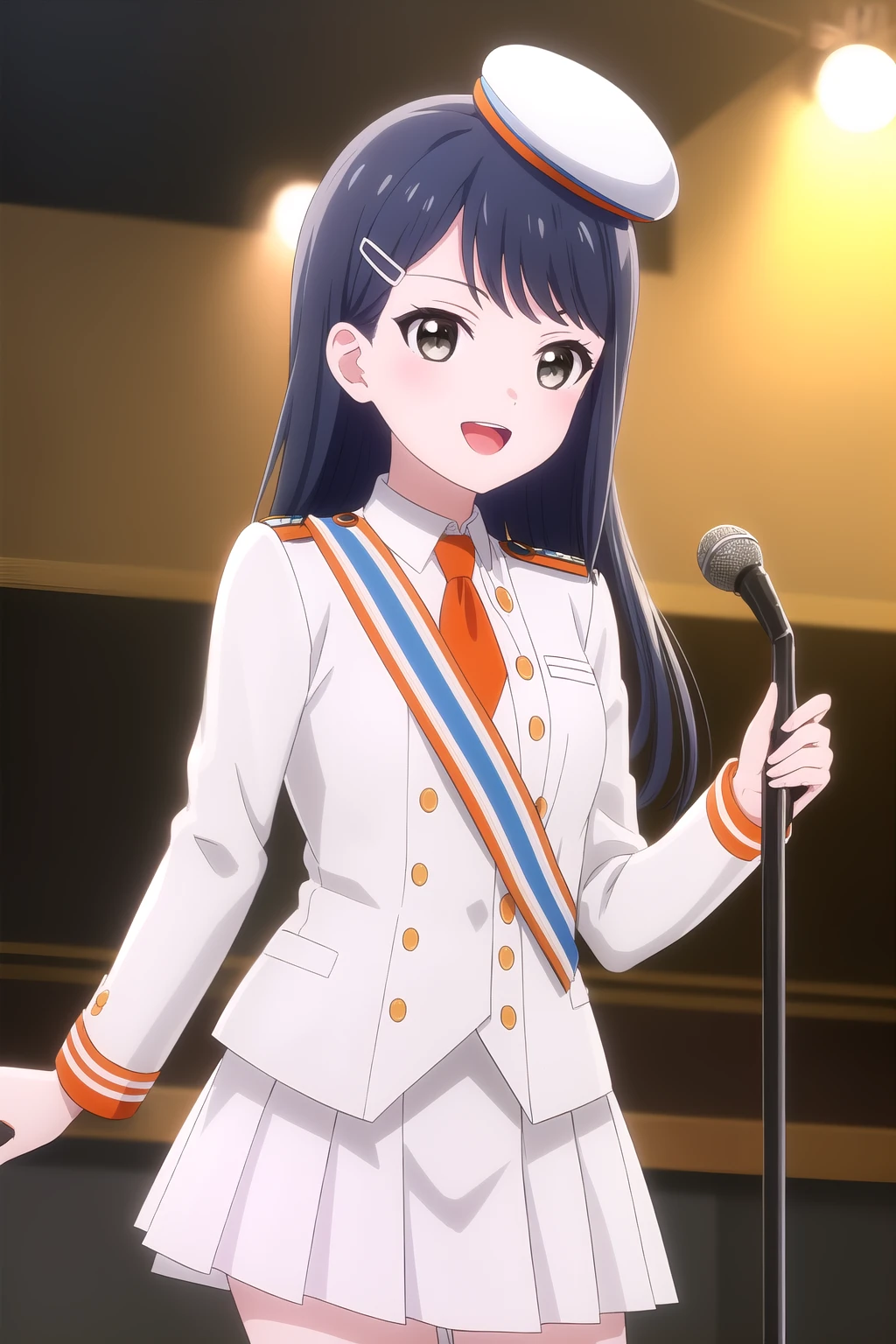 idol, beret, white headwear, epaulettes, white jacket, white shirt, orange necktie, sash, buttons, long sleeves, white skirt, frilled skirt, miniskirt, pleated skirt, layered skirt, idol clothes