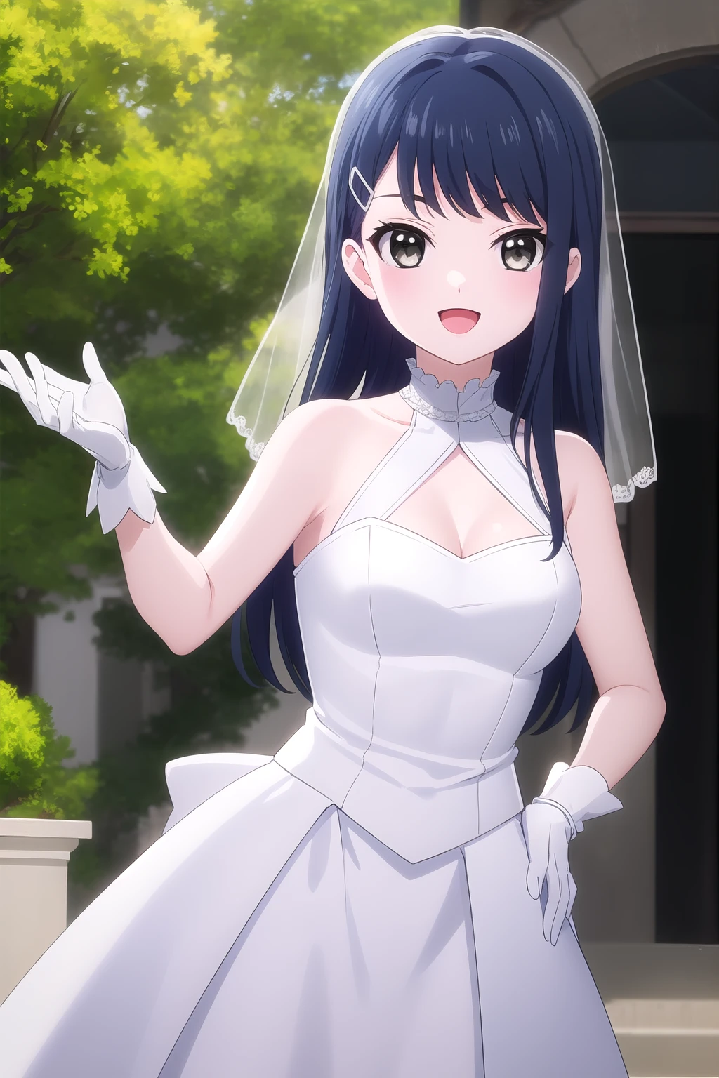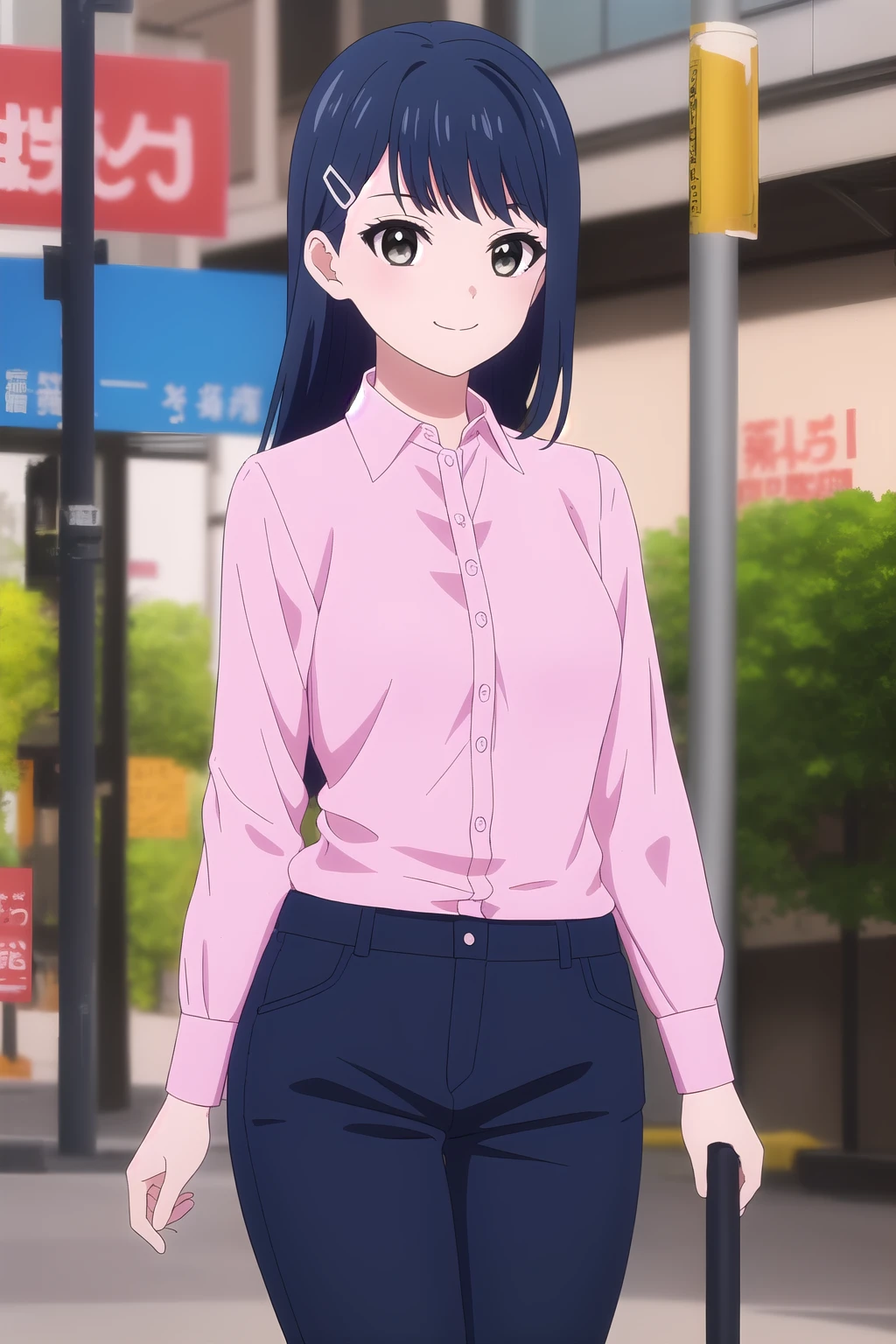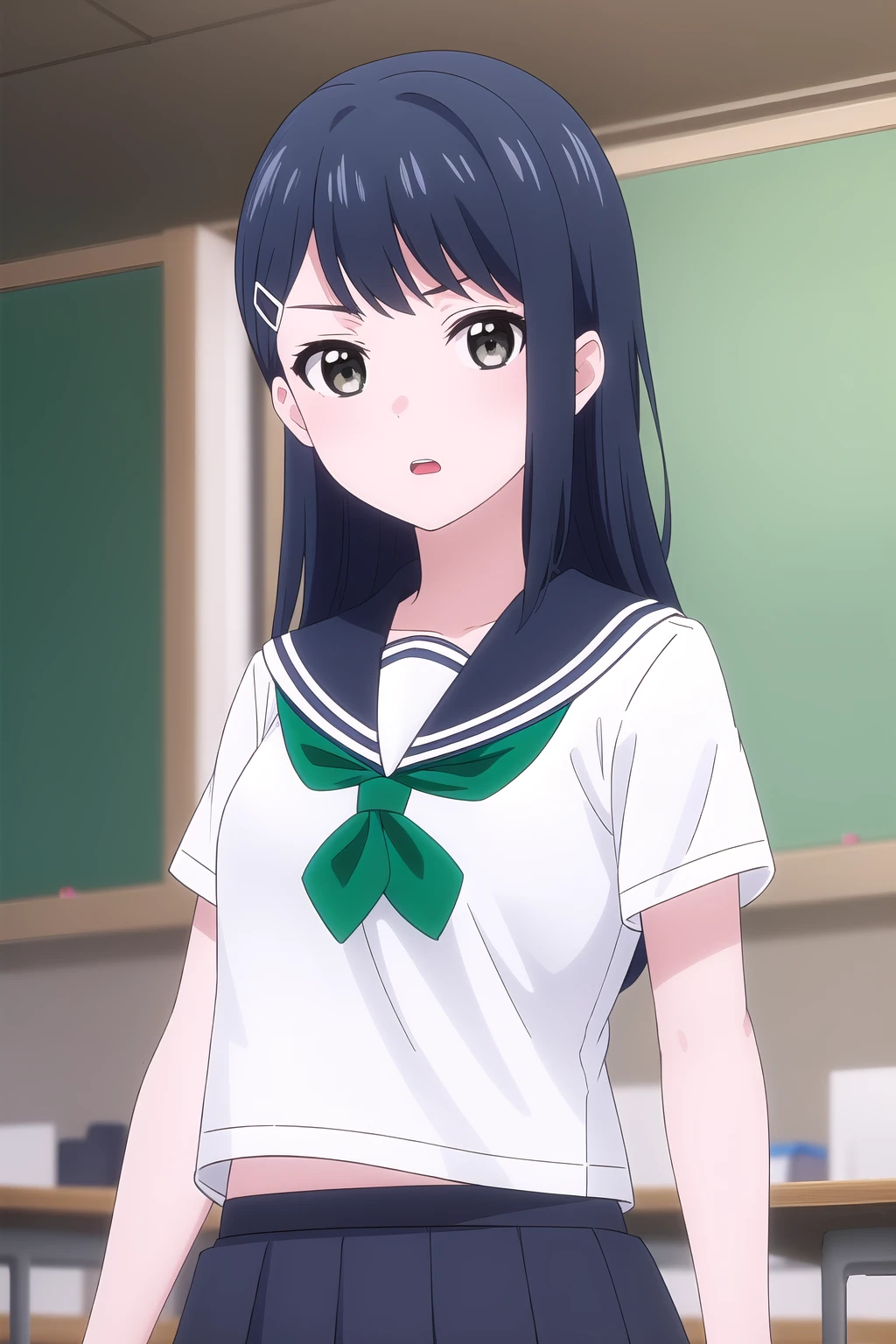 dark blue hair, swept bangs, hairclip, very long hair, grey eyes