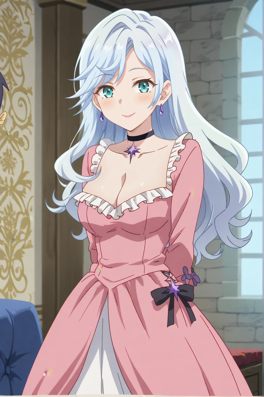 Triggers : esri tuatha dé,,long hair,black chocker,breasts,cleavage,earrings,jewelry,dress