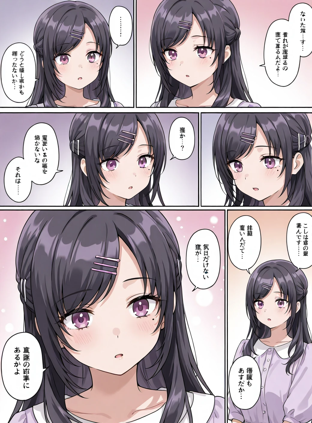 black hair,long hair,hairclip,purple eyes,swept bangs,mole under eye,COMIC