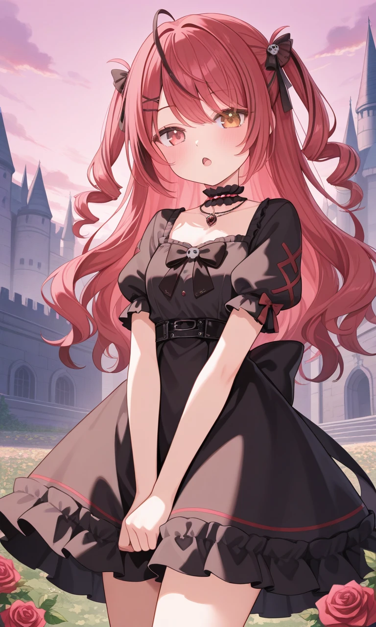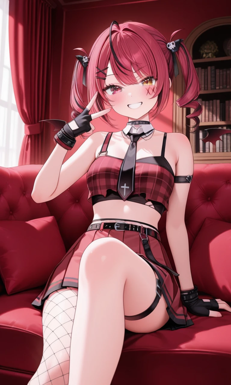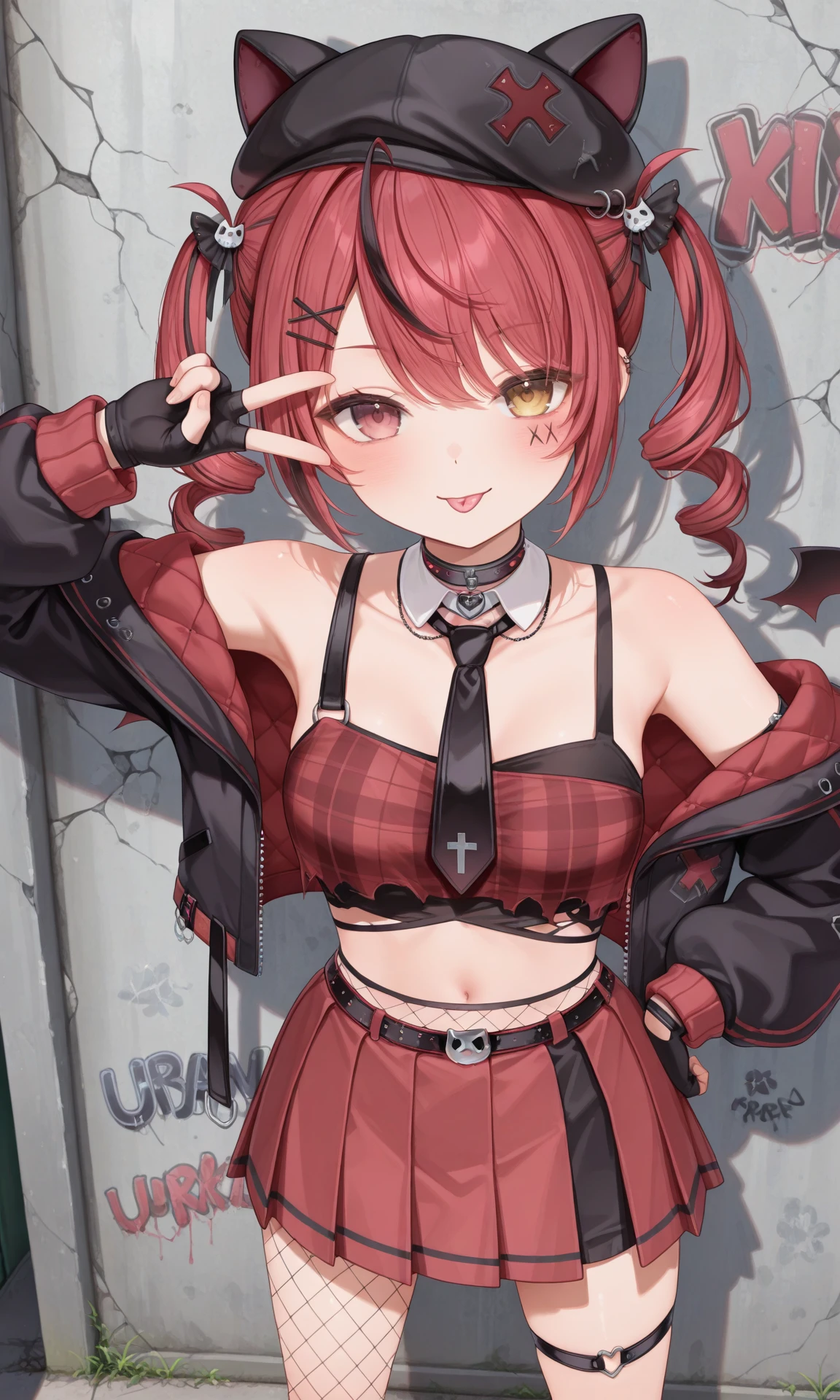 akairo mia, twin drills, cat hat, x hair ornament, hairclip, facial mark, detached wings, black choker, detached collar, black necktie, red crop top, plaid crop top, fingerless gloves, black gloves, black jacket, belt, red skirt, pleated skirt, thigh strap, (asymmetrical legwear:0.6), (single fishnet pantyhose)😈Dear13ro outfit :