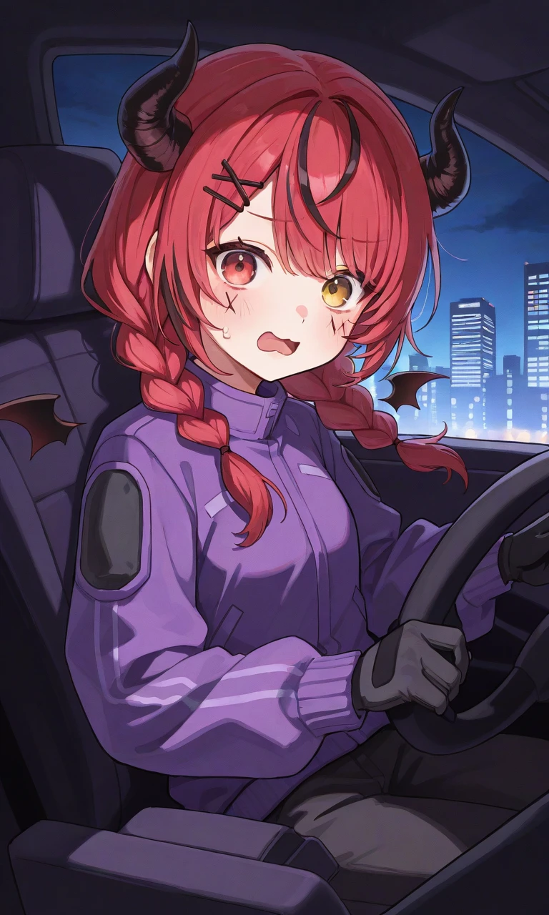 mia dear13ro, low twin braids, demon horns, x hair ornament, hairclip, facial mark, detached wings, purple jacket, closed jacket, black gloves, black pants🕷️old outfit :