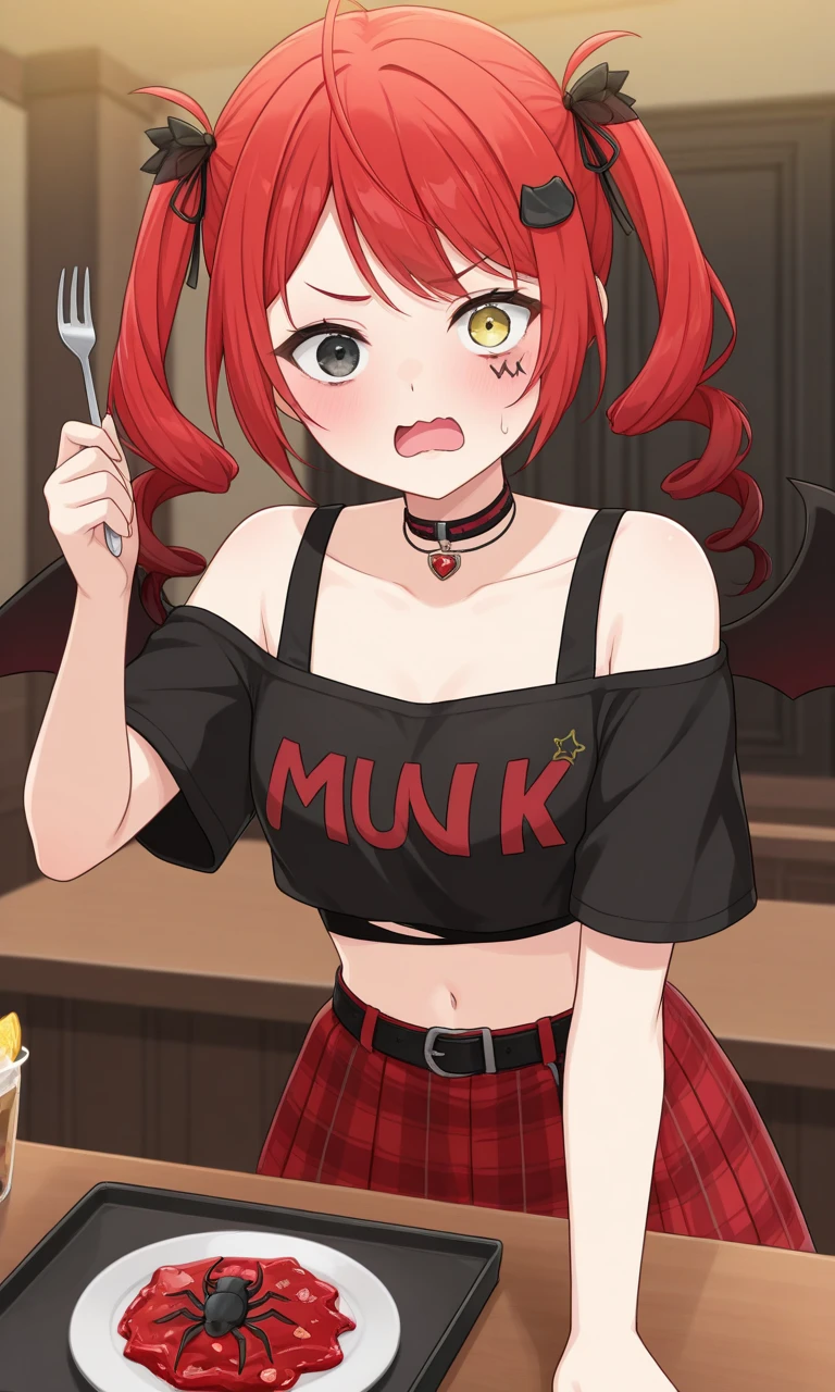 mia legacy, twin drills, hair ribbon, cat hair ornament, facial mark, demon wings, choker, black shirt, off-shoulder shirt, short sleeves, midriff, navel, black belt, red skirt, plaid skirt