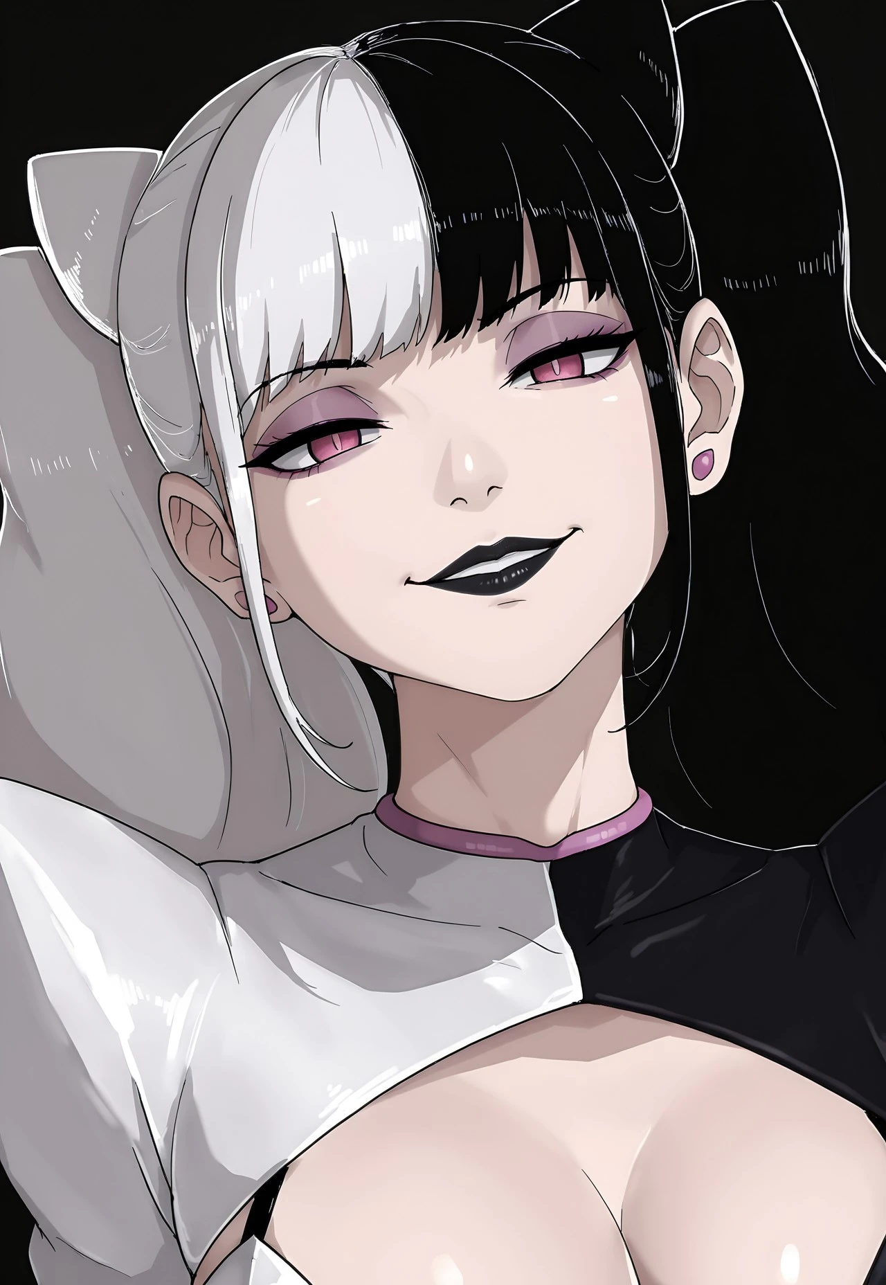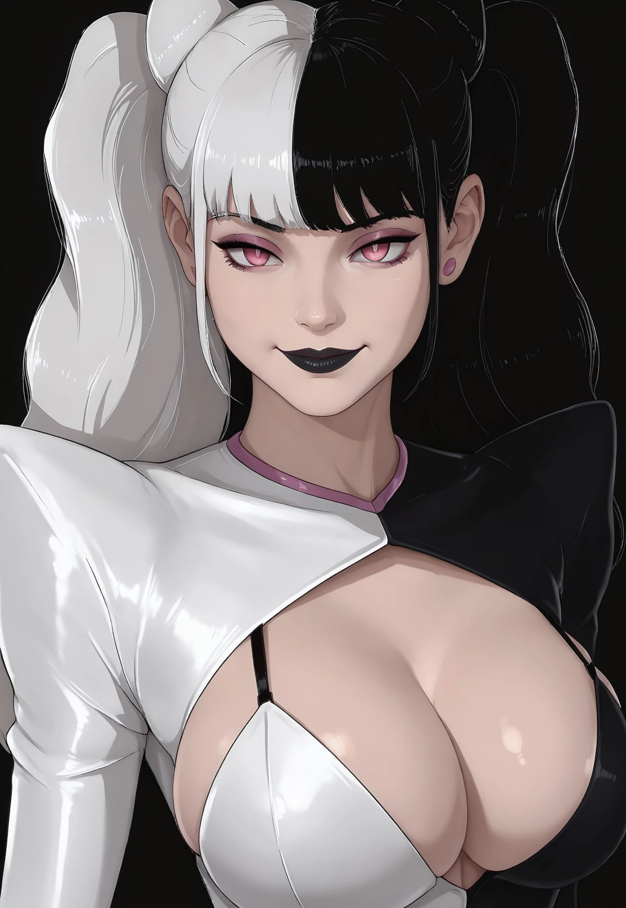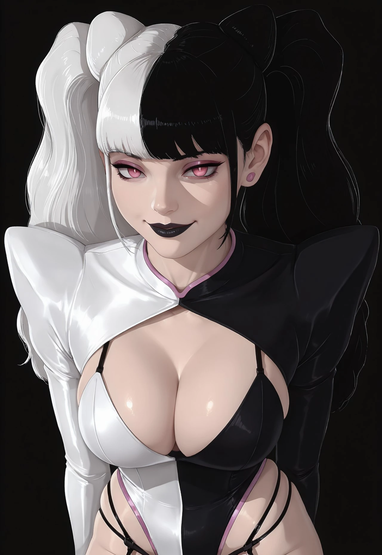 JokerVO, 1girl, split hair, black and white hair, long hair, twin tails, pink eyes