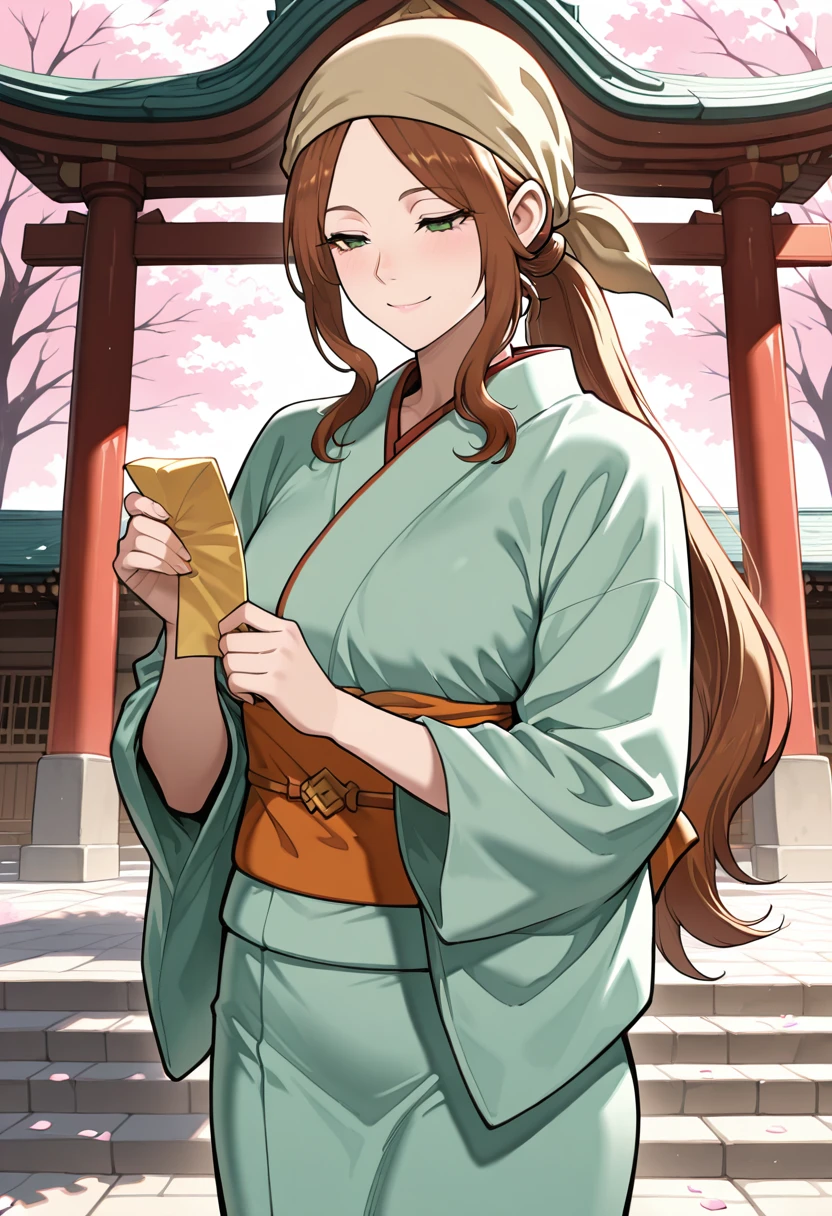 NohrVillager, brown hair, long hair, long ponytail, long sidelocks, green eyes,