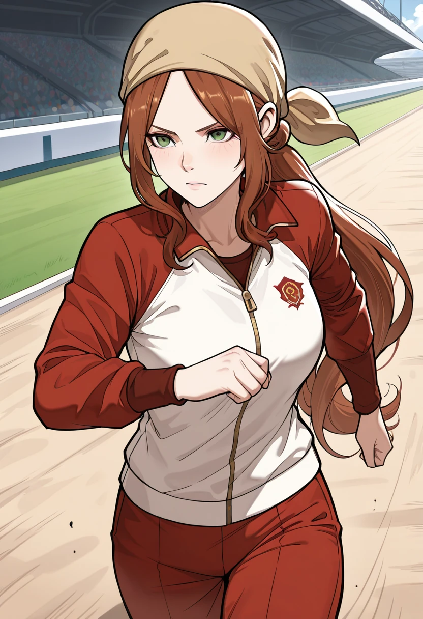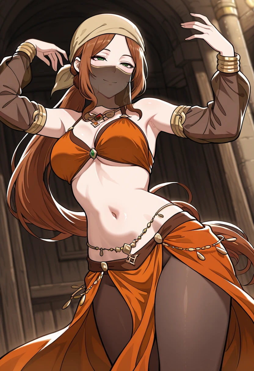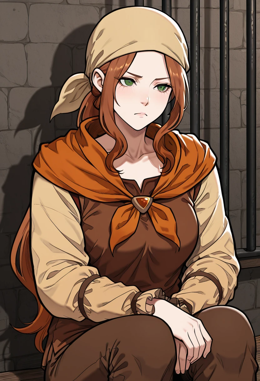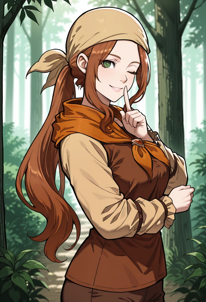 Trigger Words (Outfit): beige bandana, orange neckerchief, brown shirt, beige sleeves, frilled sleeves, pants,