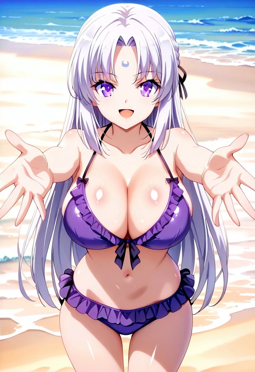 jinguuji kuesu. white hair, Purple eyes, long hair, parted bangs, sidelocks, forehead mark, bangs