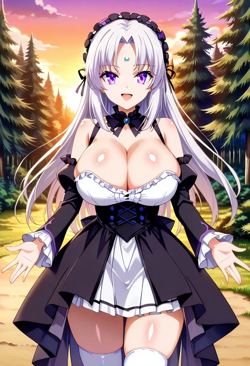 Black Dress, Frilled Dress, White top, white pleated Skirt, hairband, frills, Frilled sleeves, bare shoulders, blue jeweled collar, white thigh highs, Headdress, detached sleeves, jewelry