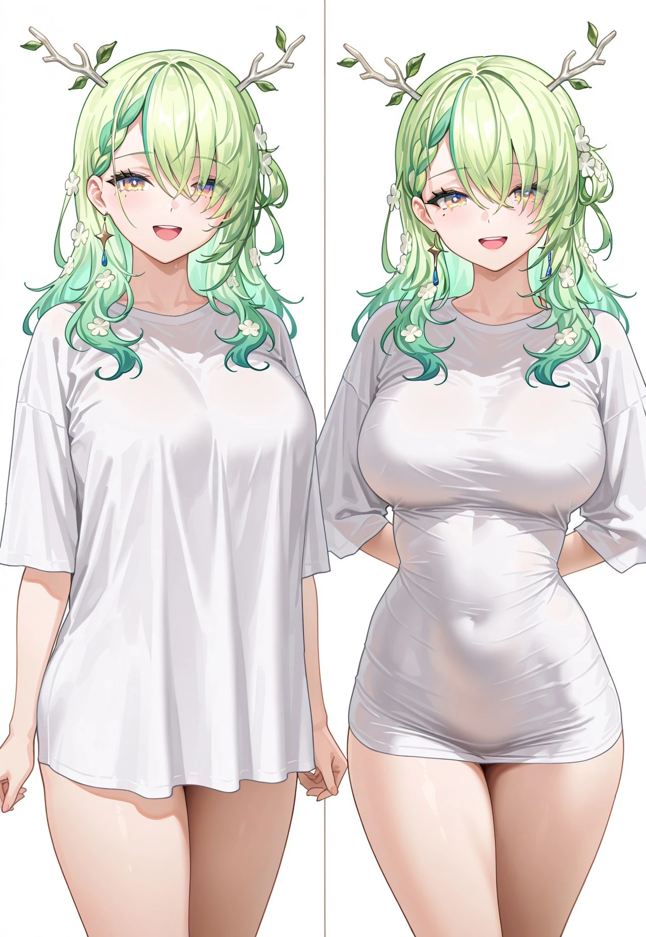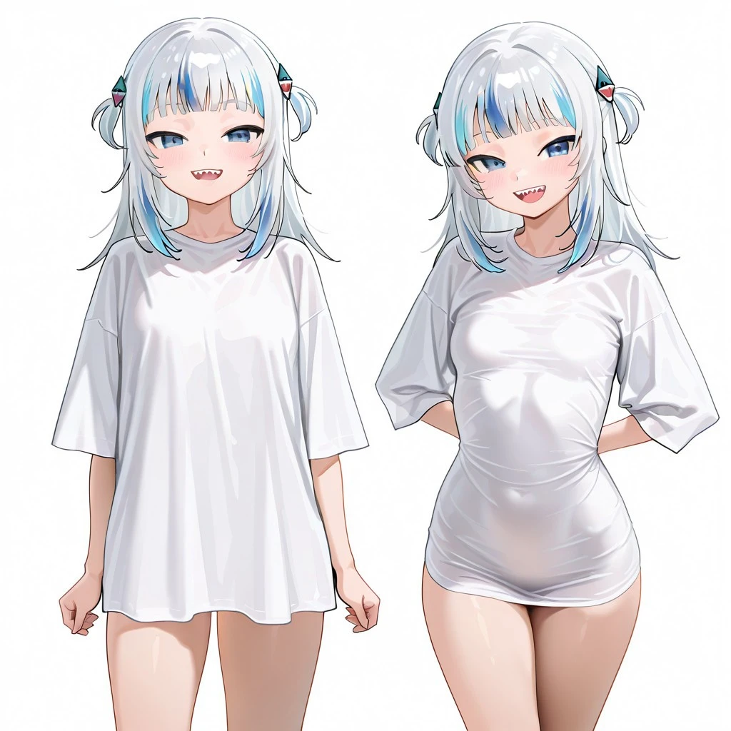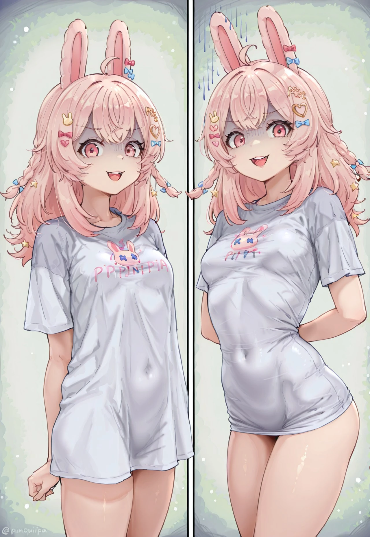 pajamasChallenge, 1girl, multiple views, shirt overhang, tight shirt, taut shirt, shirt, looking at viewer, open mouth, smile, arms behind back, upper teeth only, cowboy shot, ,