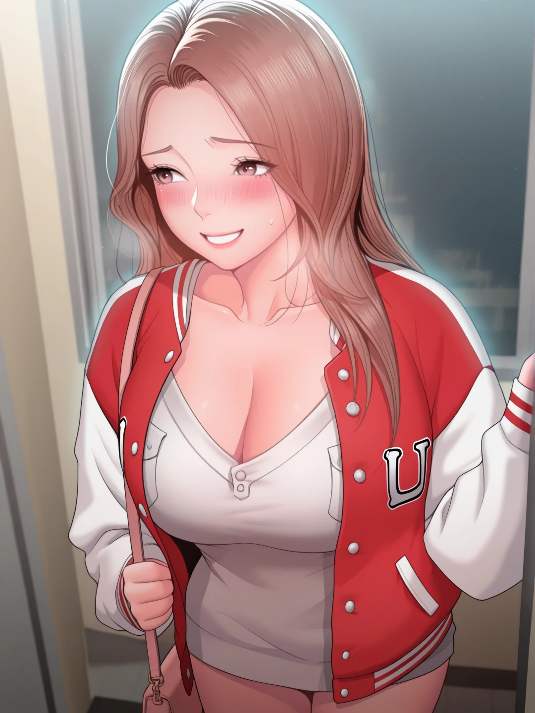 letterman jacket,handbag,white shirt,sleeves past wrists, (college outfit)