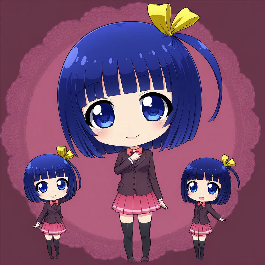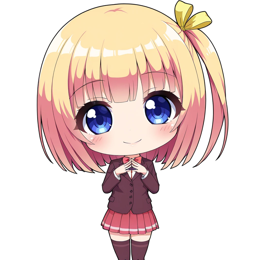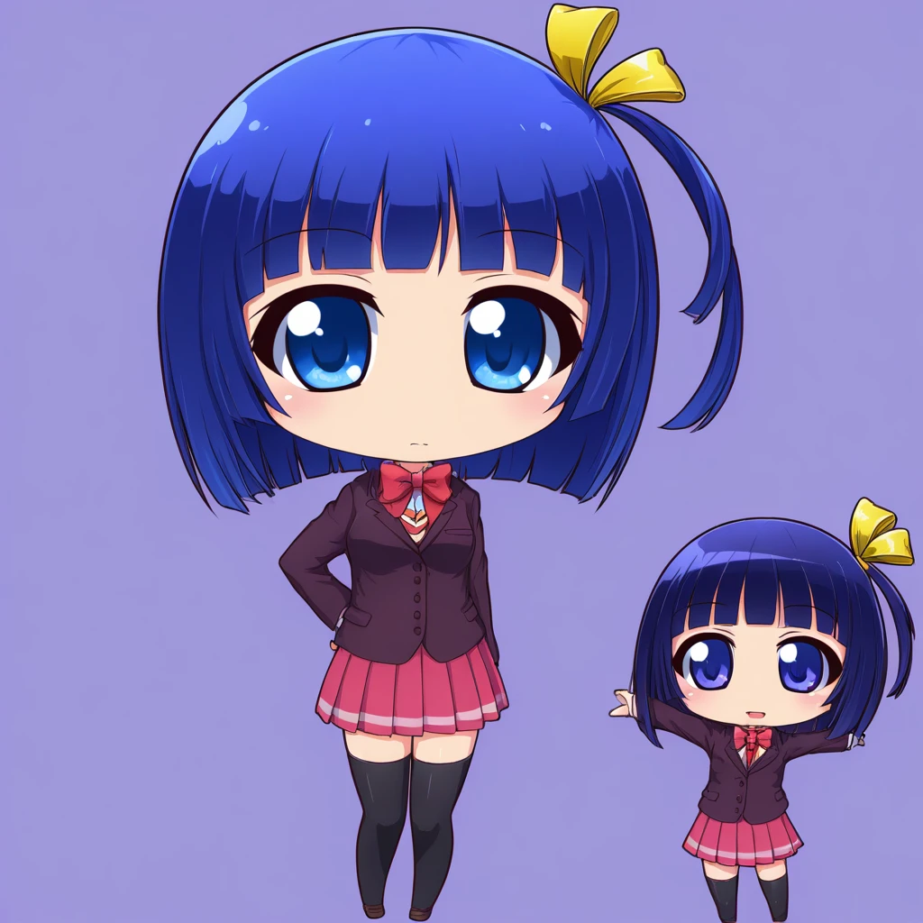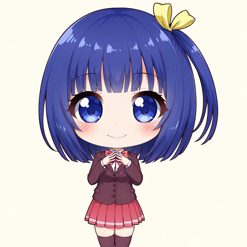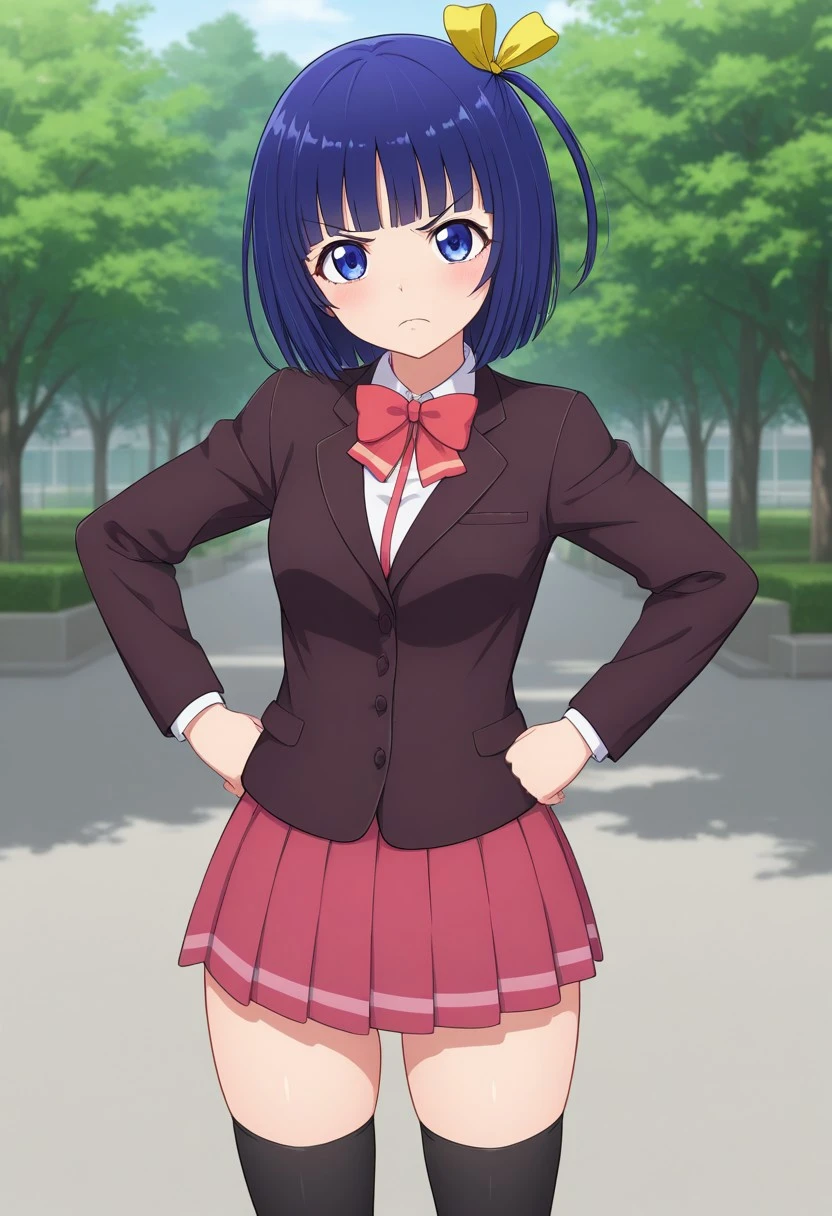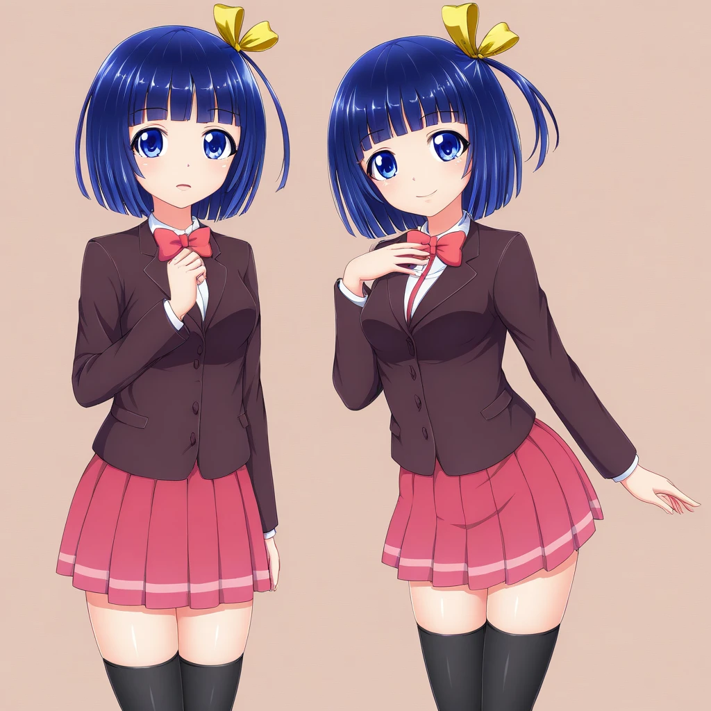 kasumiyande, 1girl, blue hair, short hair, blue eyes, one side up, ribbon, hair ribbon, school uniform, skirt, blazer, bow, jacket, pleated skirt, bowtie, thighhighs, black thighhighs,