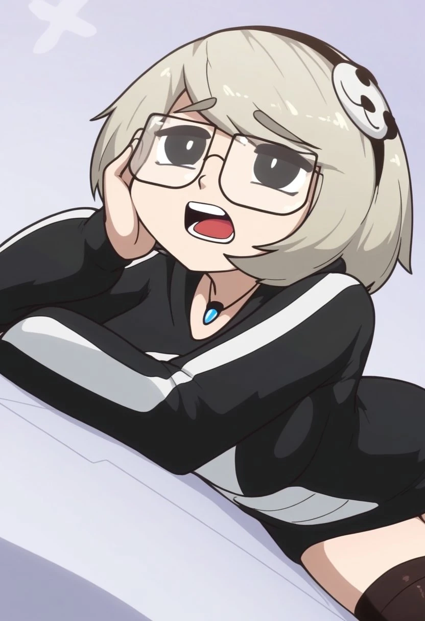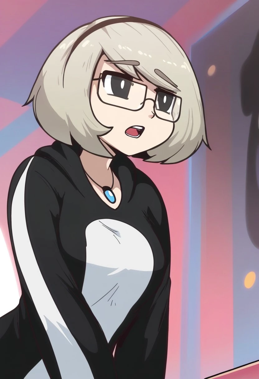 fiona_partygames, 1girl, solo, glasses, hoodie, hood, jewelry, short hair, hairband, open mouth, necklace, black eyes, black hoodie, upper body, swept bangs, hood down, teeth, black-framed eyewear, pendant, bangs, semi-rimless eyewear