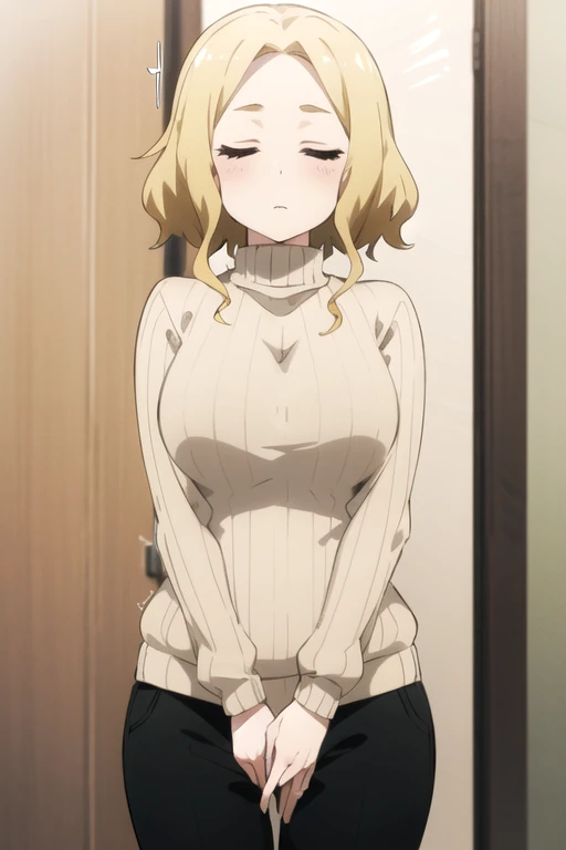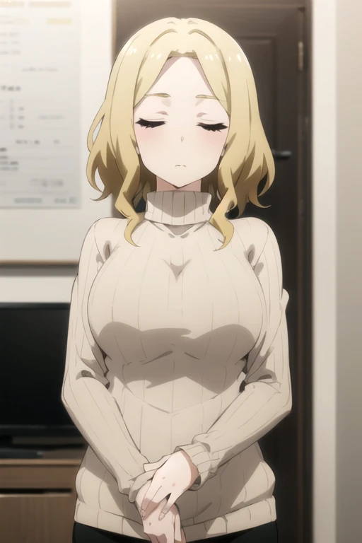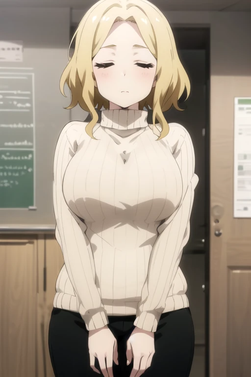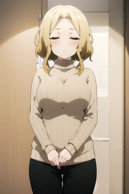 FutabaSaotome, 1girl, solo, short hair, blonde hair, large breasts, long sleeves, closed eyes, beige sweater, ribbed sweater, turtleneck sweater, black pants,