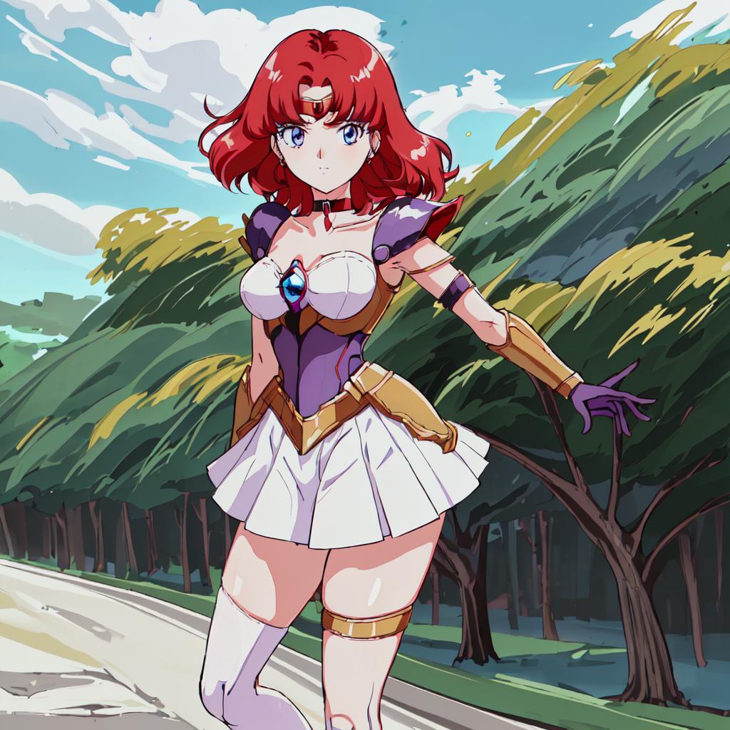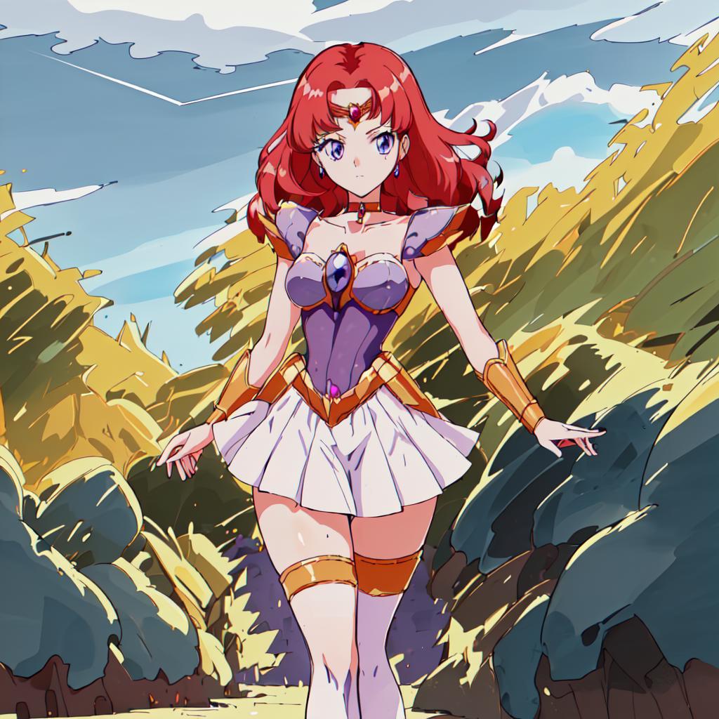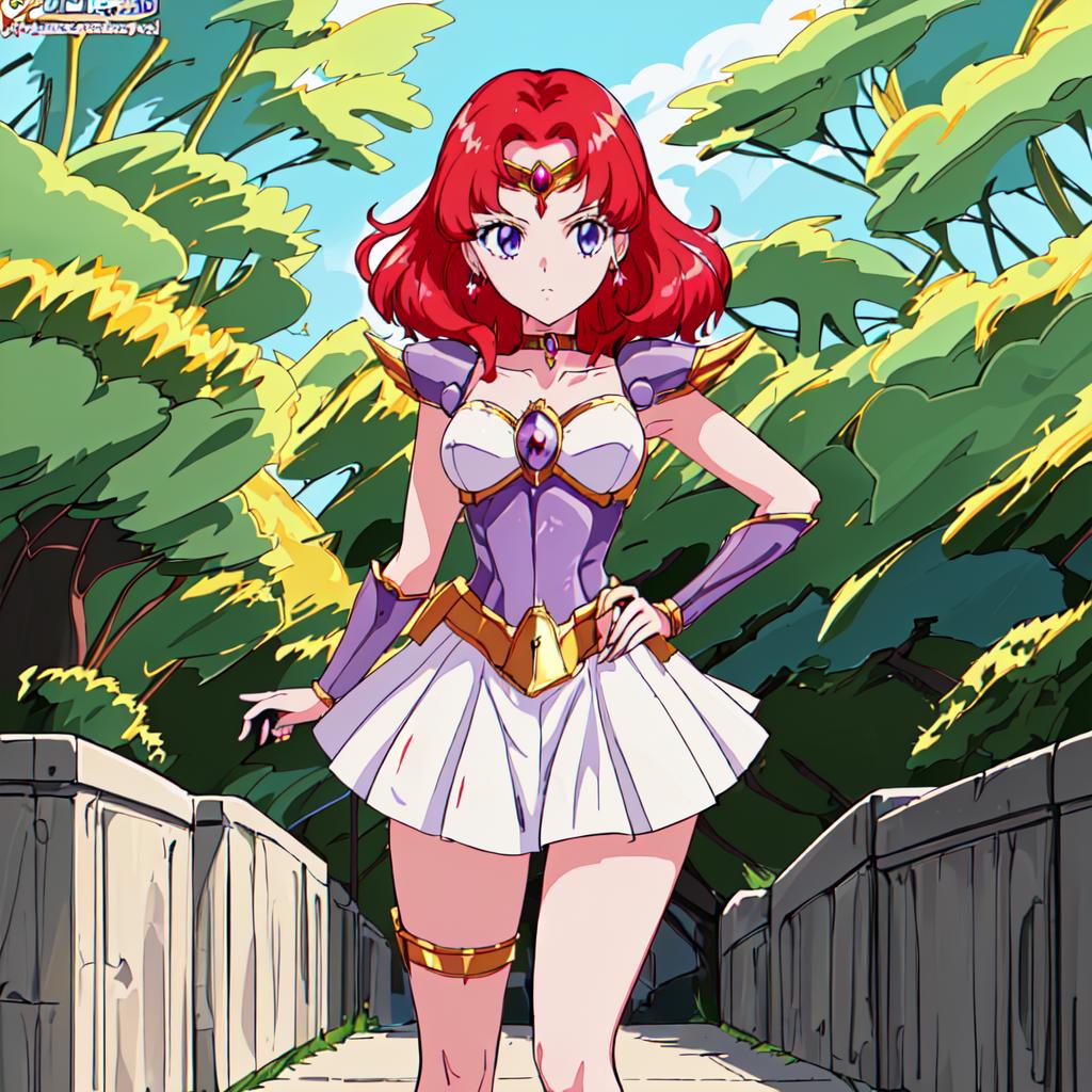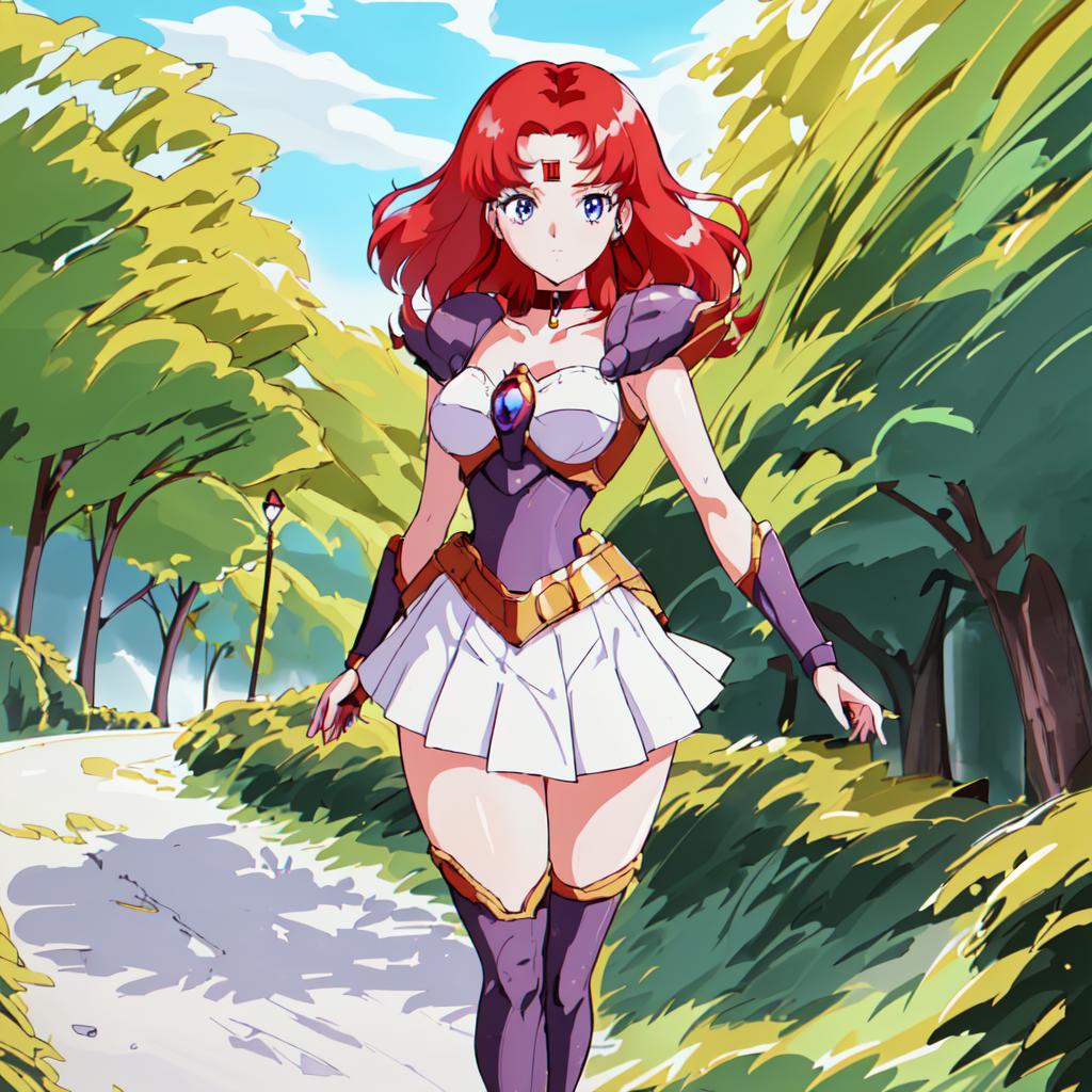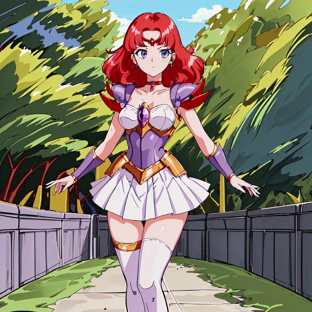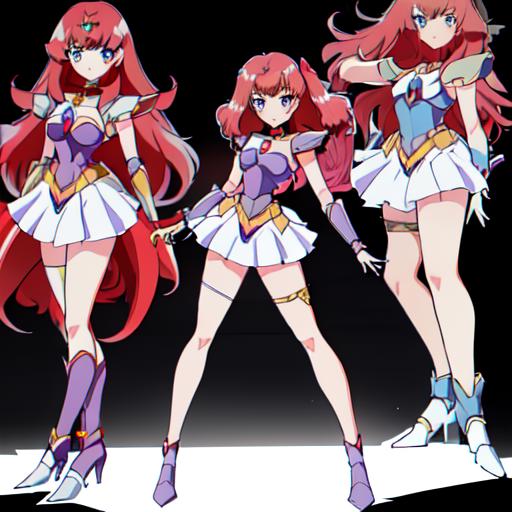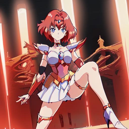 Scarlet_Ohara, 1girl, solo,blue eyes,jewelry, red hair, choker, miniskirt, white skirt,armor, high heels, white skirt, shoulder armor, pauldrons, purple thighlet, forehead,gold guntlet,gold tiara