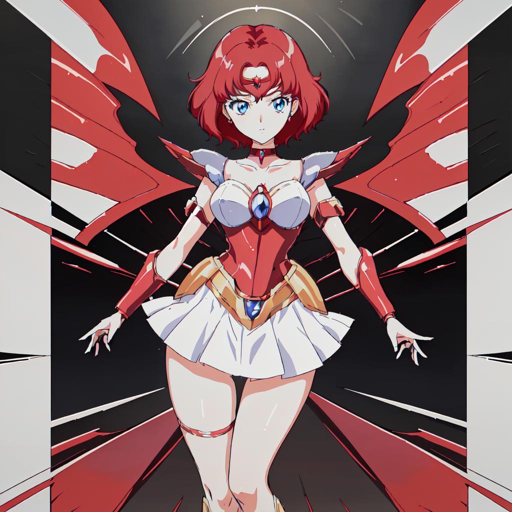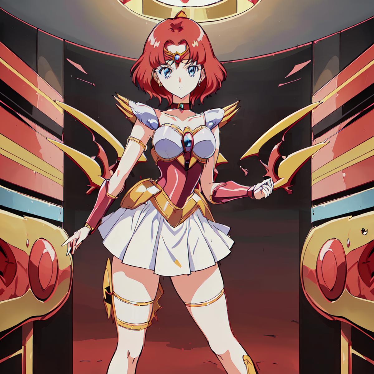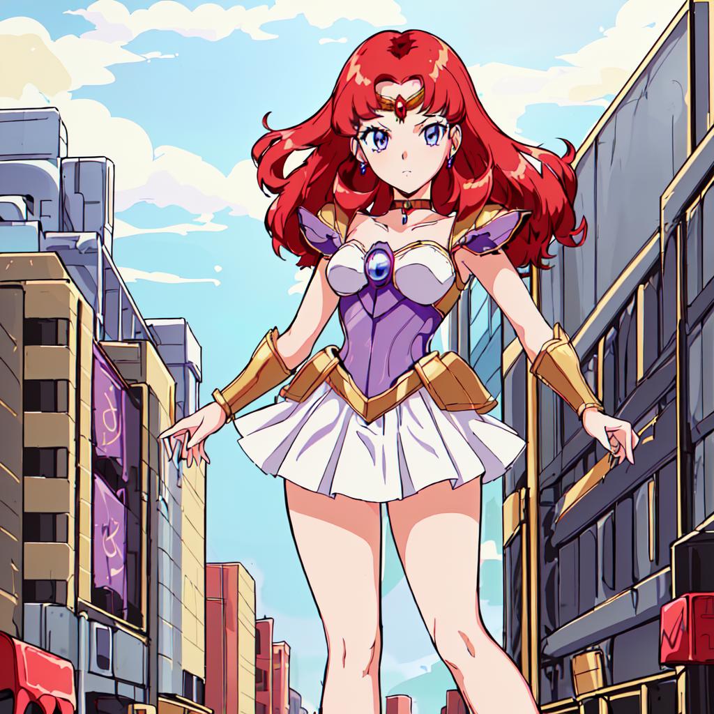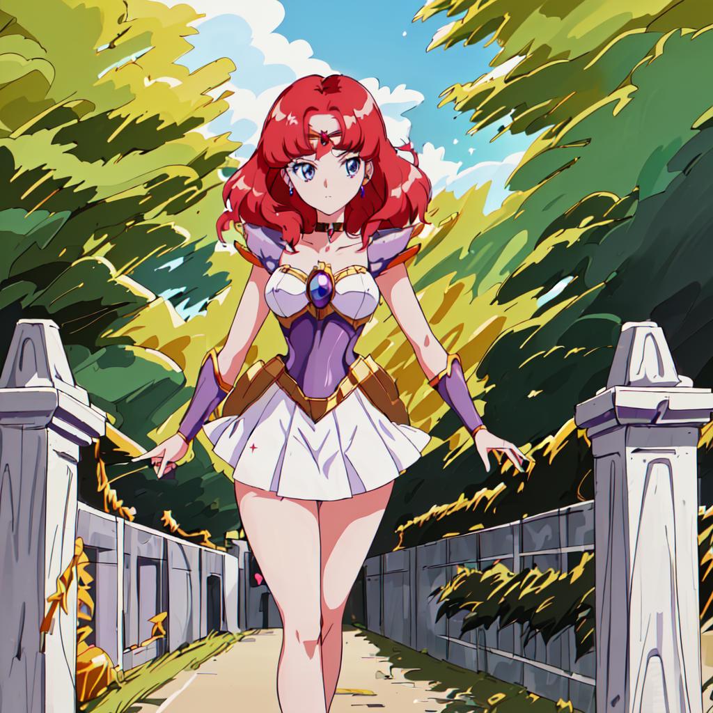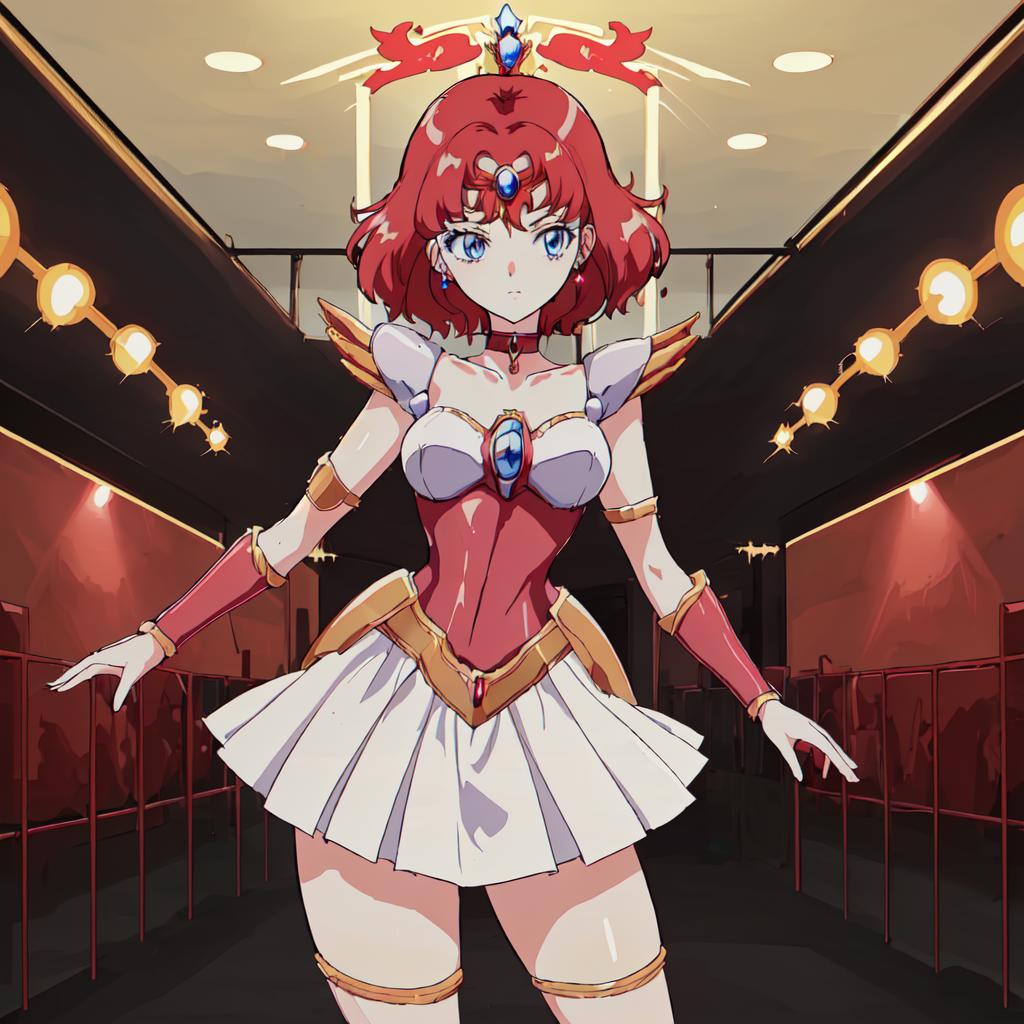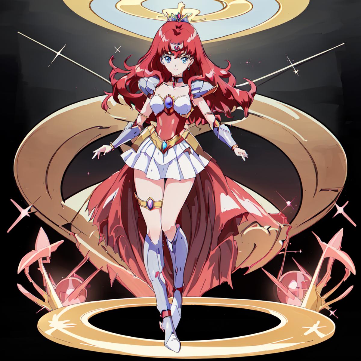 Scarlet_Ohara, 1girl, solo,blue eyes,jewelry, red hair, choker, miniskirt, white skirt,armor, high heels, white skirt, shoulder armor, pauldrons, purple thighlet, forehead,gold guntlet,gold tiara