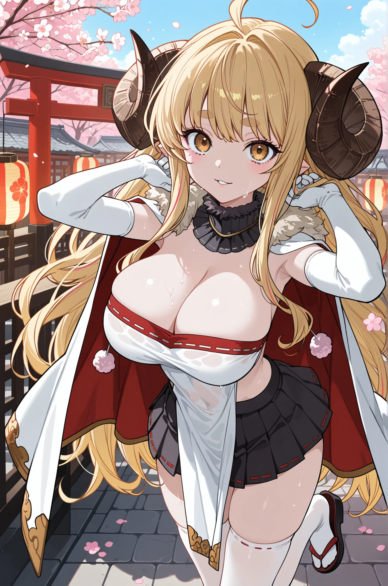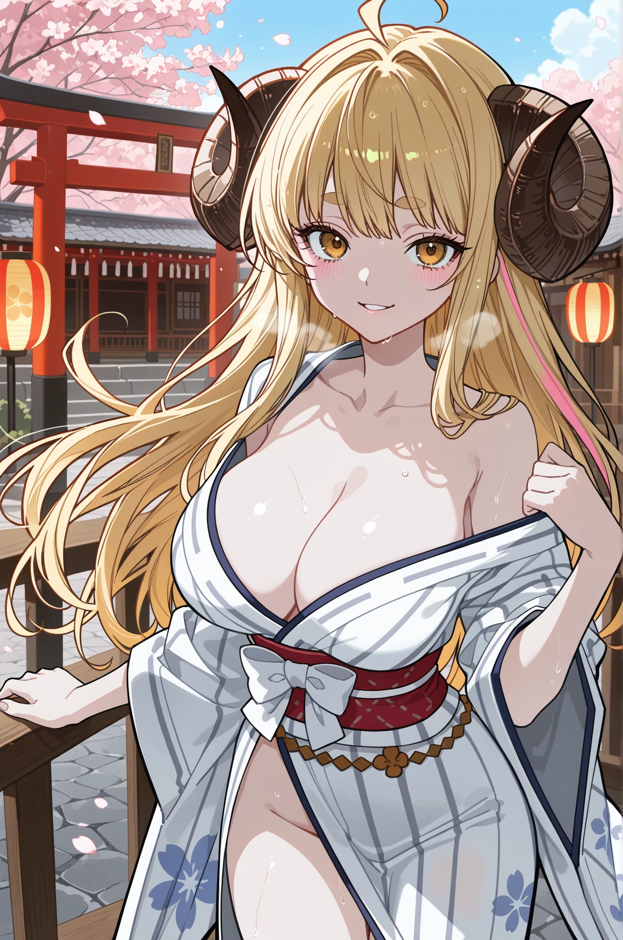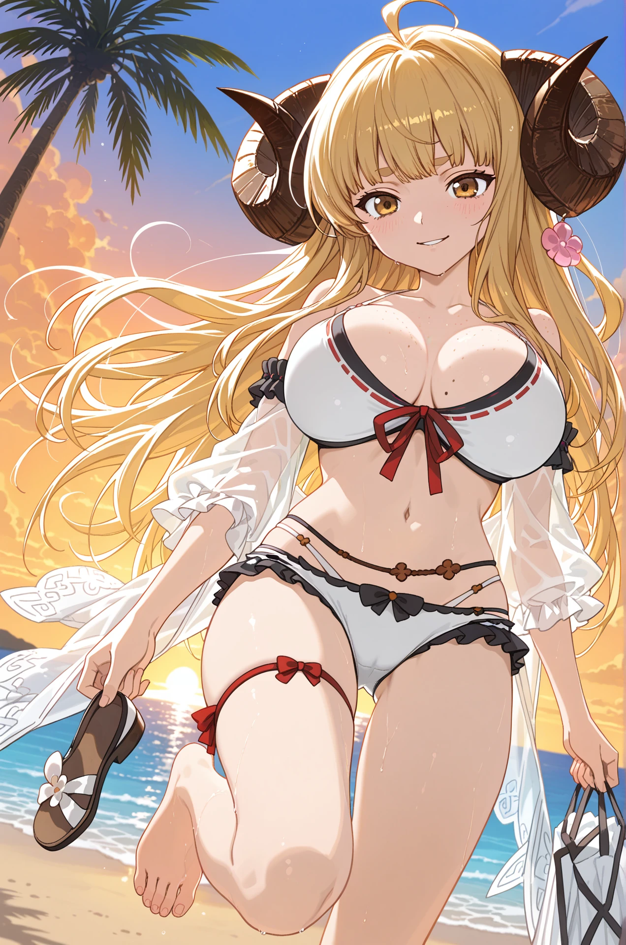 AnilaSummer-DL,1girl, blonde hair, long hair, bangs, blunt bangs, ahoge, sidelocks, yellow eyes, thick eyebrows, large breasts, draph, horns, sheep horns, curled horns,