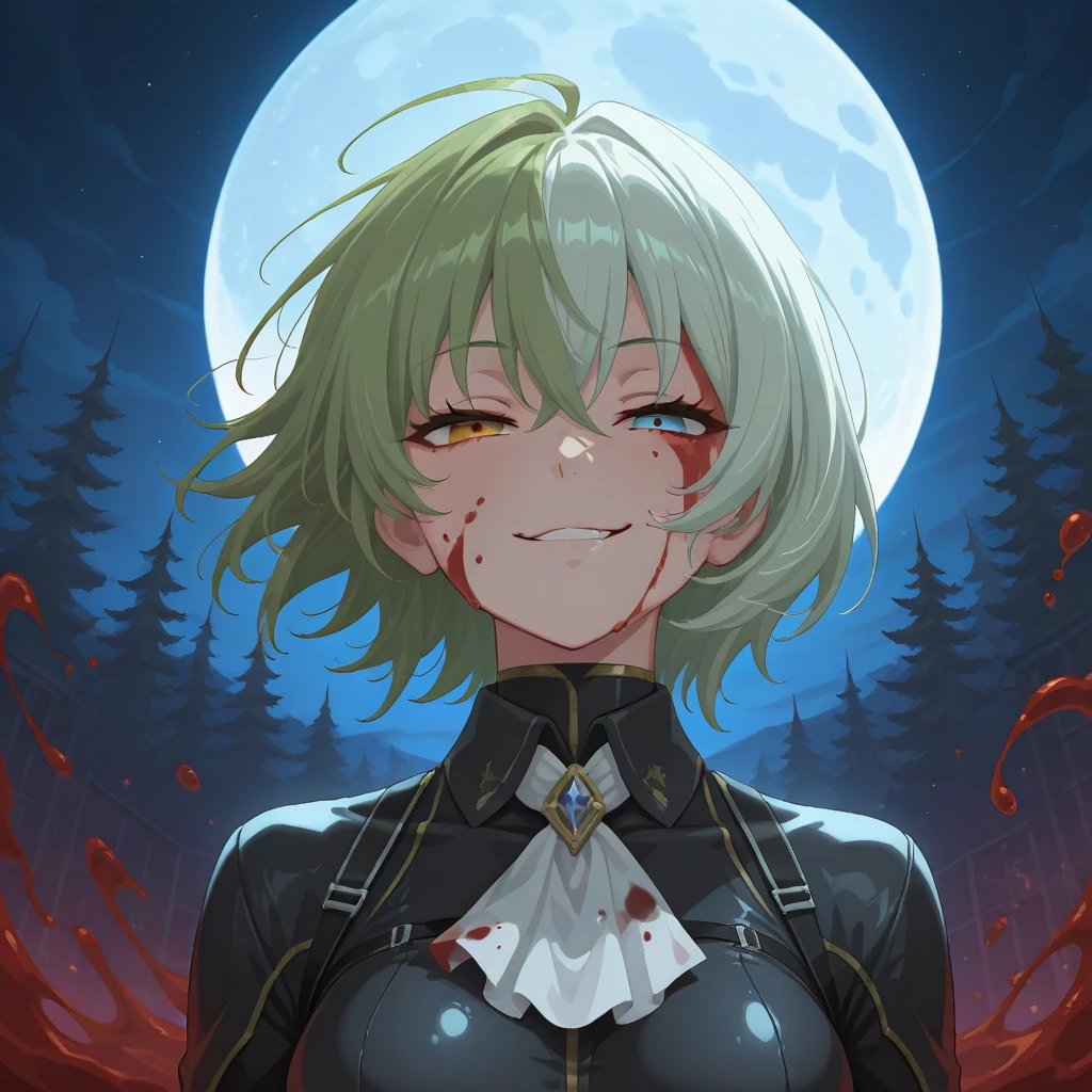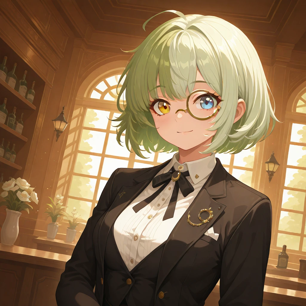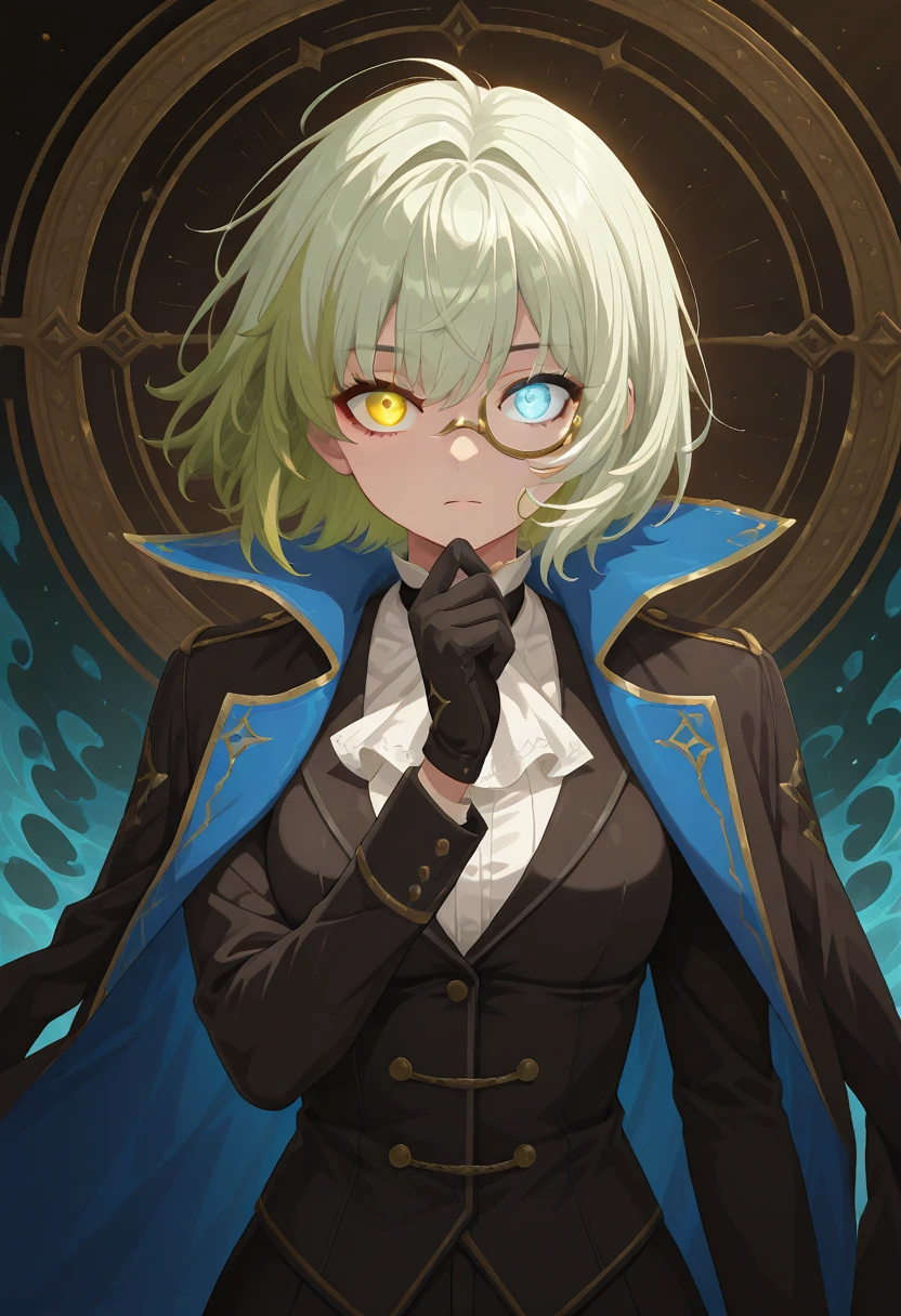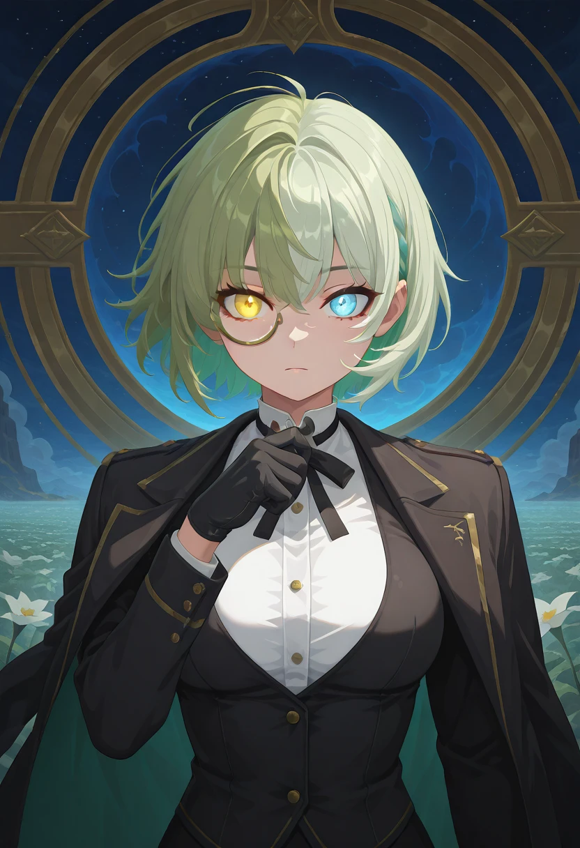 sn-tsisyphus, 1girl, short hair, split-color hair, green-white hair, heterochromia, blue-brown eyes,