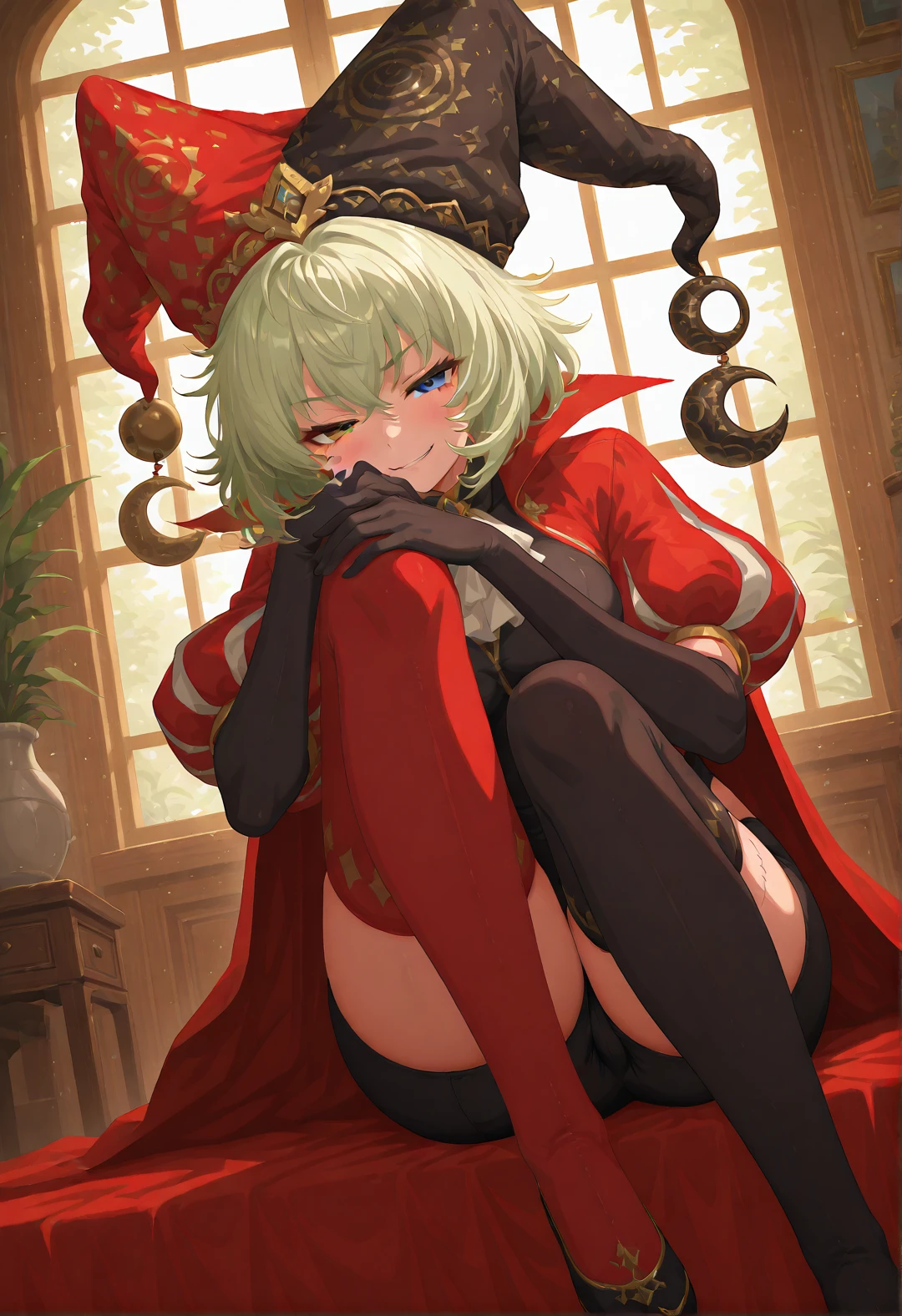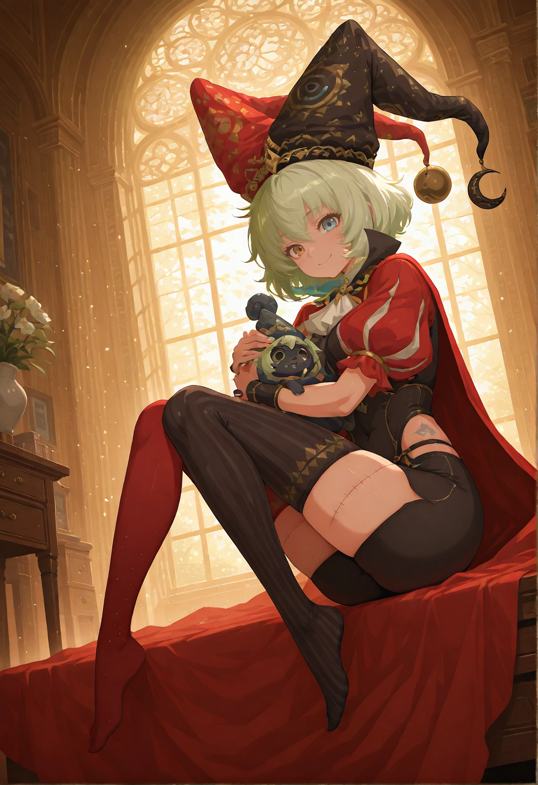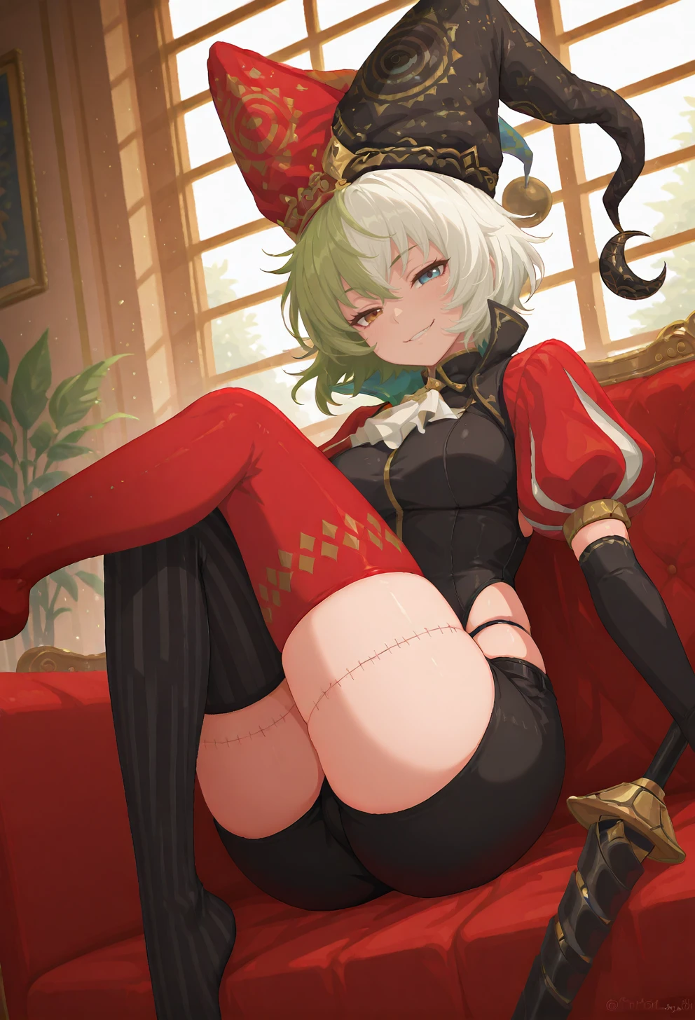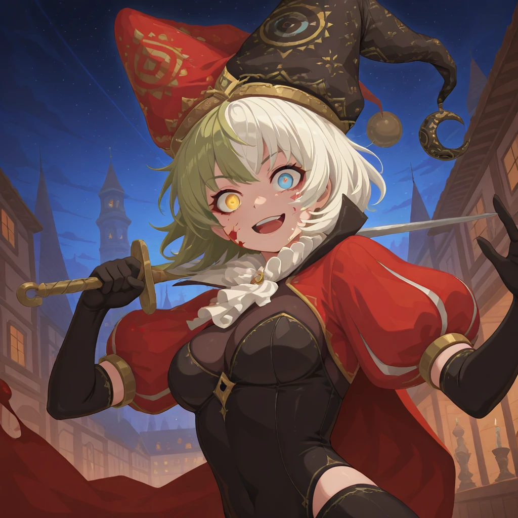alternate costume, red cape,white_ascot, collared_short_bodysuit, zettai ryouiki,redpuff sleeves,stitched_leg,asymmetrical socks, red socks, black vertical-striped socks,black_spiral sword,