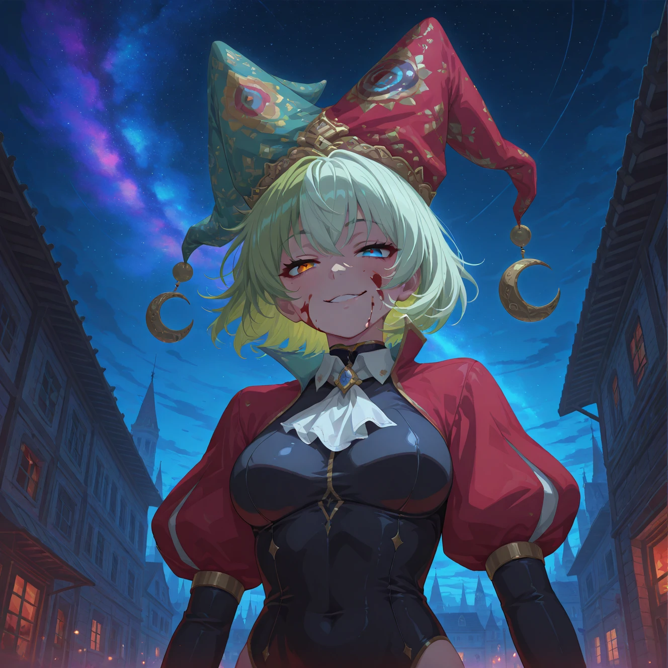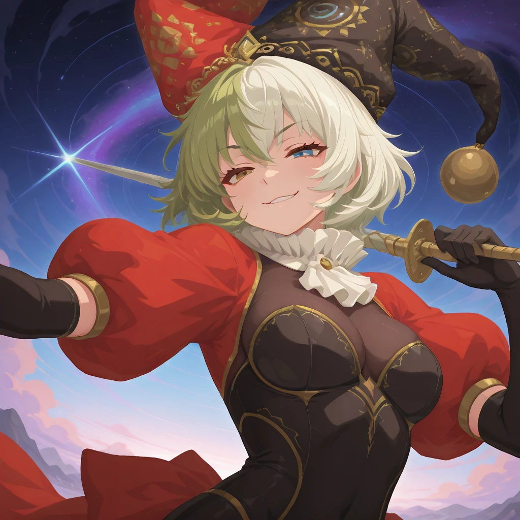 sn-trickster, 1girl, long_sidelocks, split-color hair, brown-white hair, heterochromia, brown-blue eyes, no headwear,