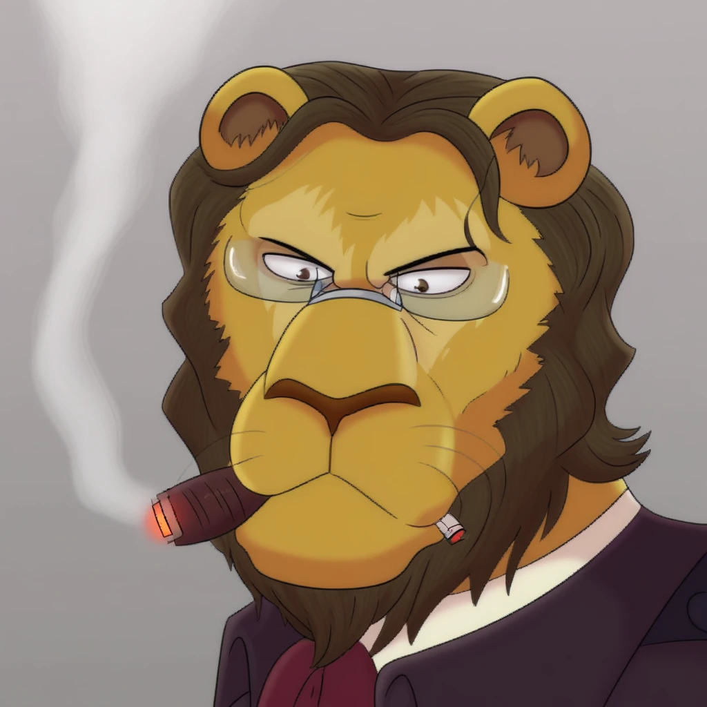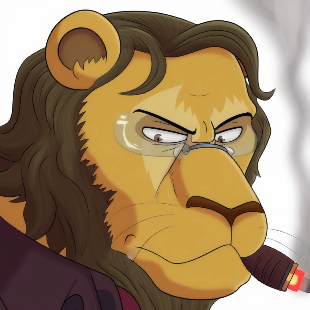 chief lion, beastars, HD, head, smoke, cigar, transparent glass, head shot, identical face, 2D, furry, brown manes,