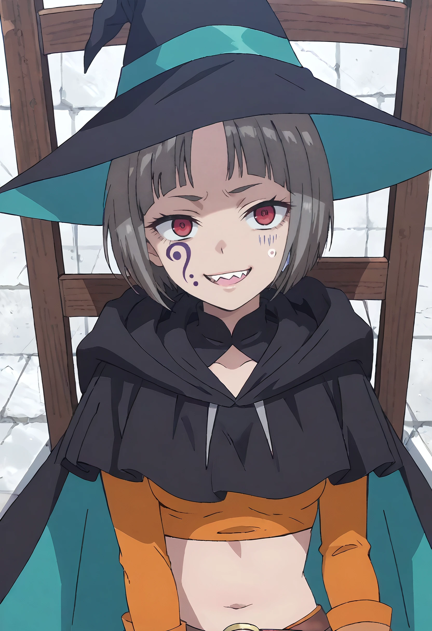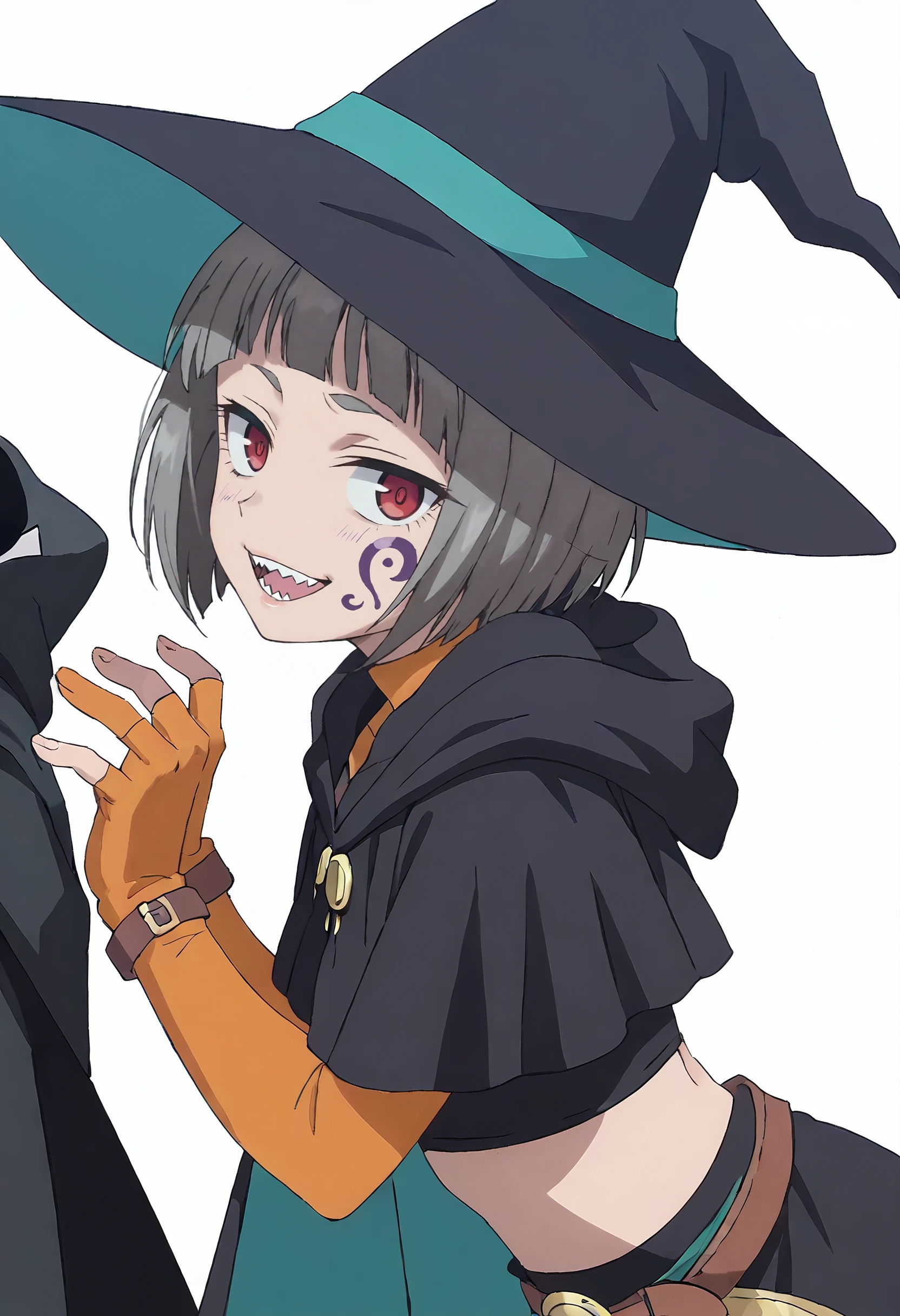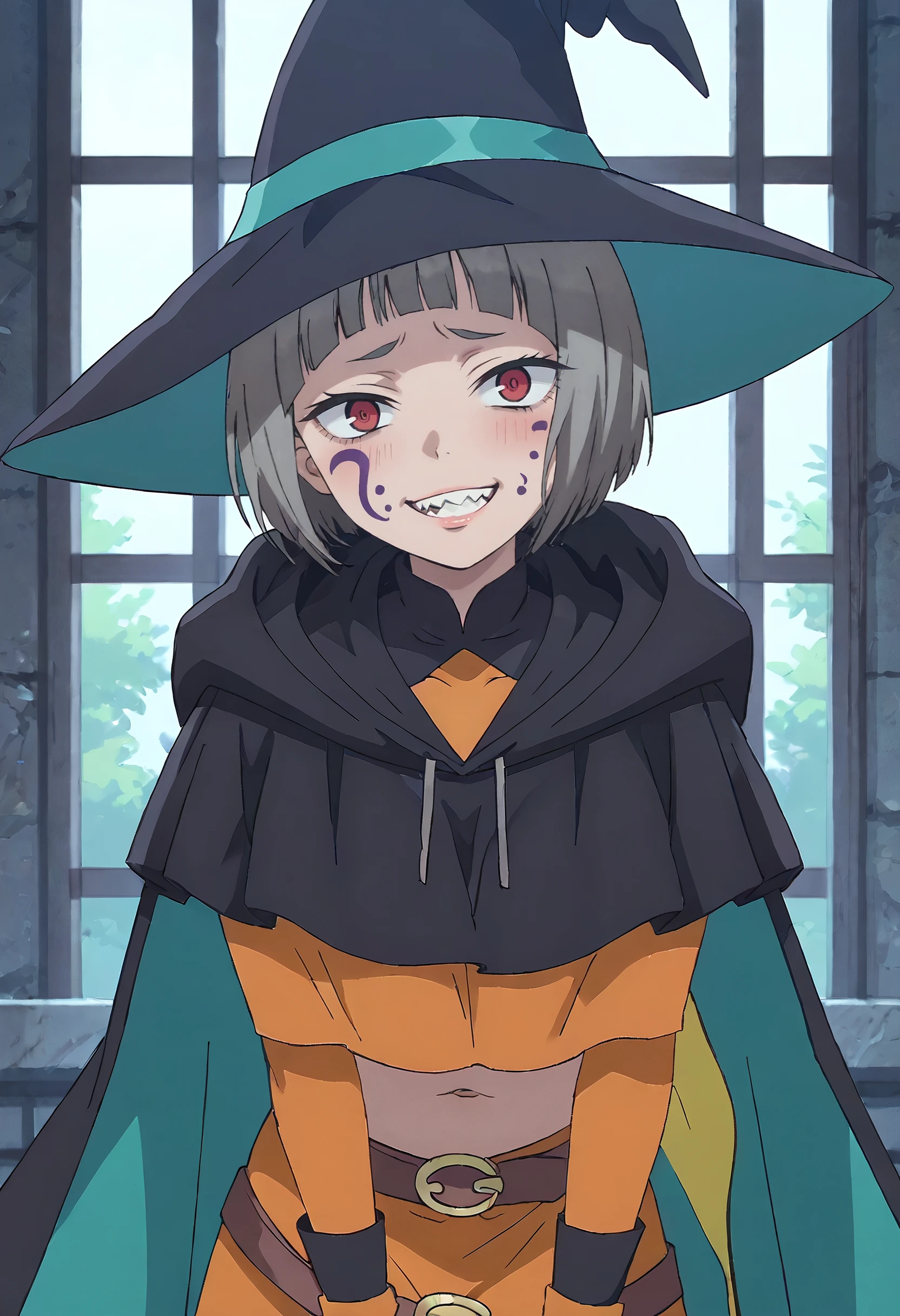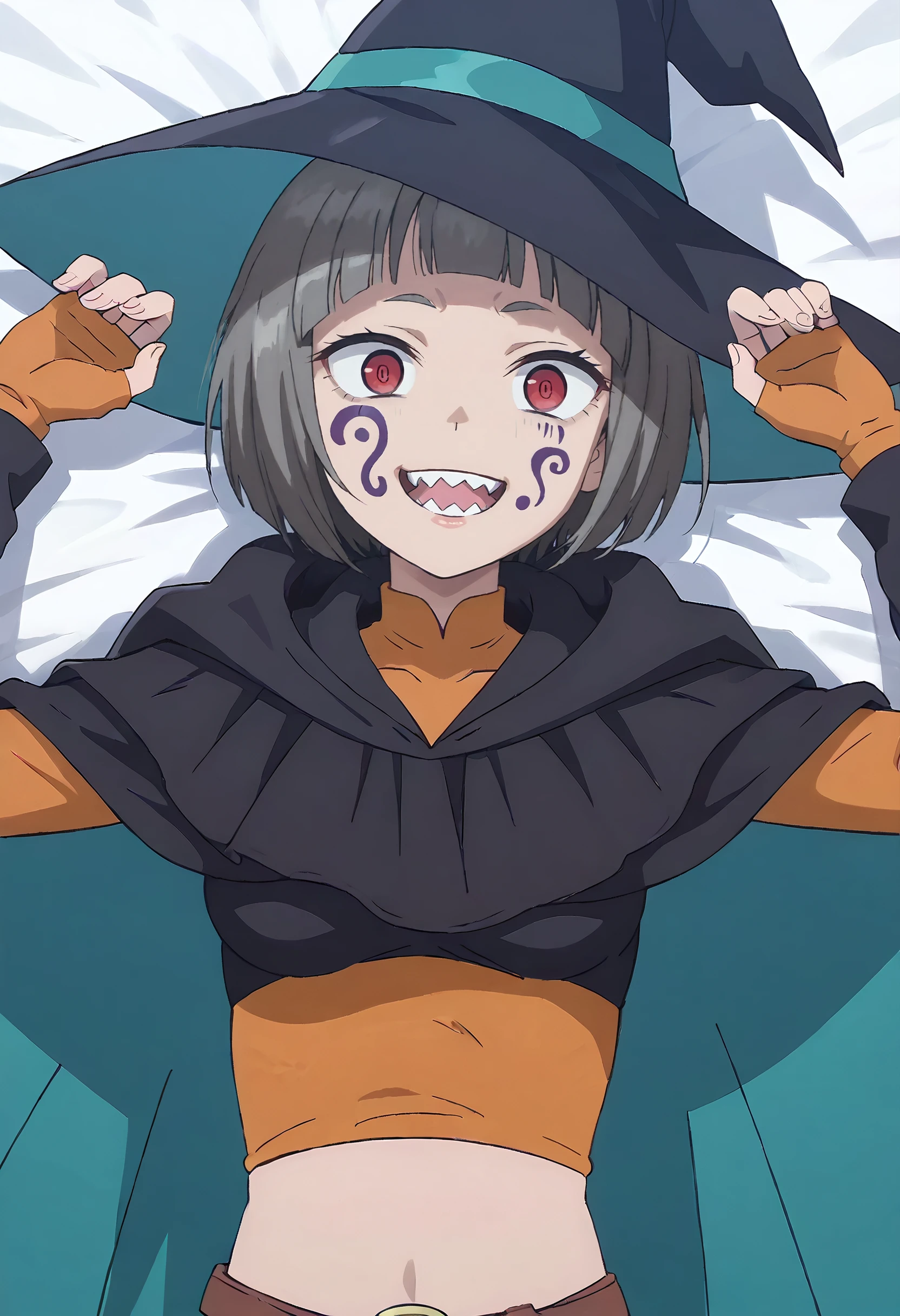 MOKGuriligula, short hair, facial mark, black hair, blunt bangs, red eyes, bob cut, blank eyes, no pupils, sharp teeth, facepaint, fangs, facial tattoo,