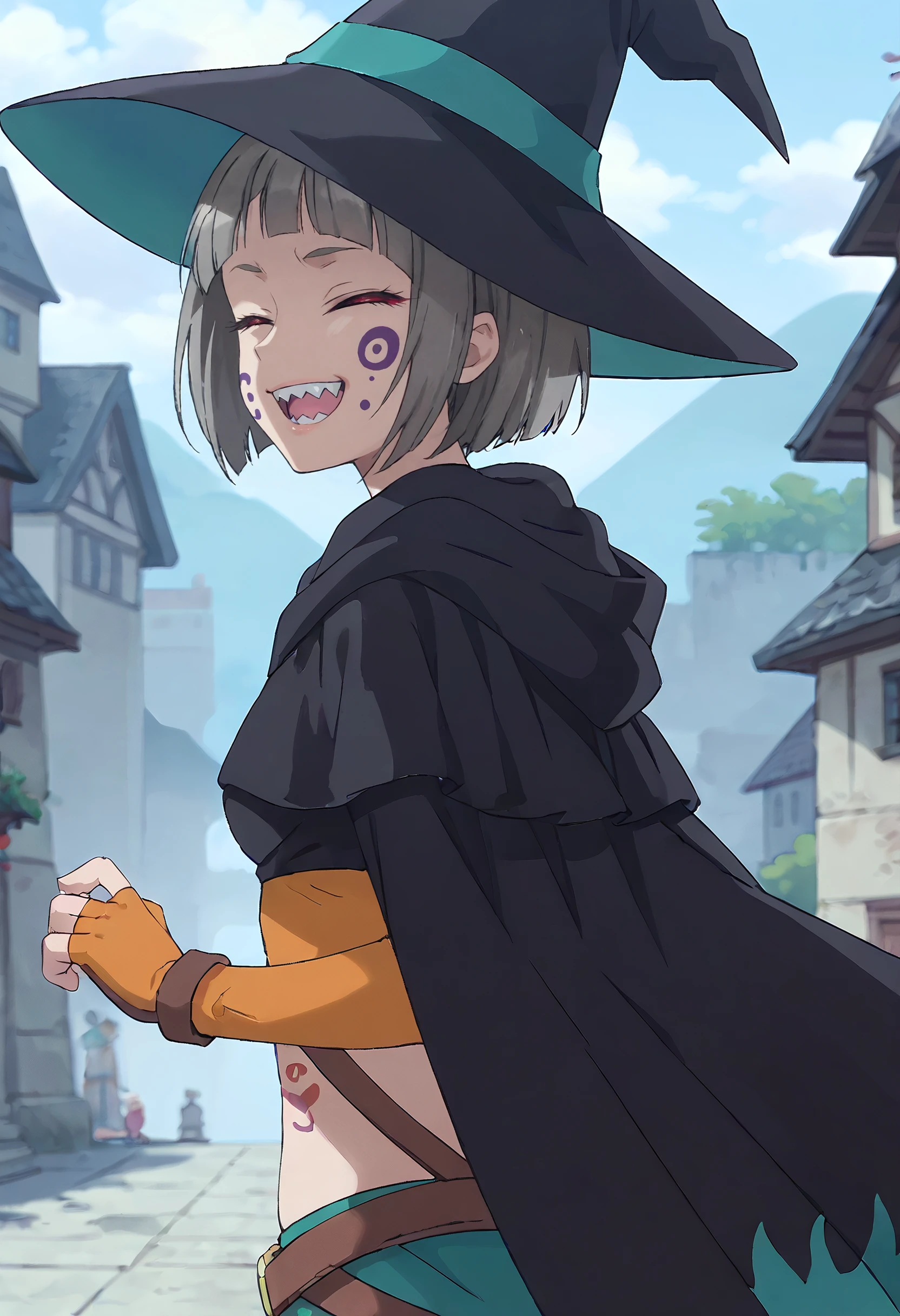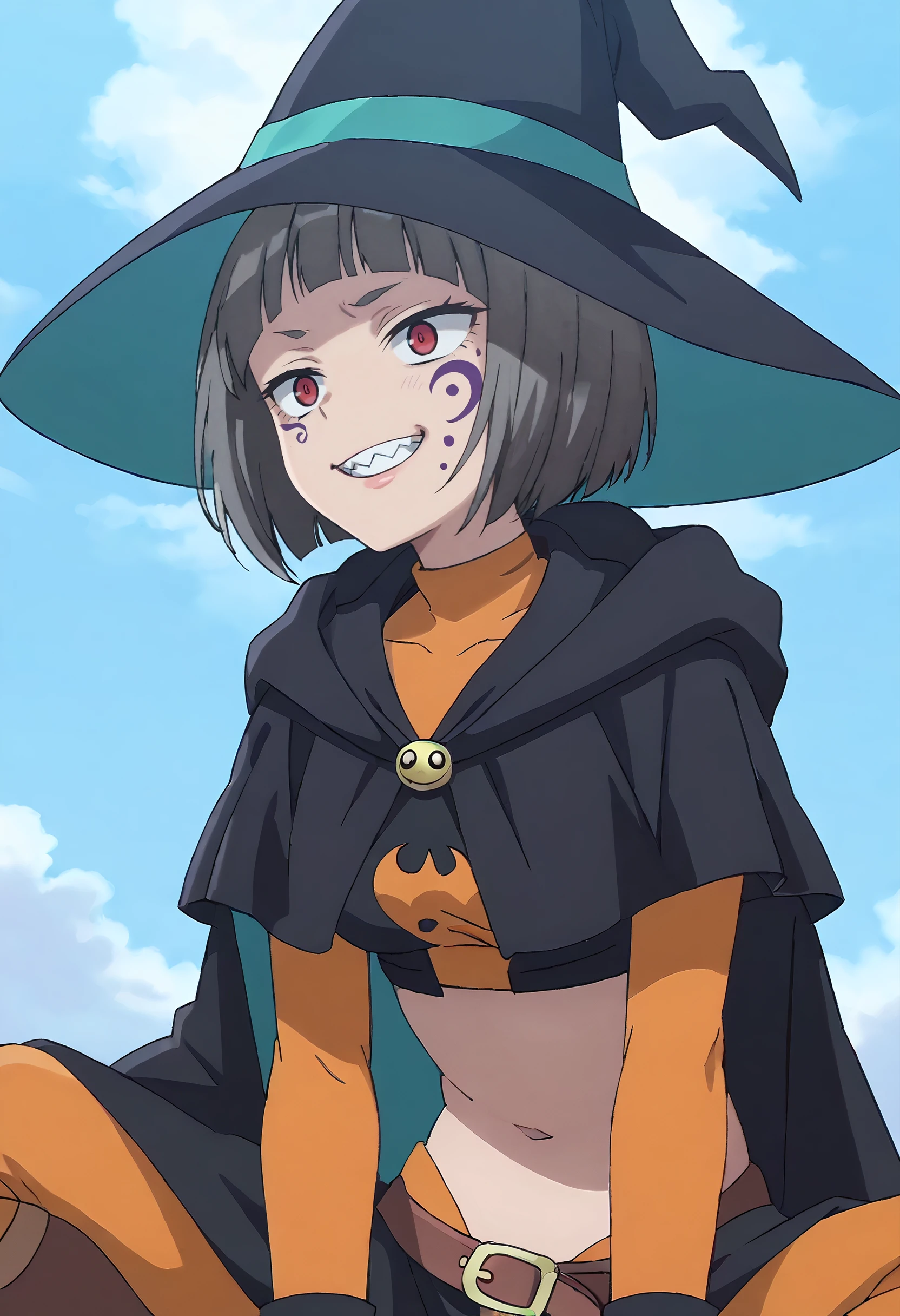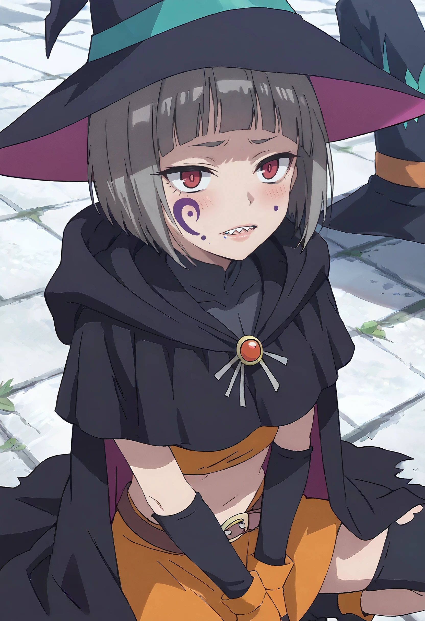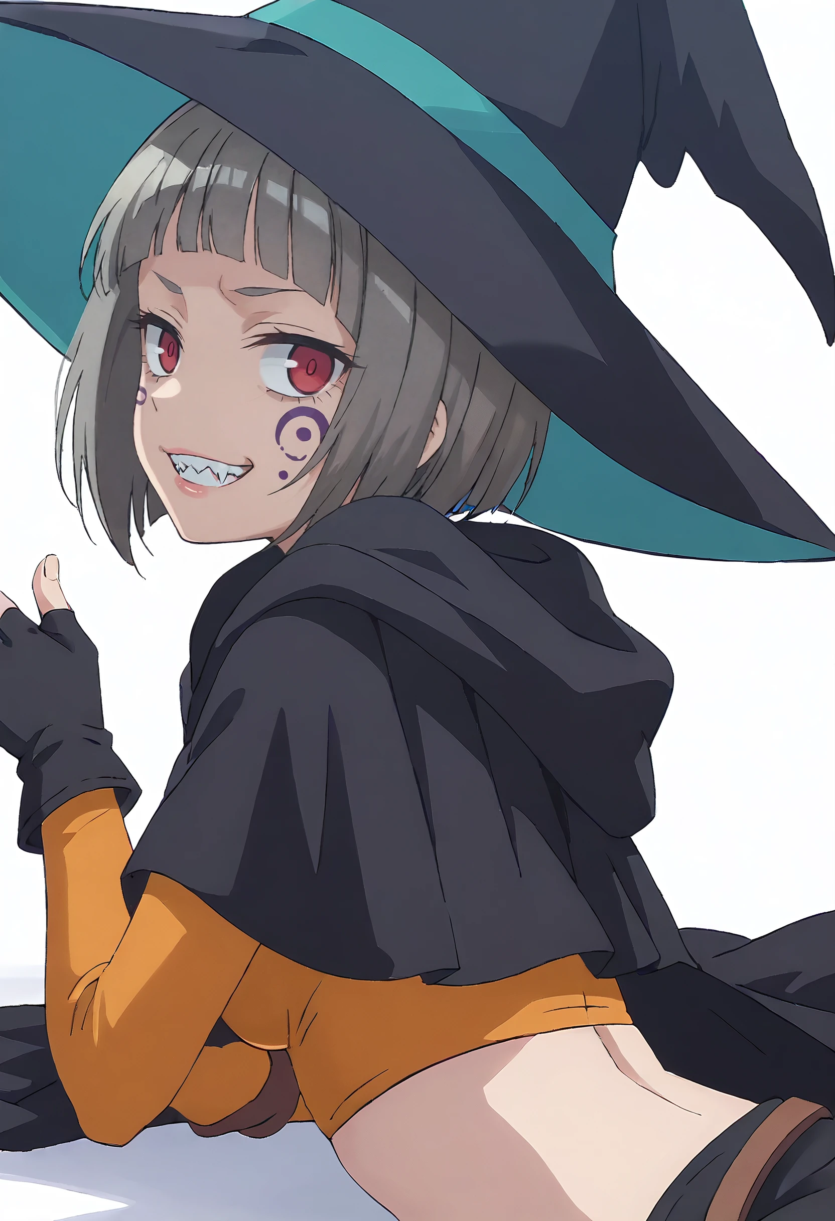 MOKGuriligula, short hair, facial mark, black hair, blunt bangs, red eyes, bob cut, blank eyes, no pupils, sharp teeth, facepaint, fangs, facial tattoo,